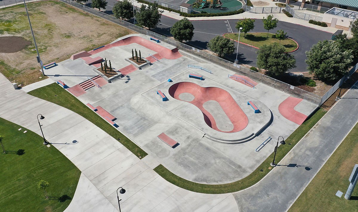 Tustin skatepark is a concrete park featuring a bowl and street area, built by in 2020. After hosting a public design workshop that provided key insights from the skateboard community, SpohnRanch skateparks created a modern skatepark design that balances street and transition. A bowl anchors the center of the space and is elevated from the street section to create a bit of traffic control. Surrounding the bowl is a rail paradise. The skatepark design also features a skateable eagle sculpture.