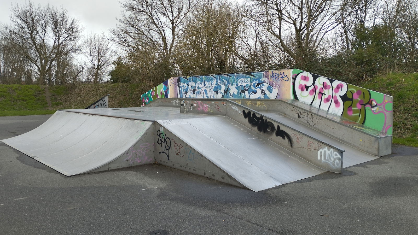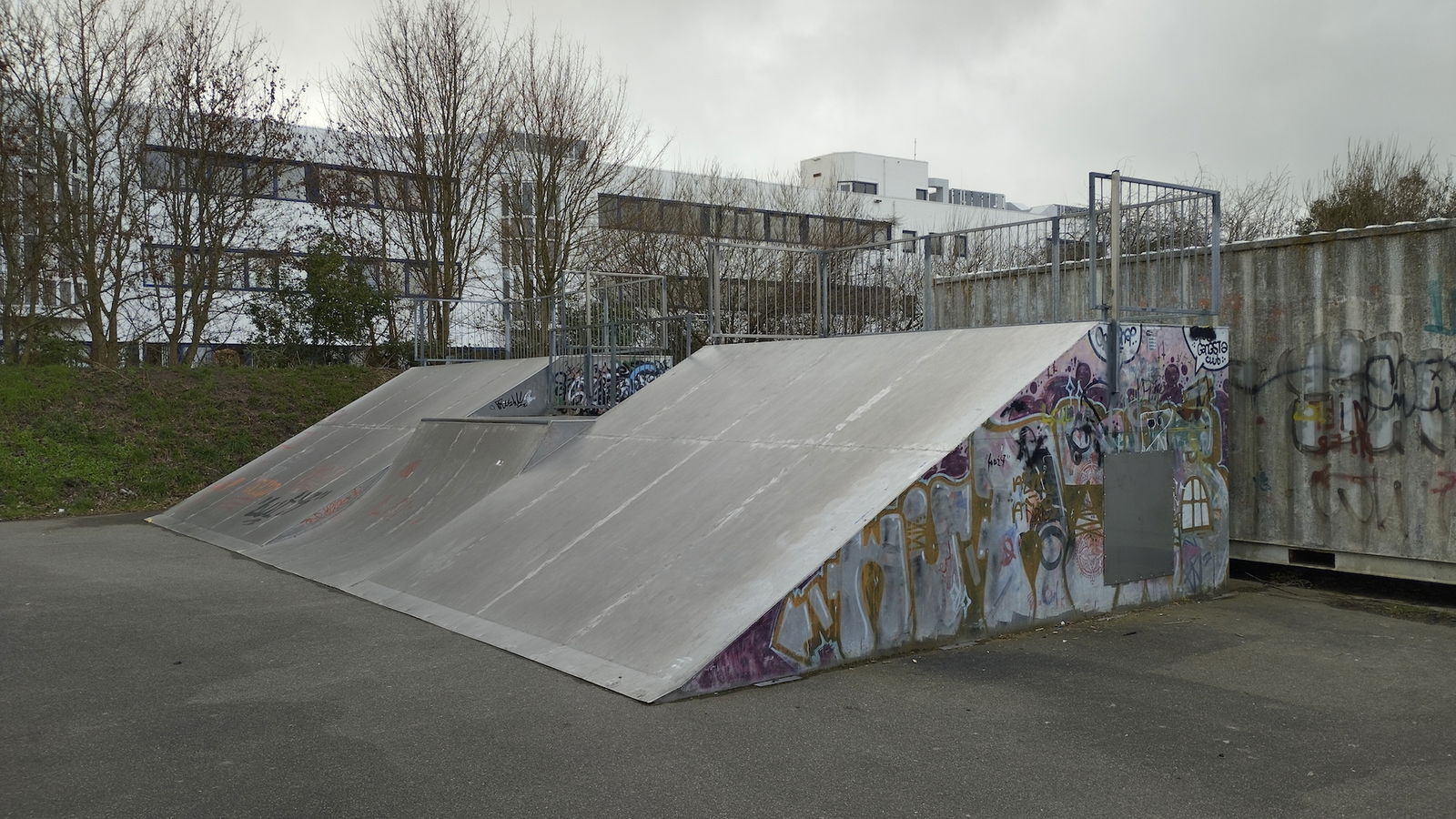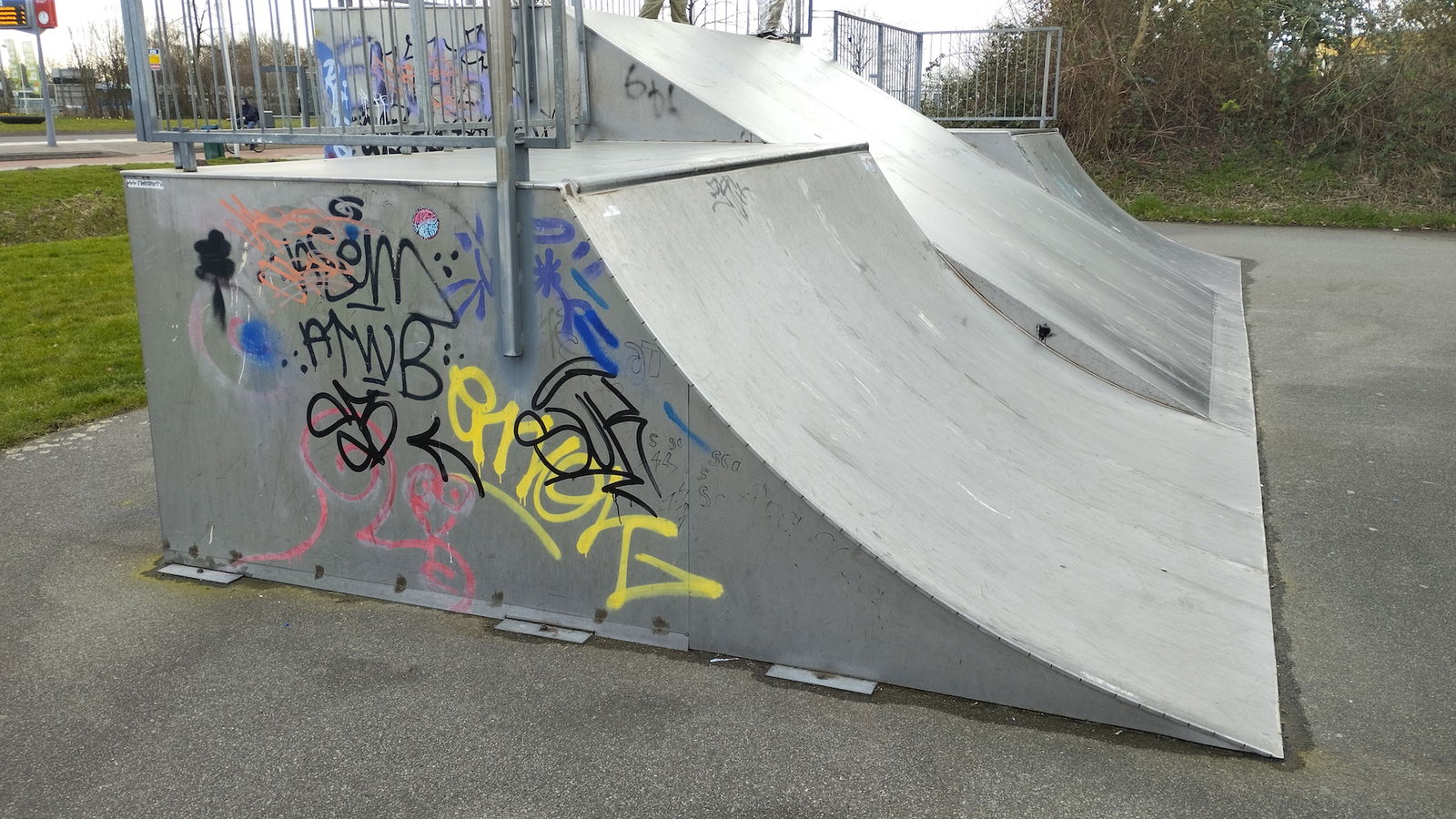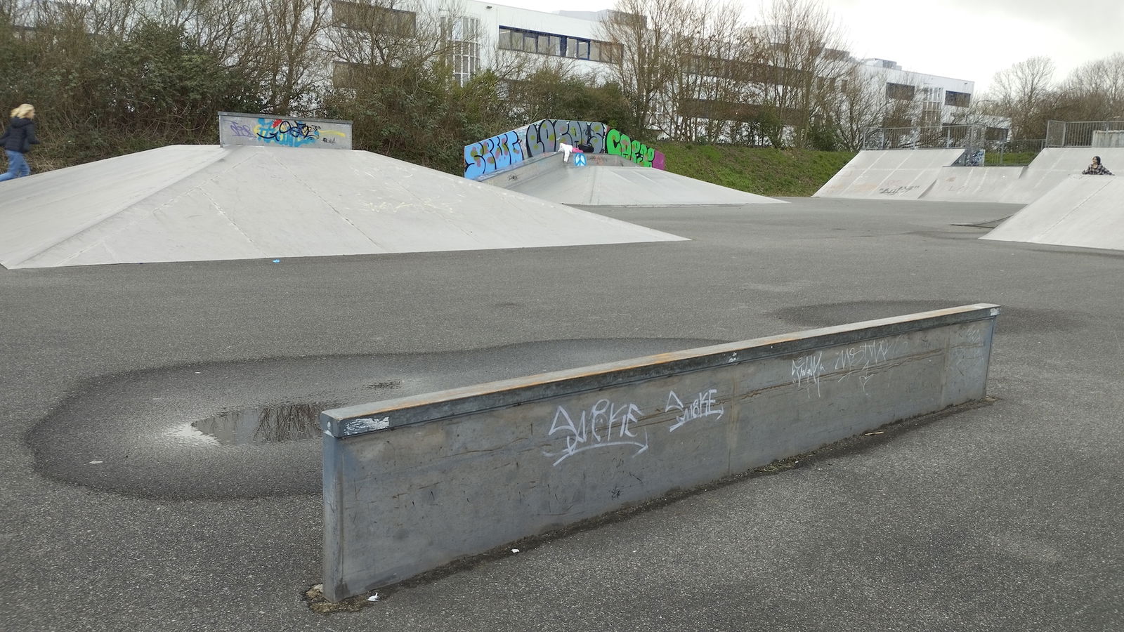 Metal skatepark with many different obstacles, is very slippery with a little rainfall.