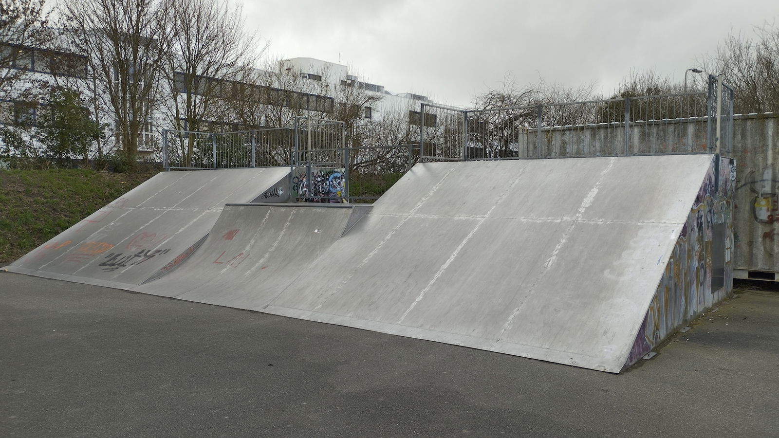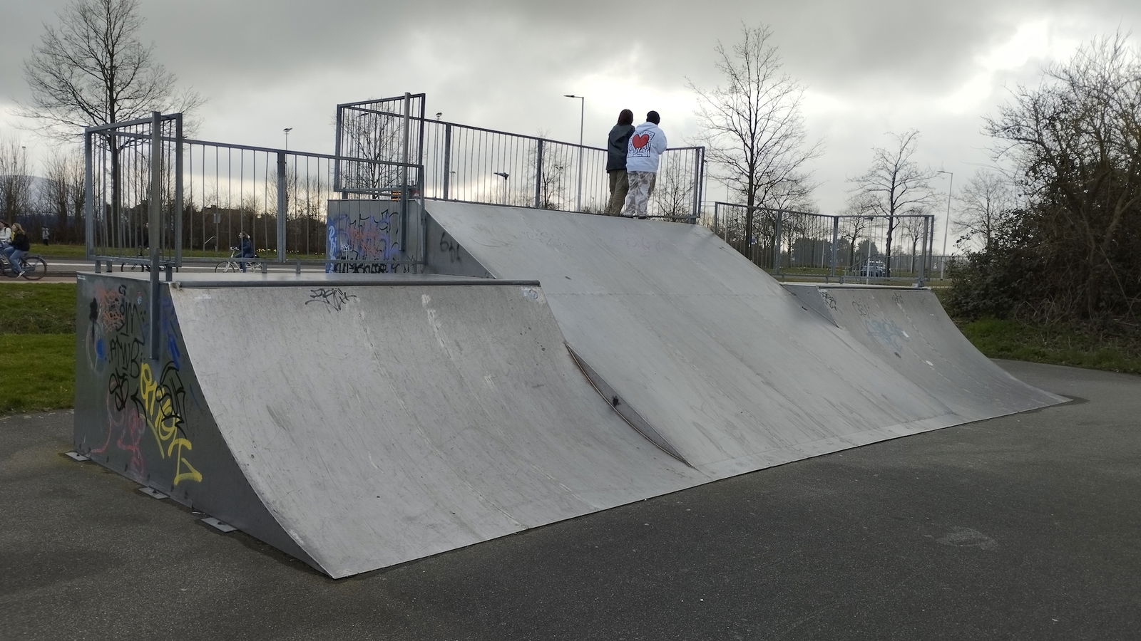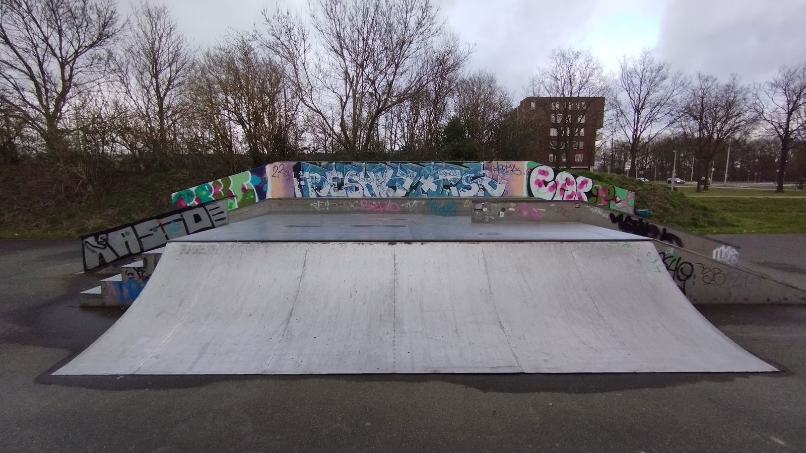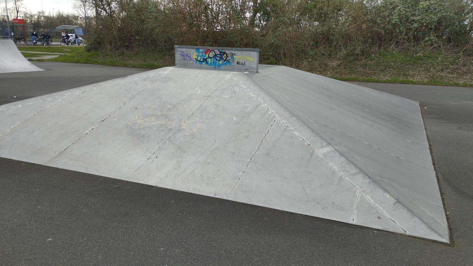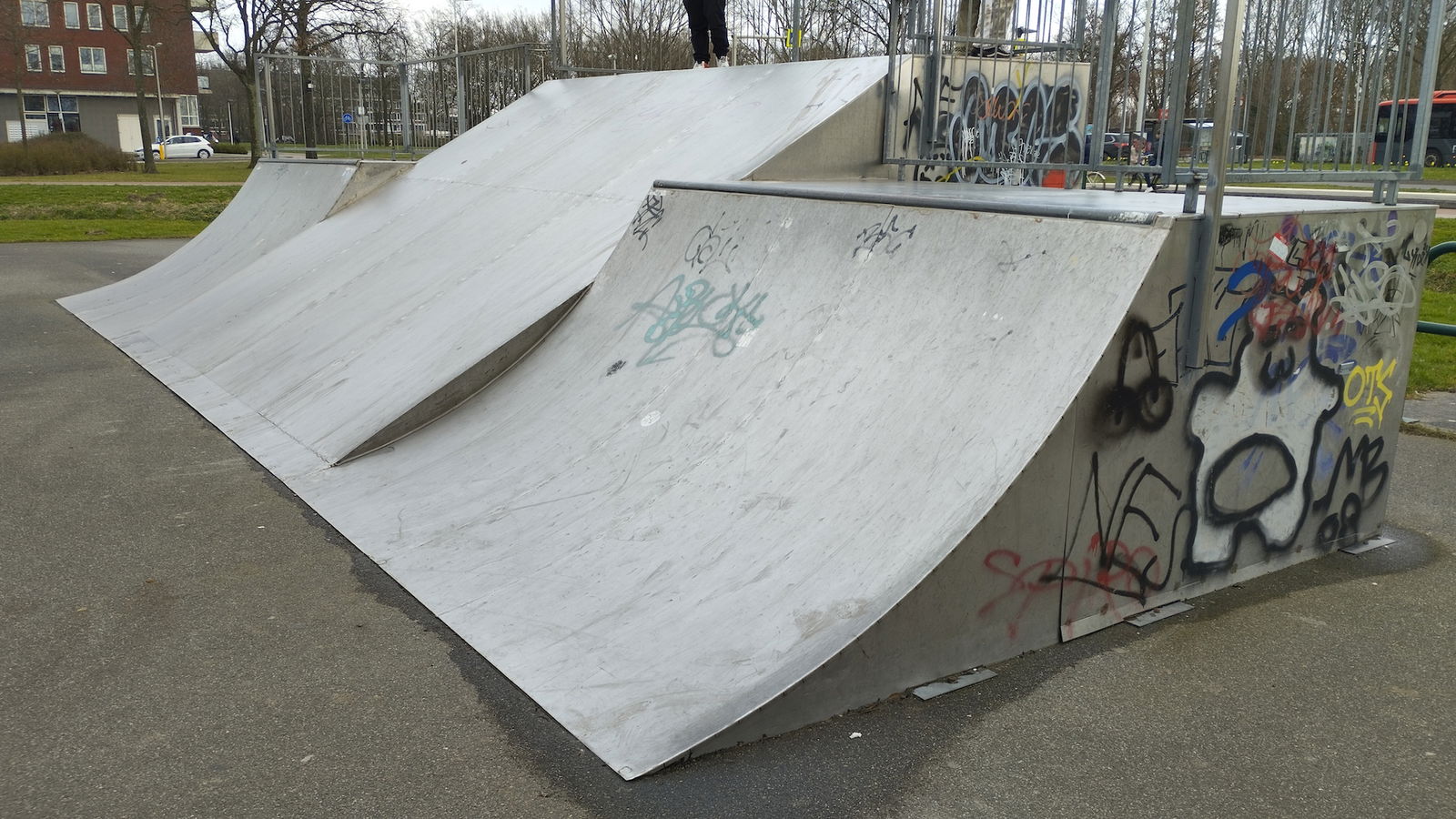 Metal skatepark with many different obstacles, is very slippery with a little rainfall.