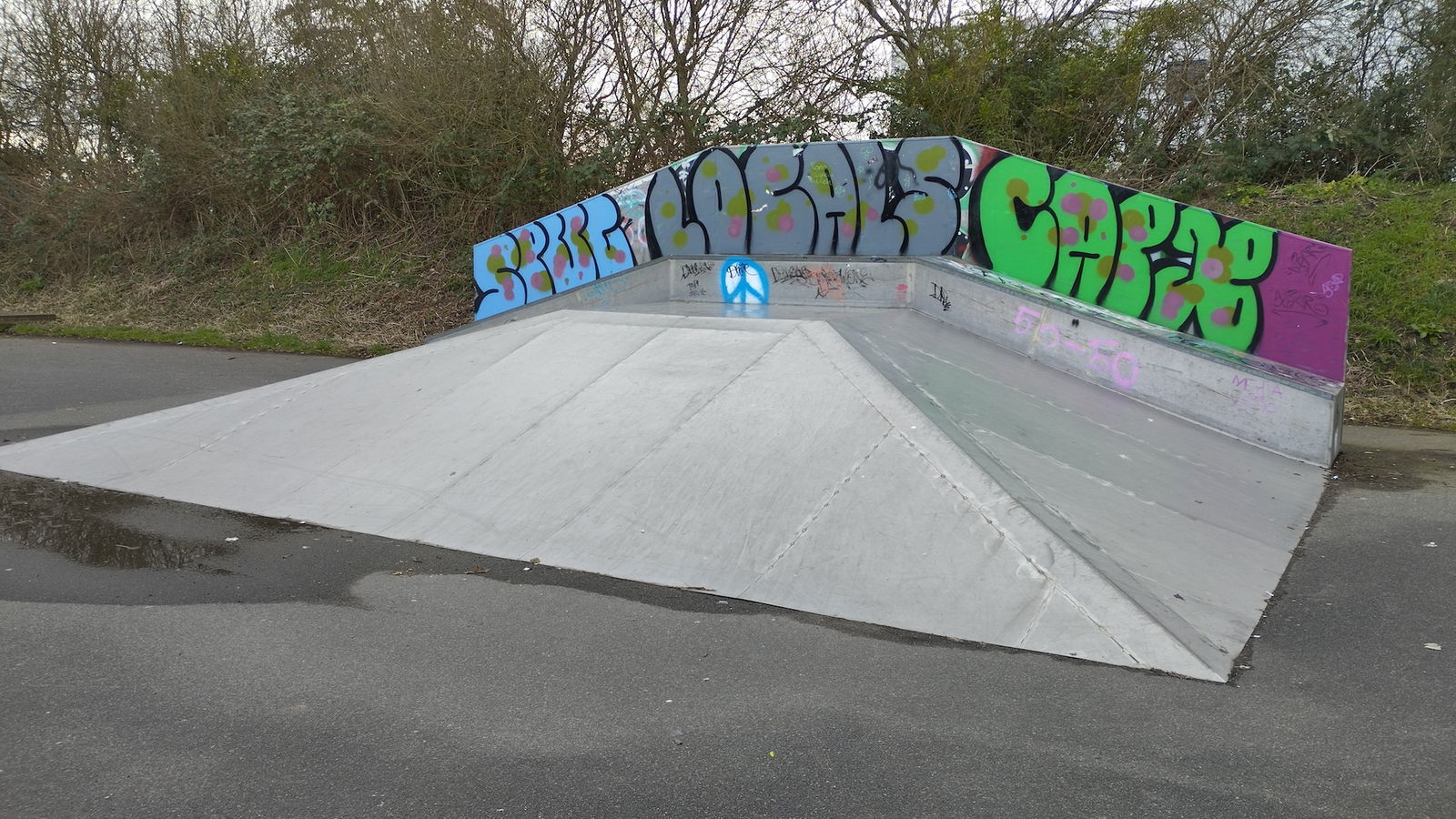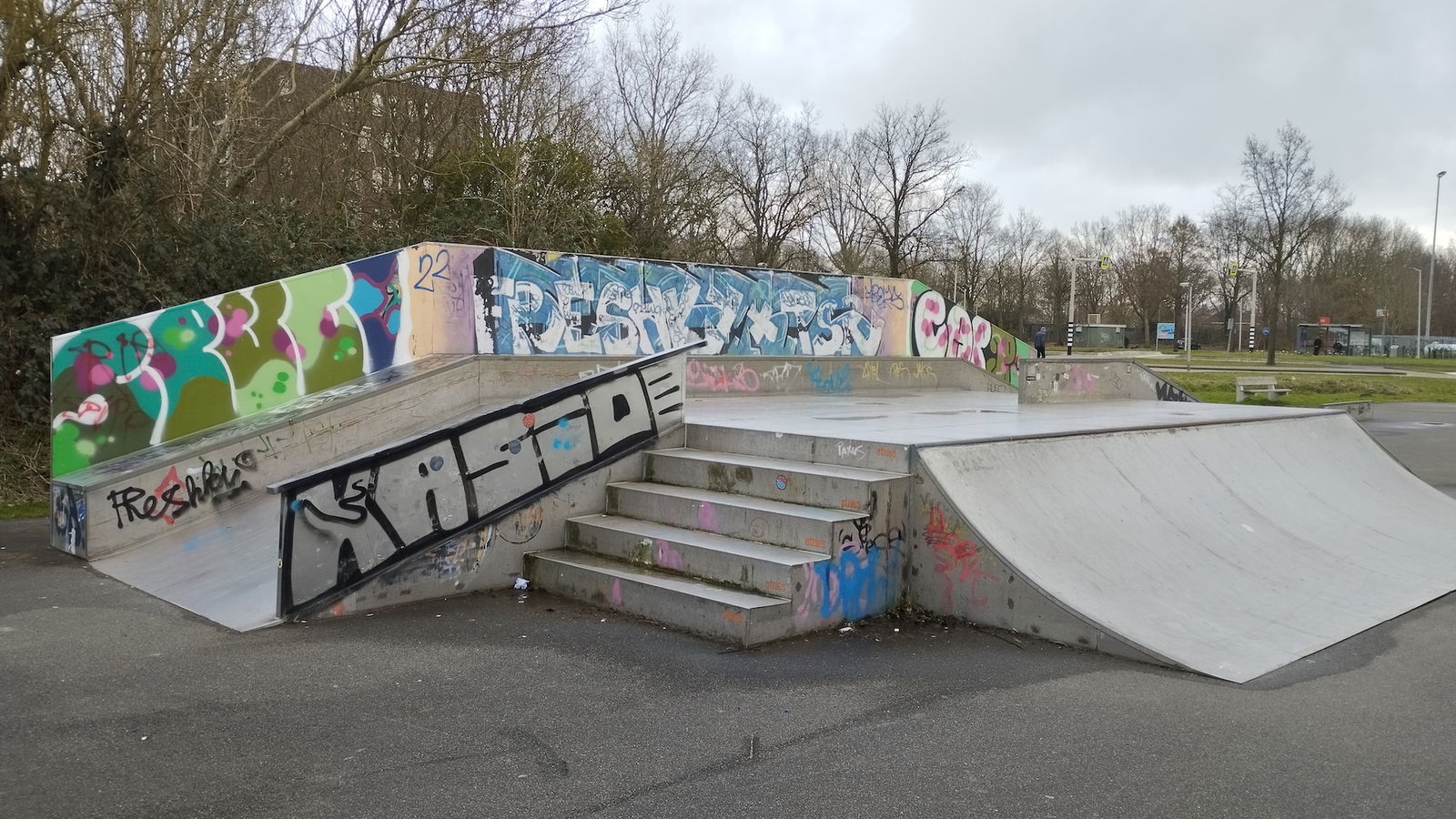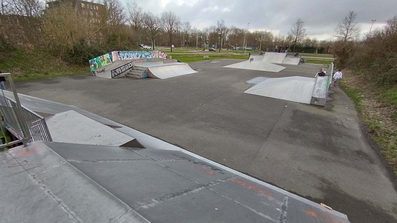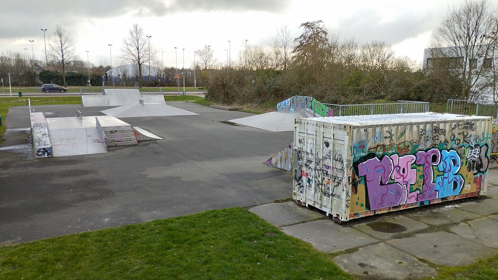 Metal skatepark with many different obstacles, is very slippery with a little rainfall.