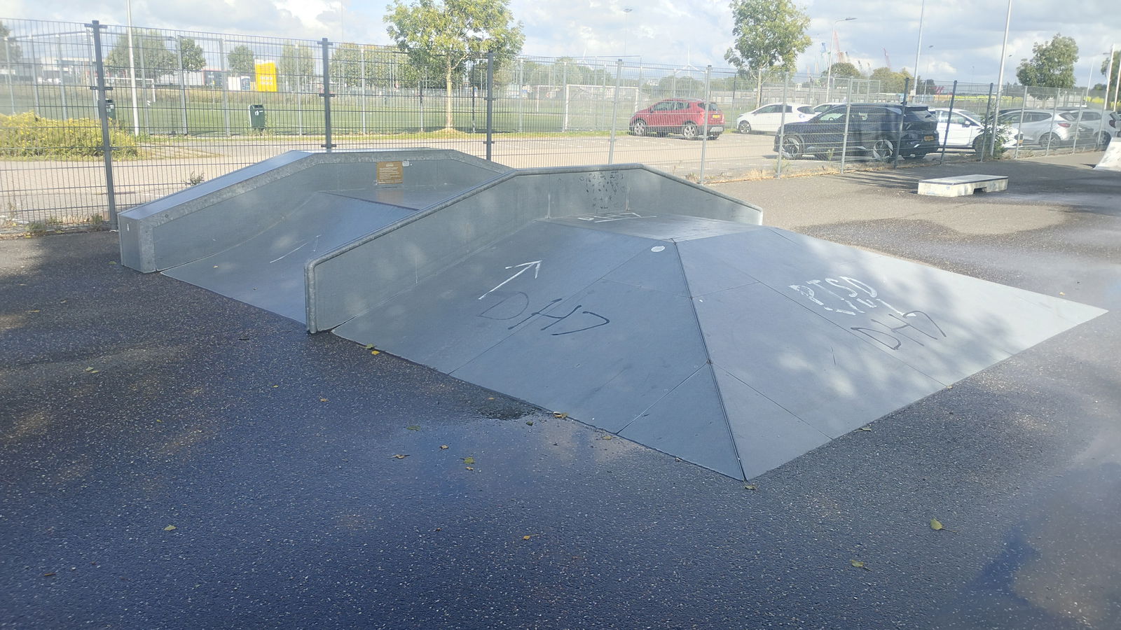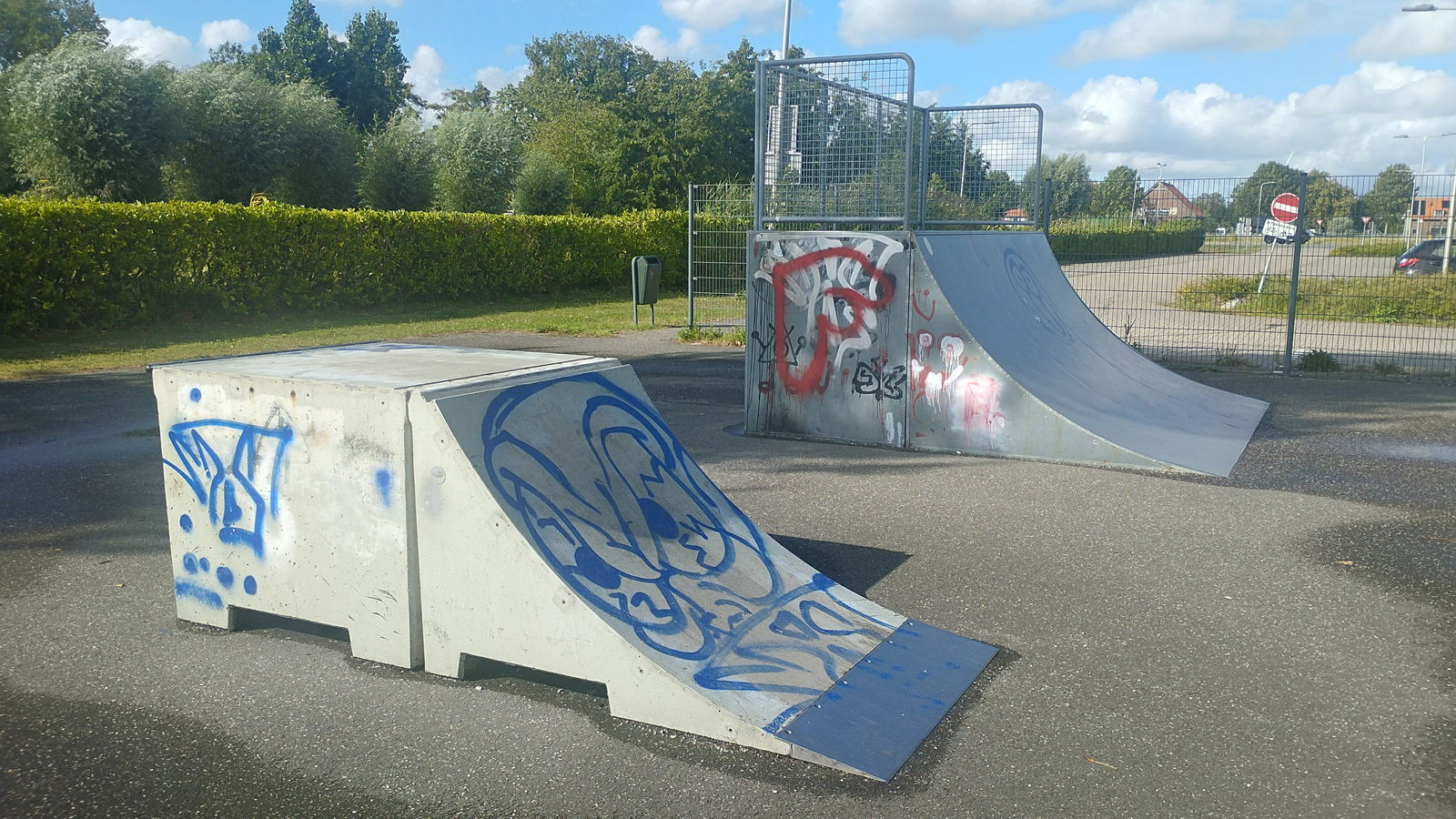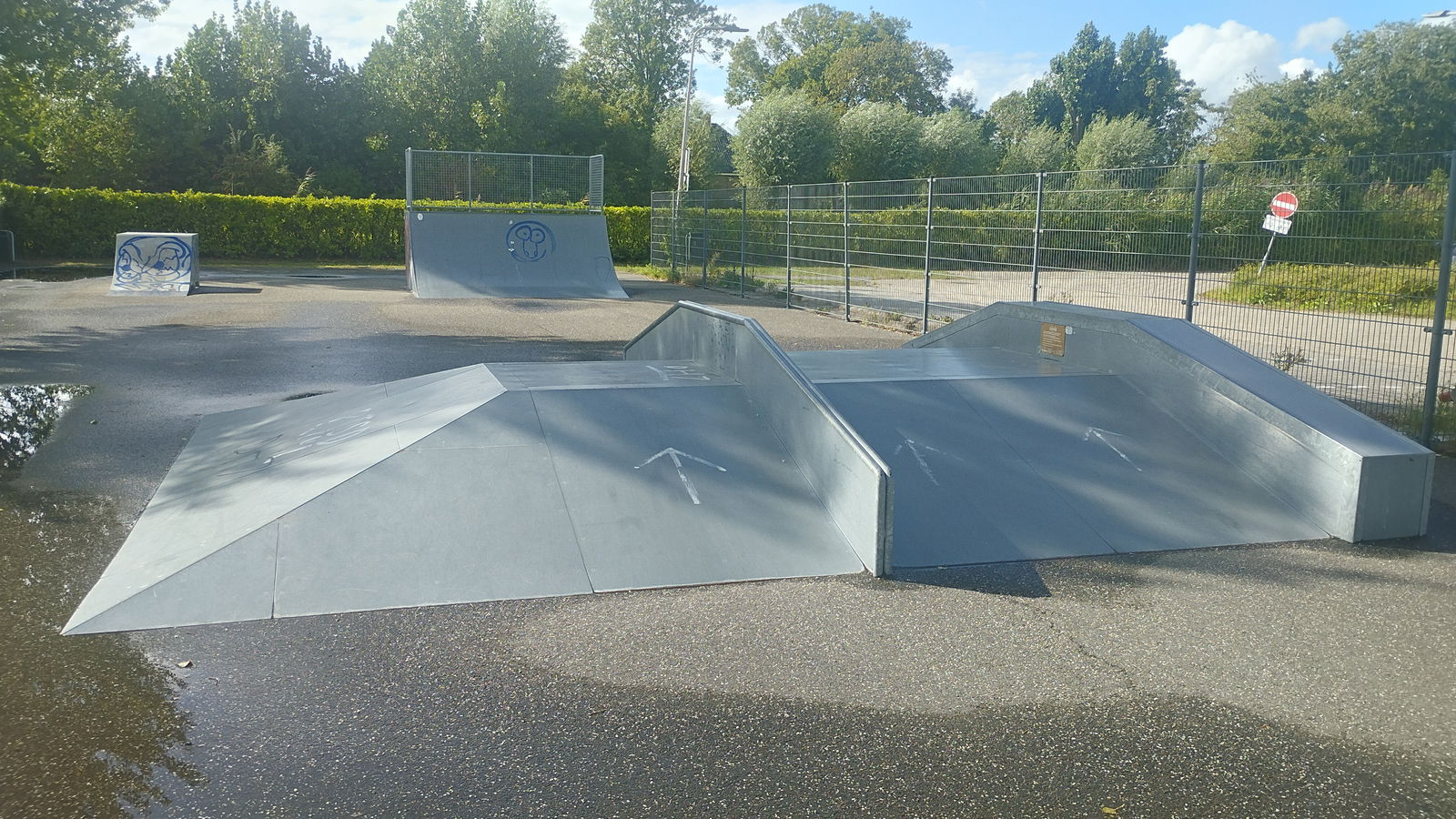 Vierpolders skatepark is made up of a back and forth run with a quarter pipe on either side of a funbox.