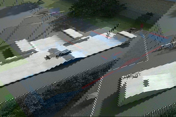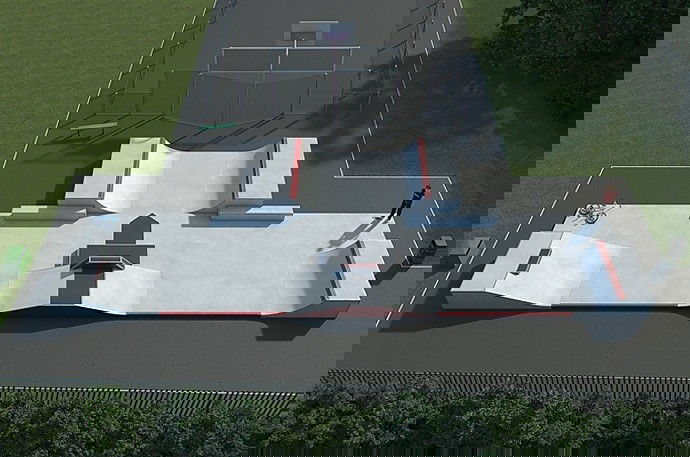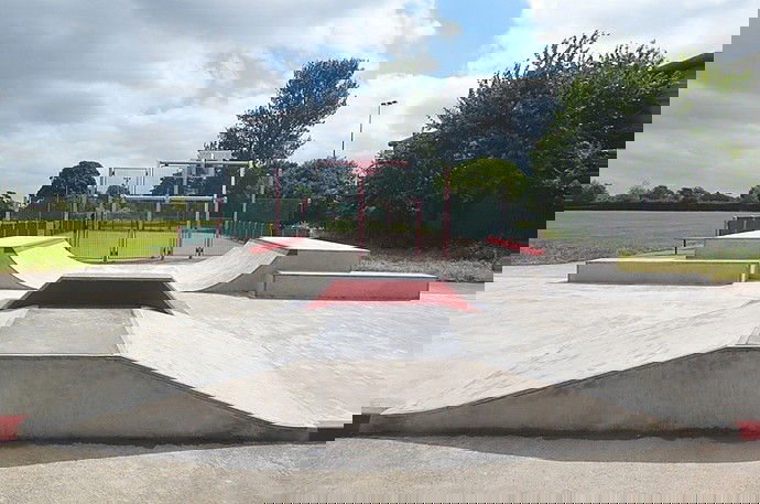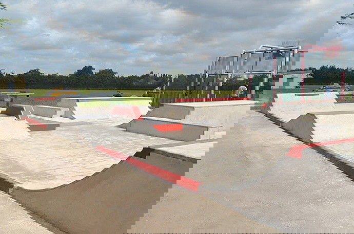 This outdoor concrete skatepark, constructed by Wheelscape, offers a variety of obstacles suitable for skaters of all levels. The design includes ramps, grind rails, and other features conducive to both street and transition skating. Open to the public year-round, free of charge. Located within a recreational field, it provides a spacious environment for skaters.