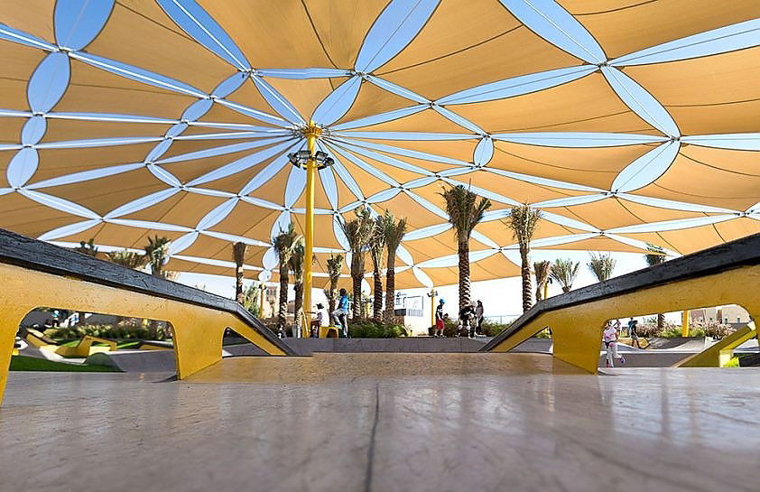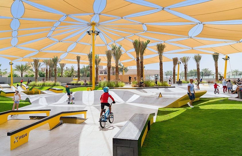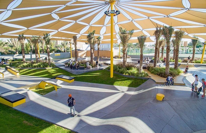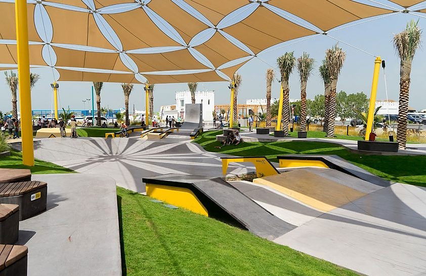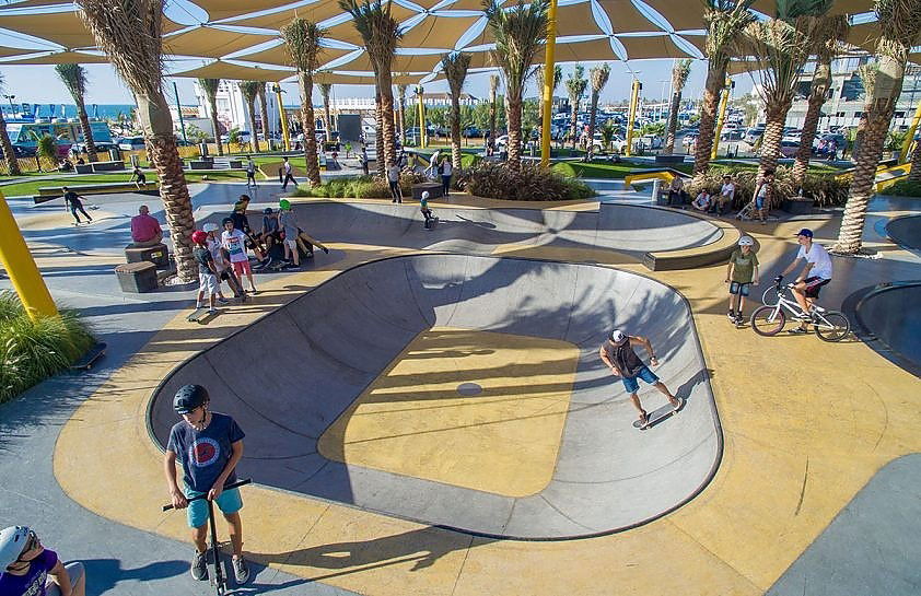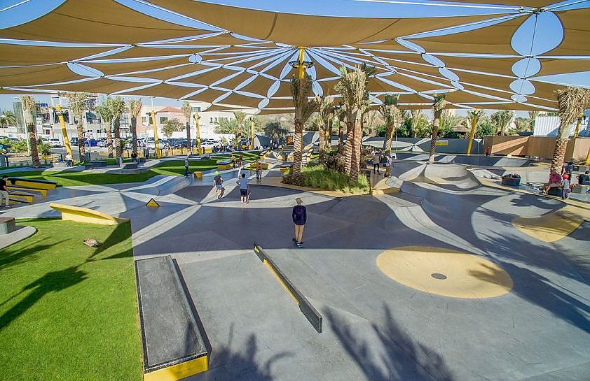 XDubai Skatepark, located in Umm Suqeim by Kite Beach, Dubai, is the largest skatepark in the UAE, covering over 3,000 square meters. Opened in 2016, it was designed and built by Convic, an Australian company specializing in action sports parks. The skatepark offers a range of features for skaters of all skill levels, including street elements, transition flow areas, and a large competition-grade bowl with a 3.2-meter deep XBowl. The park also caters to families, with shaded seating areas and amenities like equipment rentals.