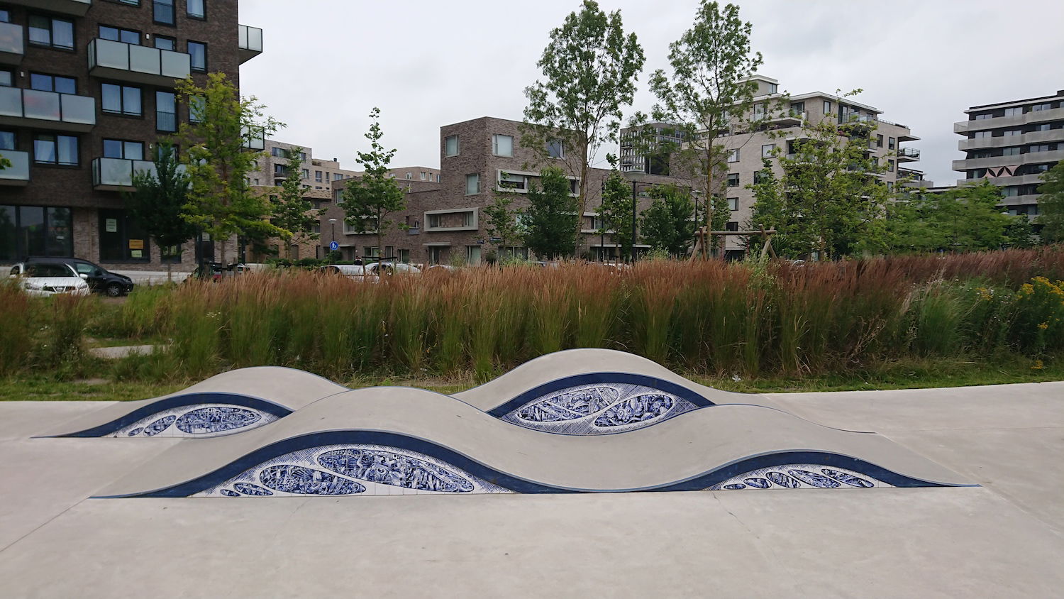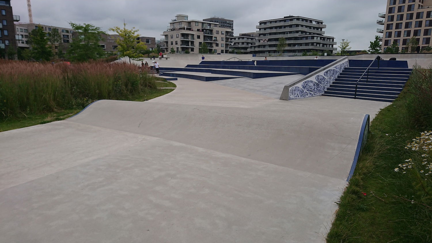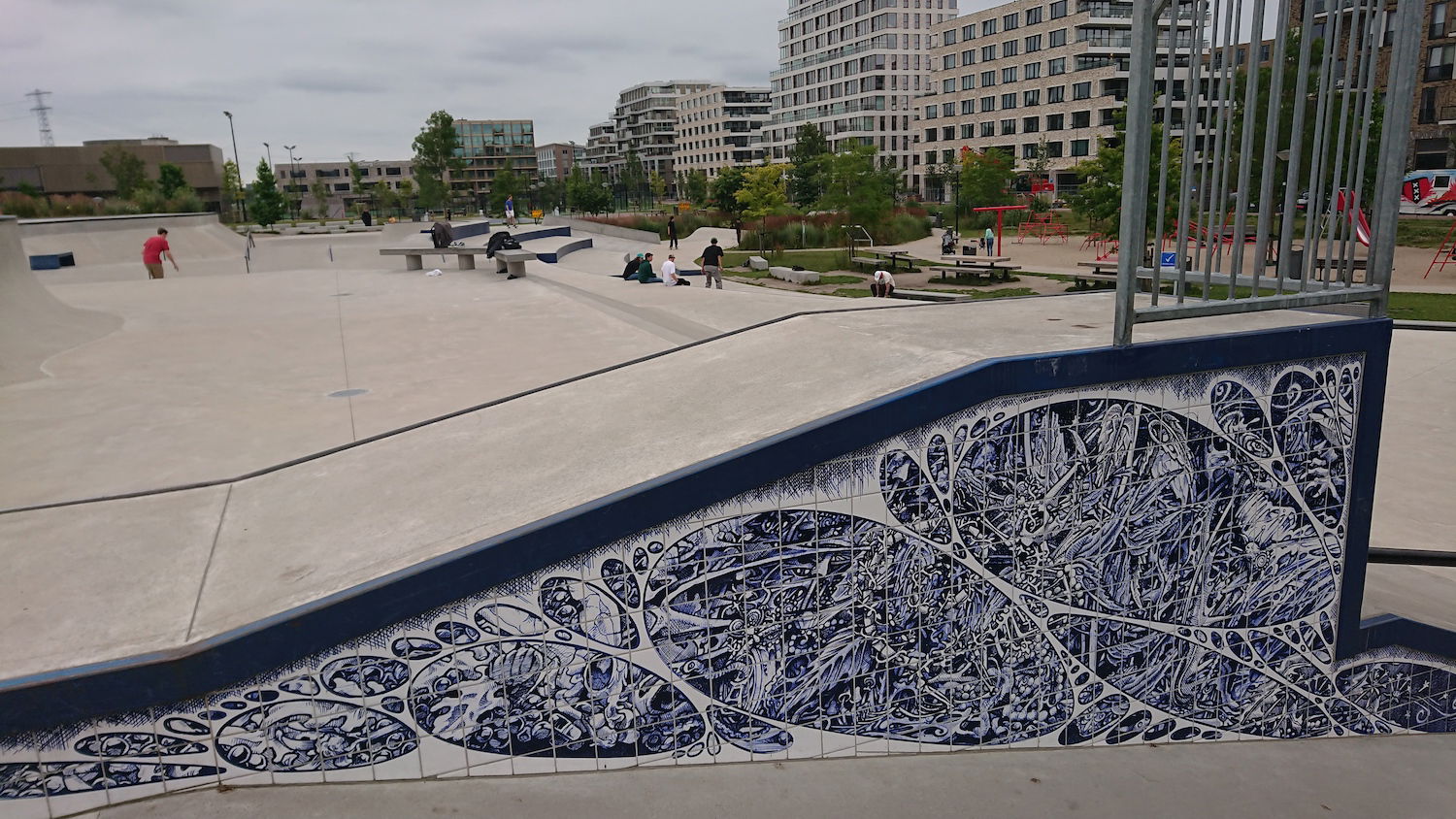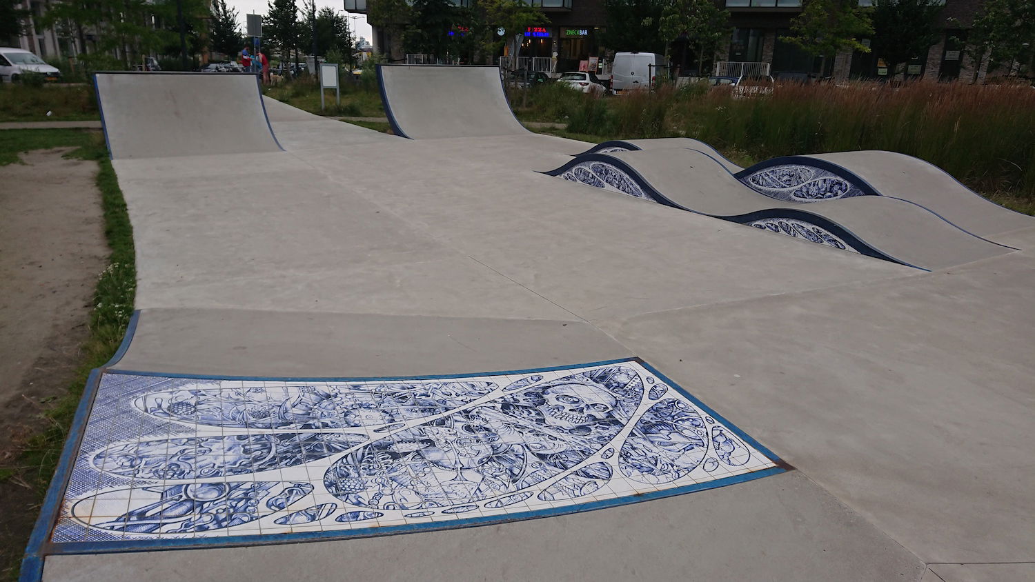 One standout feature of the park is the intricate blue and white tile work designed by Iris Roskam, adding a unique aesthetic touch to the functional design. The park is also intended to serve as a community hub, attracting visitors beyond just skaters, thanks to its open layout and scenic surroundings.