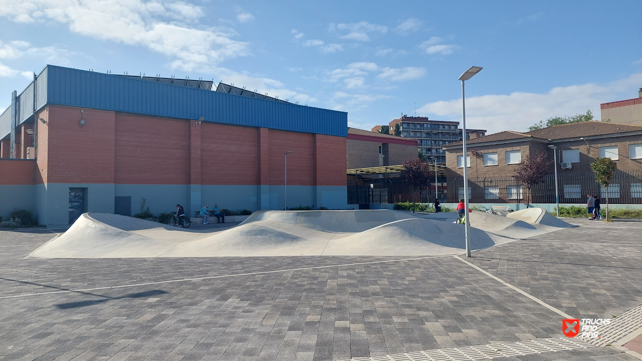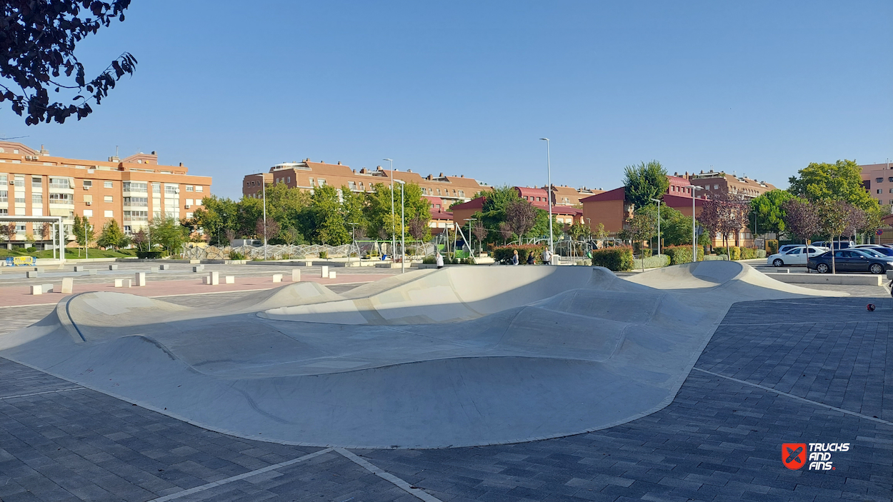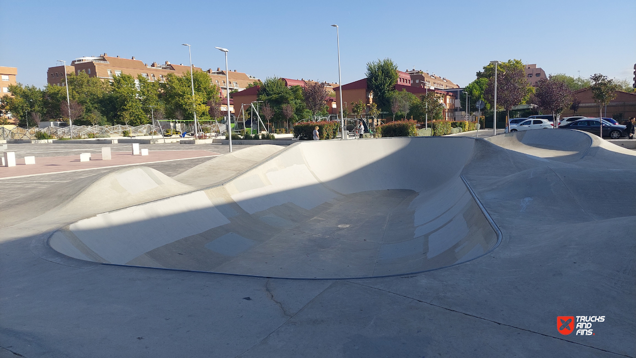 Alcalá de Henares skatepark, aka Juan de Austria skatepark, features a concrete bowl, surrounded by a flow track.