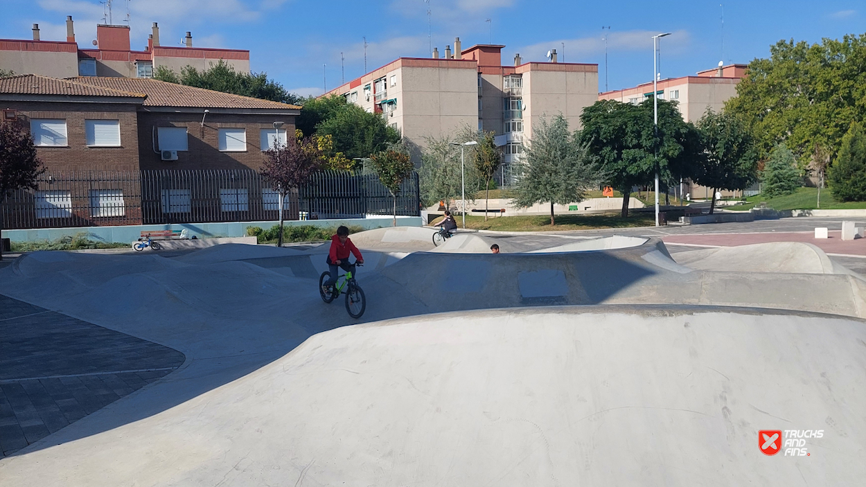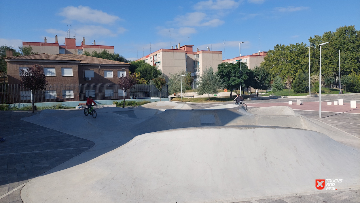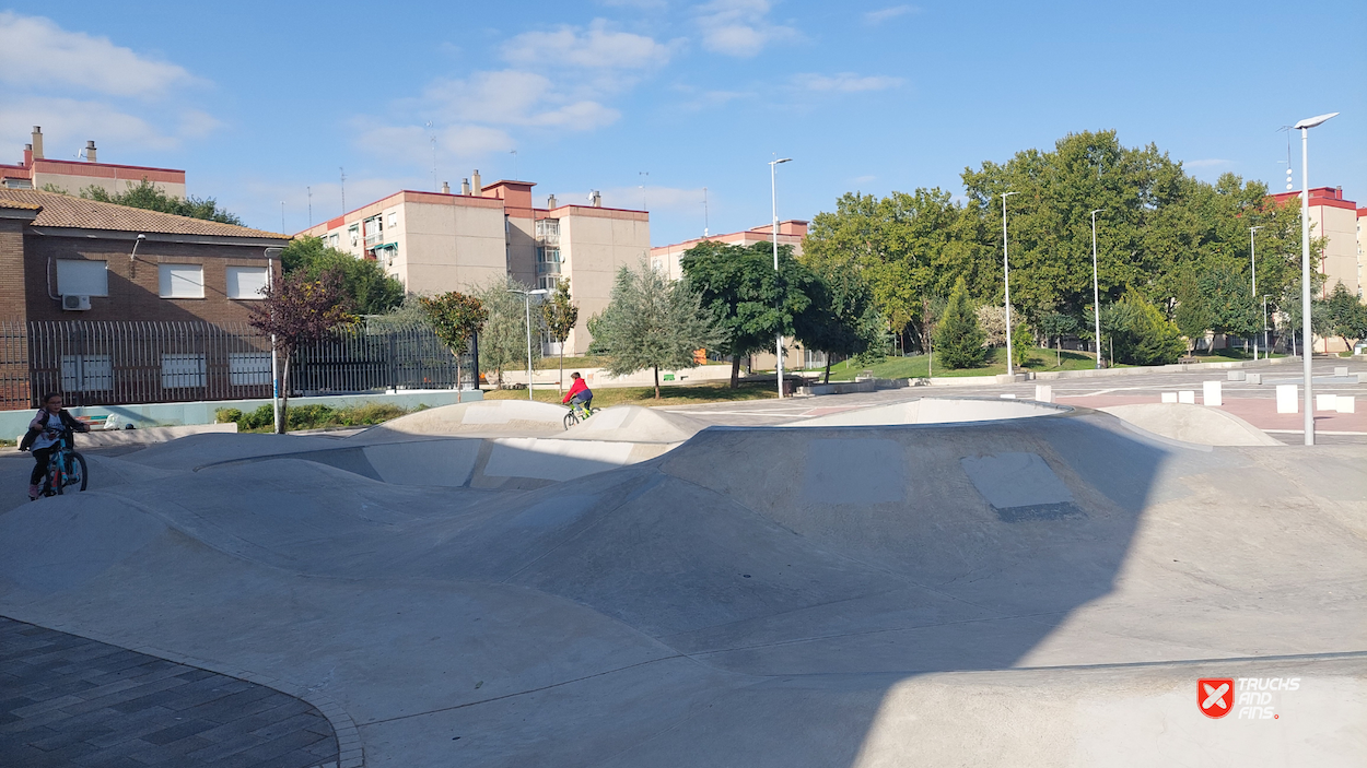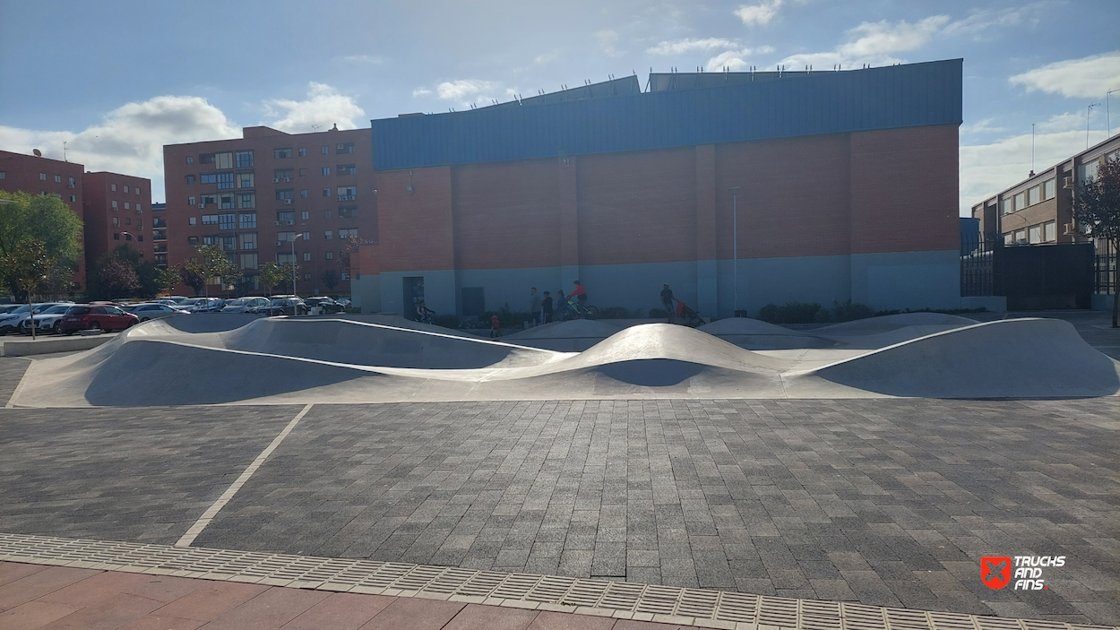 Alcalá de Henares skatepark, aka Juan de Austria skatepark, features a concrete bowl, surrounded by a flow track.