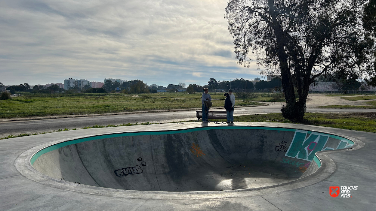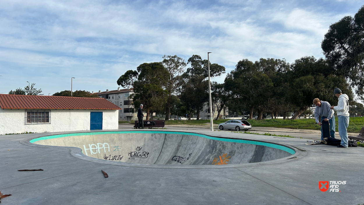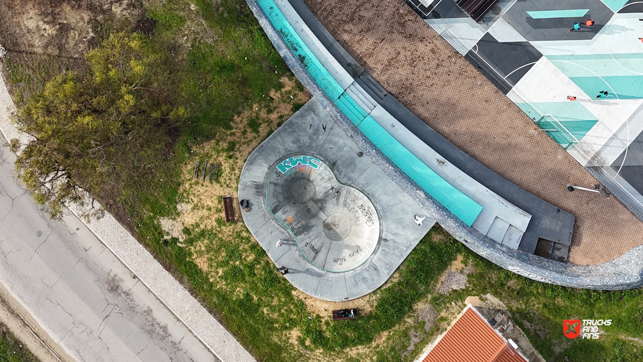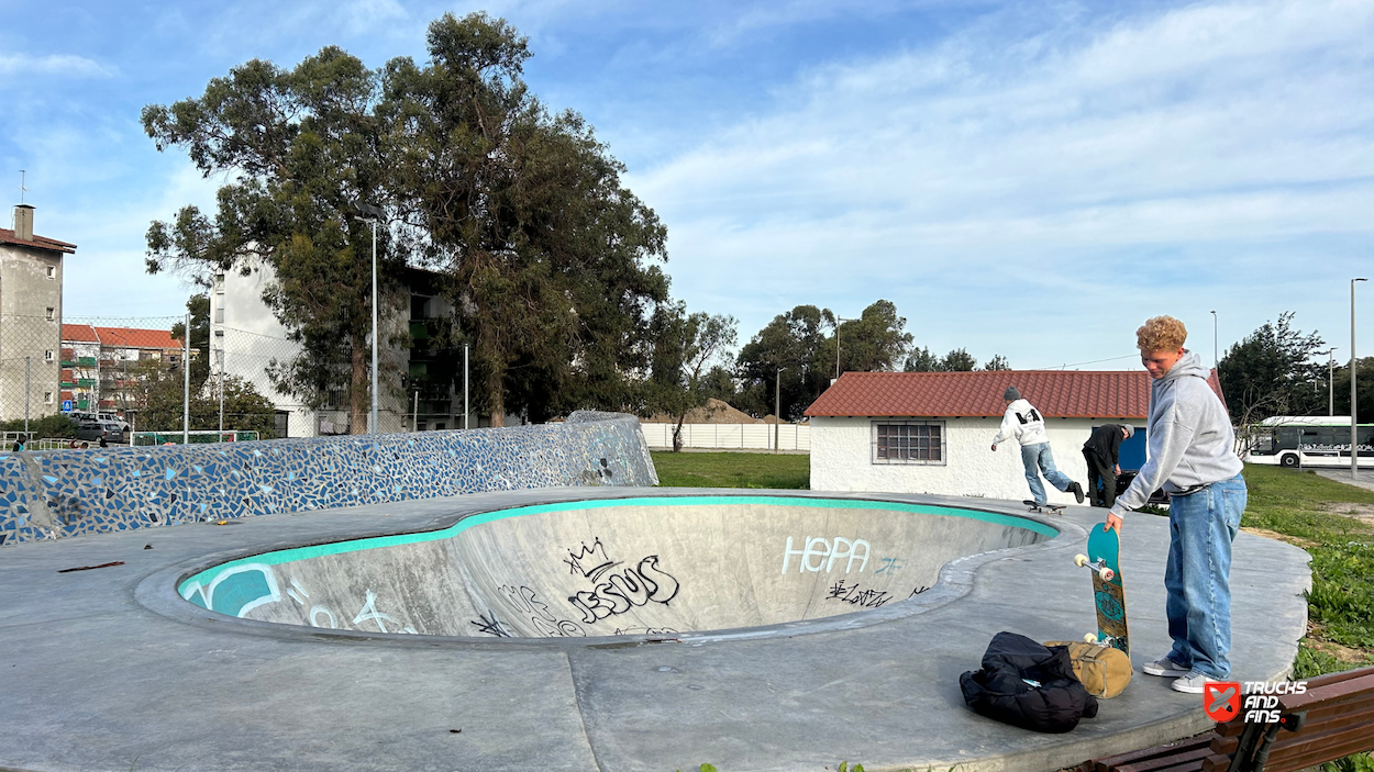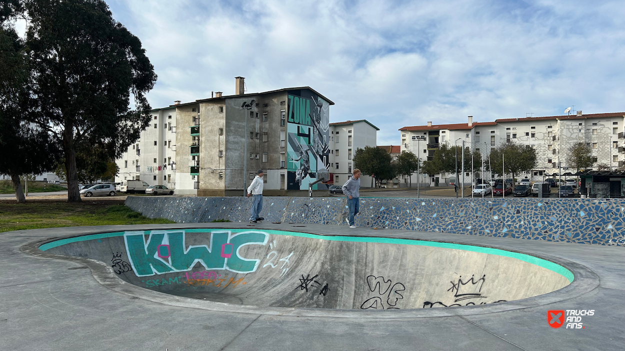 Alto do Seixalinho skatepark features a concrete bowl with stone coping. The skate bowl was built by Wasteland Skateparks in 2024.