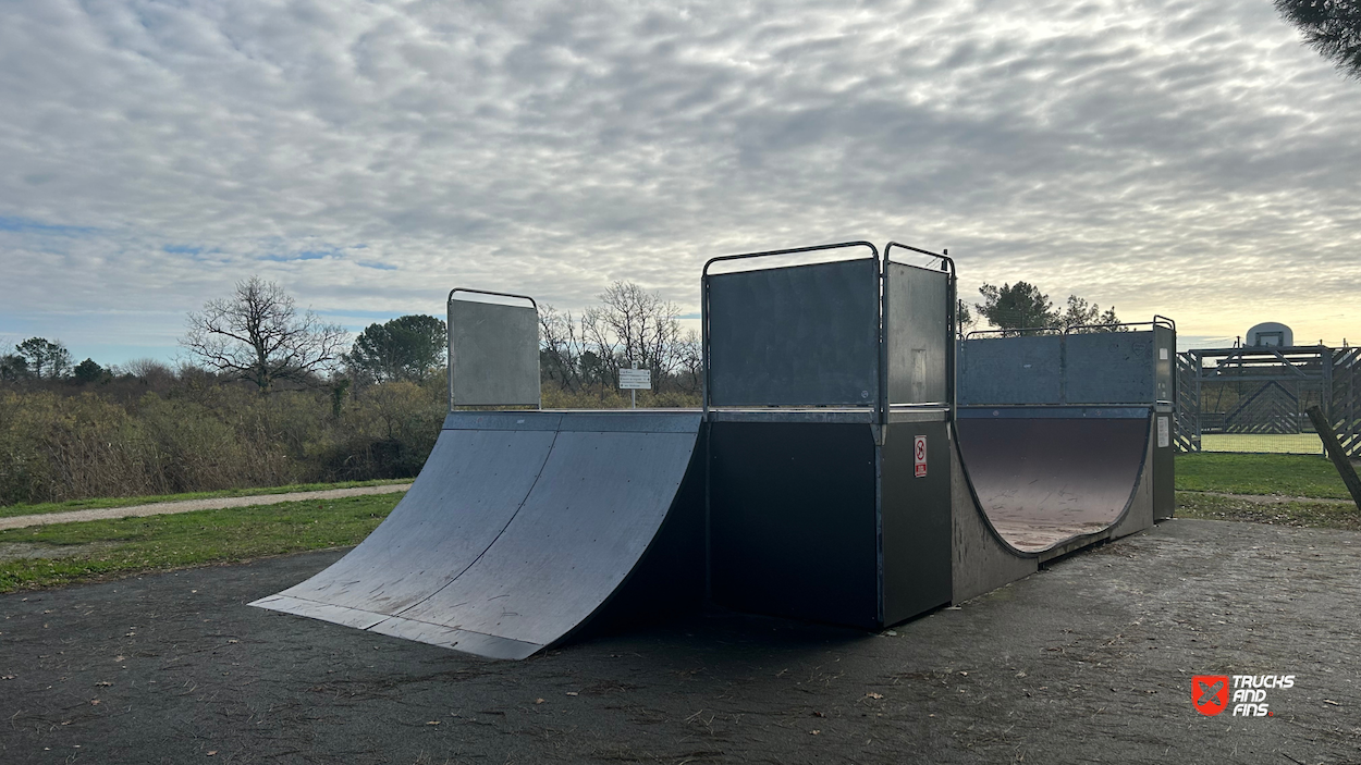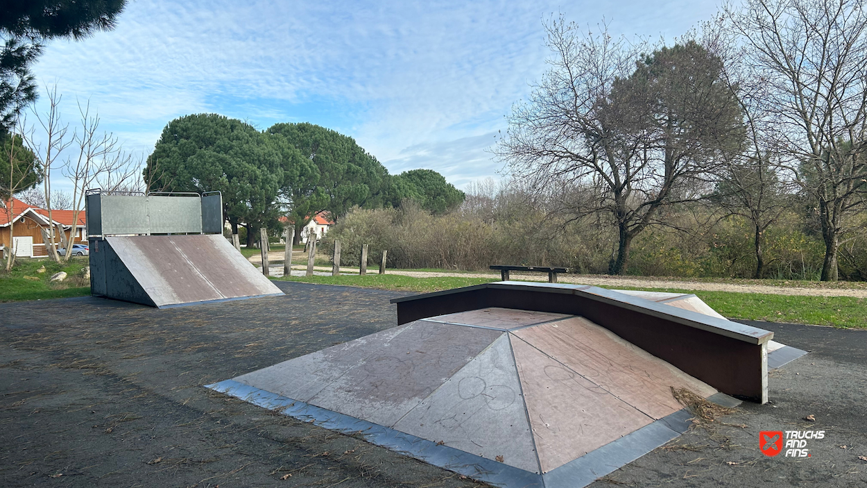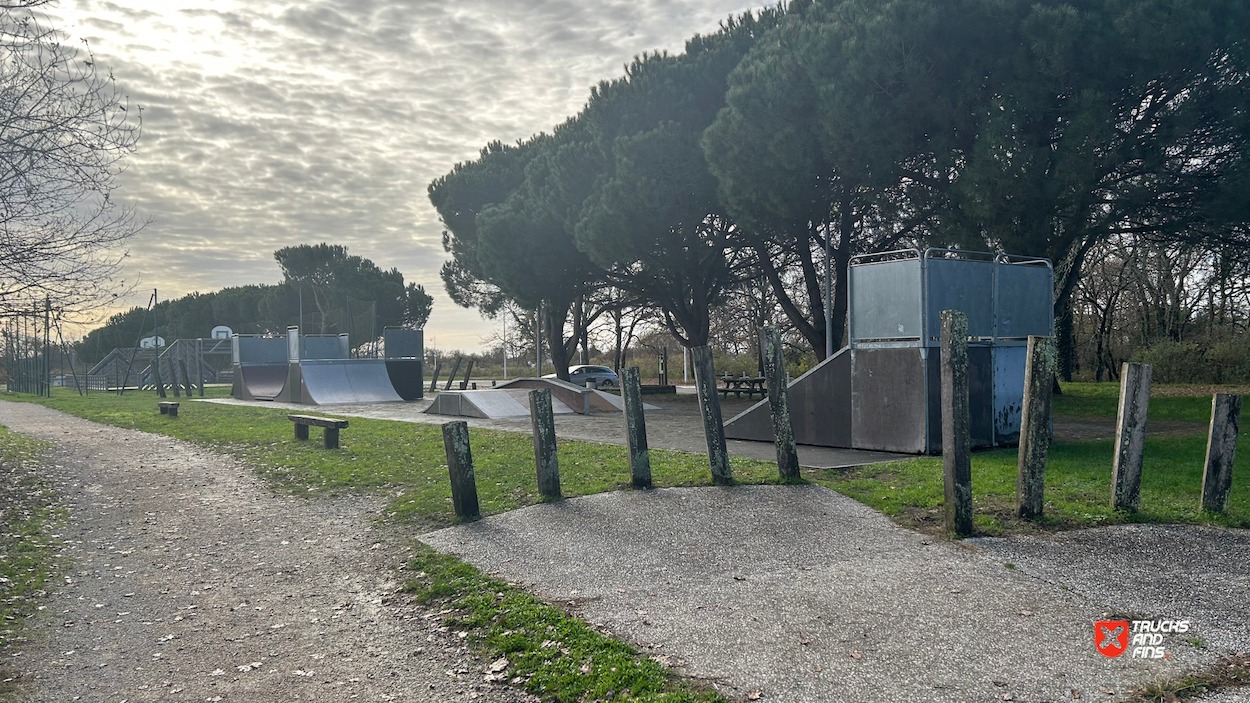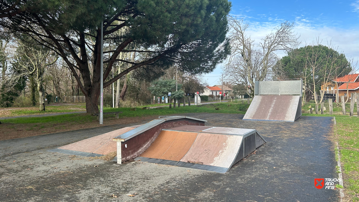 Audenge skatepark features a miniramp and several basic skateboarding obstacles in a back and forth setup.