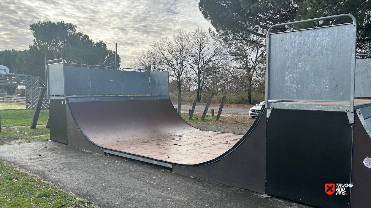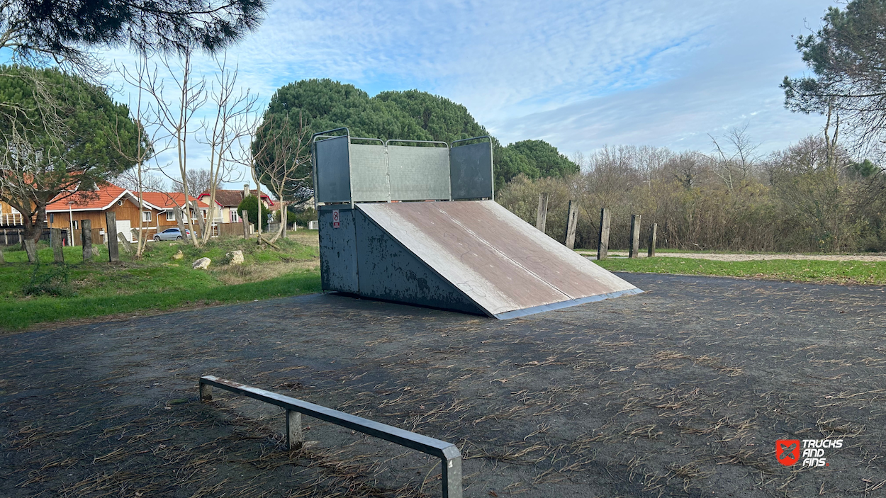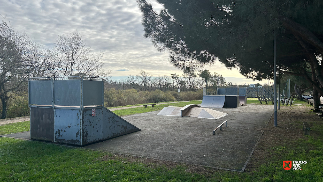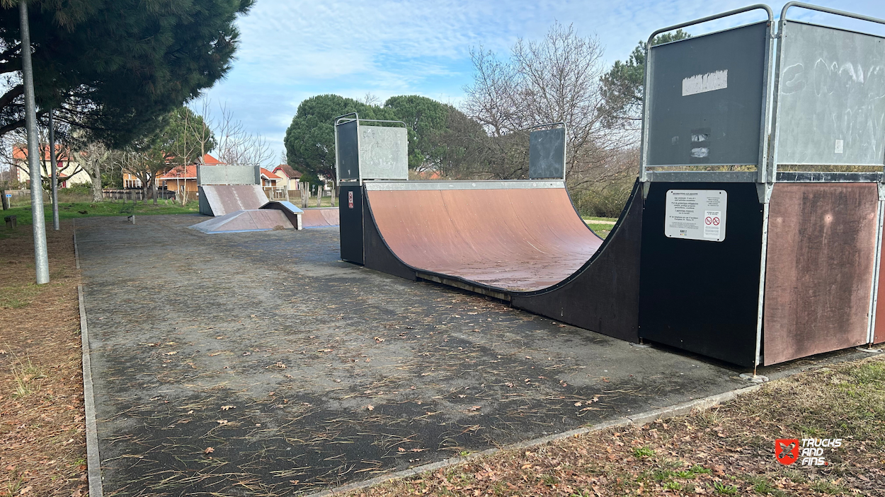 Audenge skatepark features a miniramp and several basic skateboarding obstacles in a back and forth setup.
