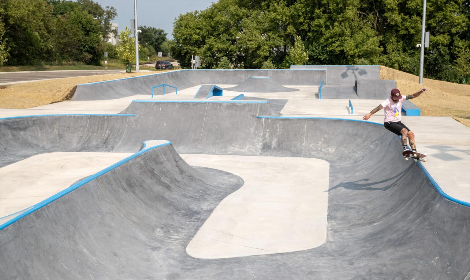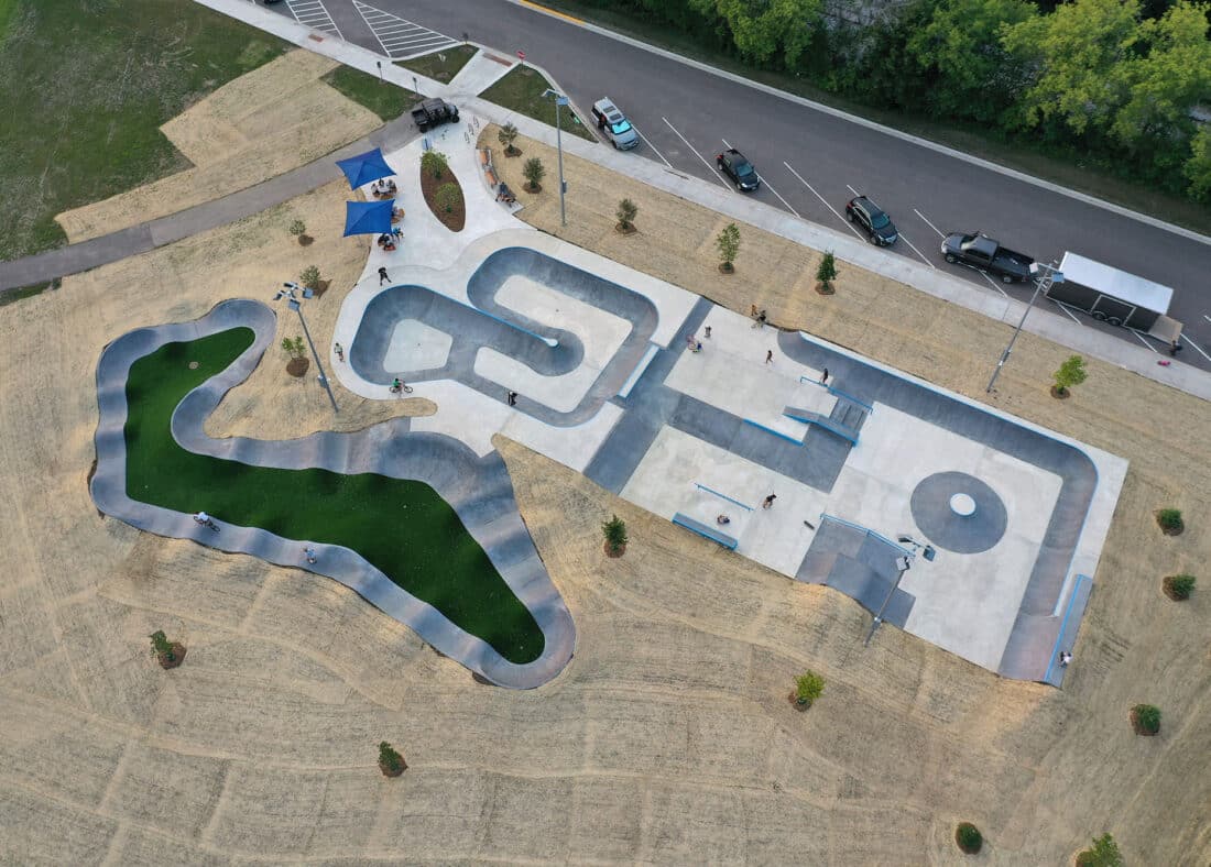 In August 2023, the Village of Cottage Grove, Wisconsin proudly unveiled its newest recreational gem: Bakken Wheels Park, a dynamic creation brought to life by the expertise of SpohnRanch skateparks through a meticulously planned design-build project. The culmination of community input, this 10,000 square foot wheel sports landscape caters to the desires of local riders, boasting a diverse array of terrain styles. From a multifaceted bowl with varying elevations to a sleek linear street section and a meticulously crafted concrete pump track, every element of Bakken Wheels Park has been thoughtfully curated to provide an exhilarating experience for riders of all levels. Beyond its innovative design, the park is equipped with essential amenities to enhance the visitor experience. Sports lighting ensures that the fun doesn't stop when the sun sets, while strategically placed spectator seating and shade canopies offer comfort and convenience for onlookers. With its blend of functionality, aesthetics, and community engagement, Bakken Wheels Park stands as a testament to the power of collaboration and thoughtful design in creating vibrant recreational spaces.