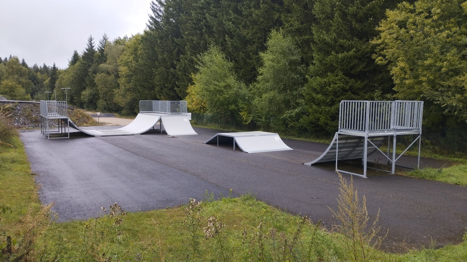 Baraque de Fraiture skatepark features a miniramp and several basic skateboarding obstacles in a back and forth setup.