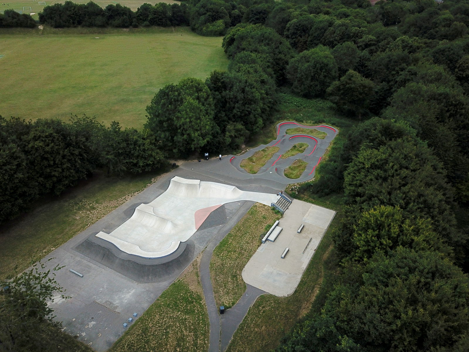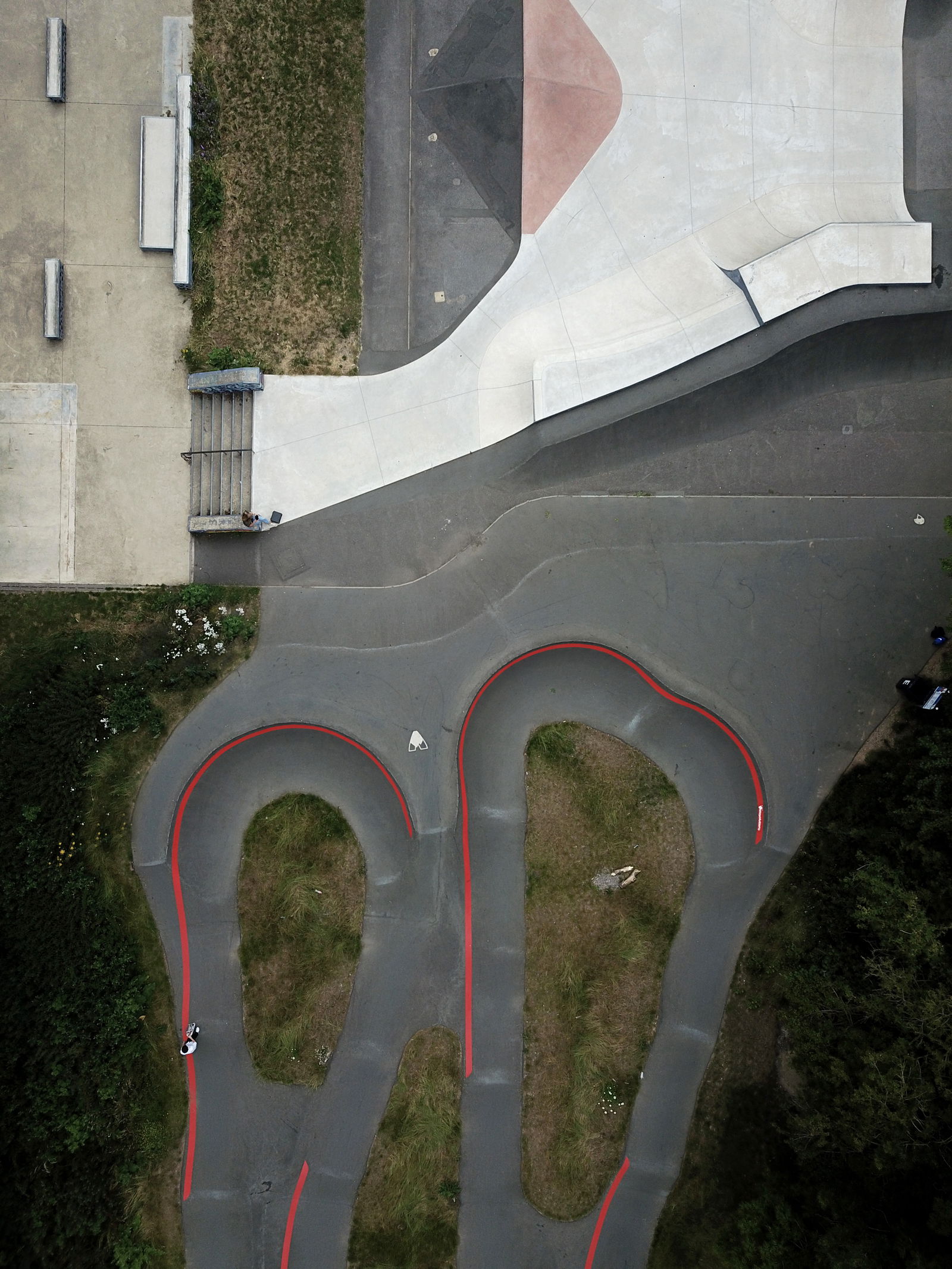 Basingstoke pumptrack is an asphalt bike and skateboarding track built by VelosolutionsUK. This Velosolutions pumptrack runs alongside a concrete skate park and parkour facility. A contemporary 143m long track with multiple line options, double berms and S berm sections.