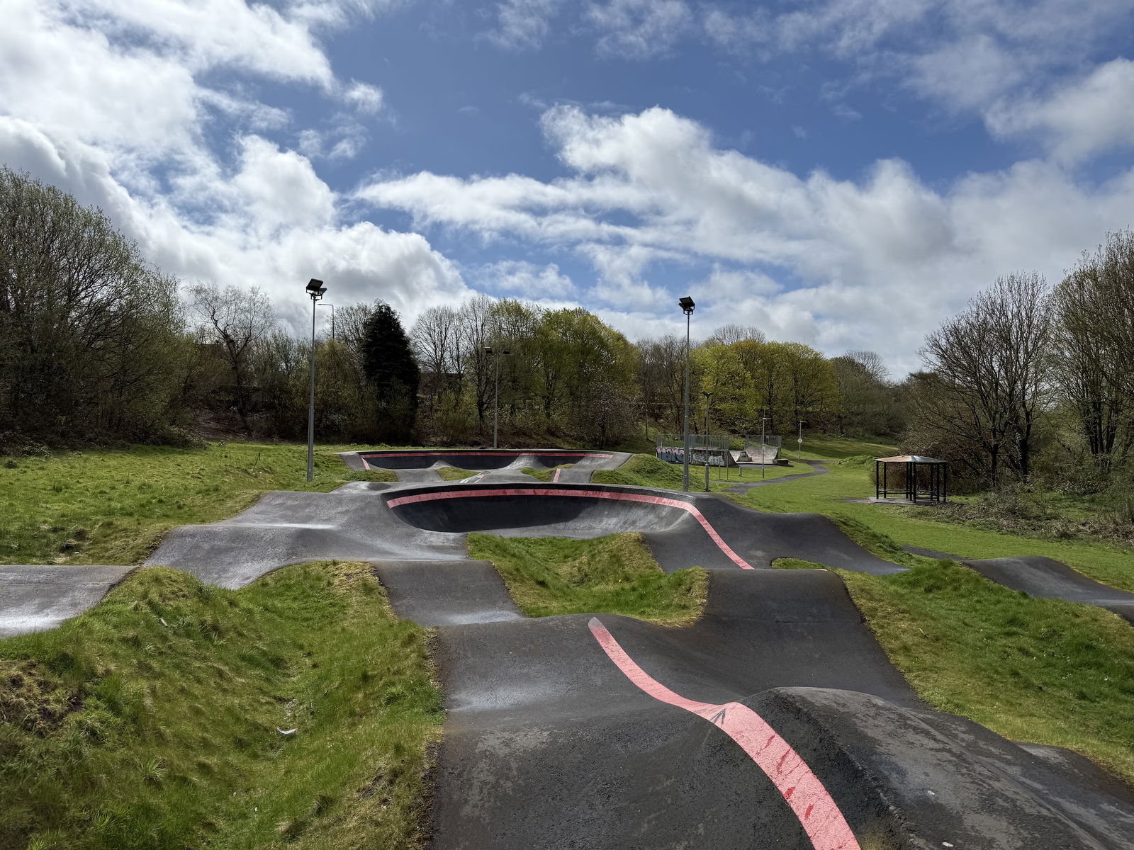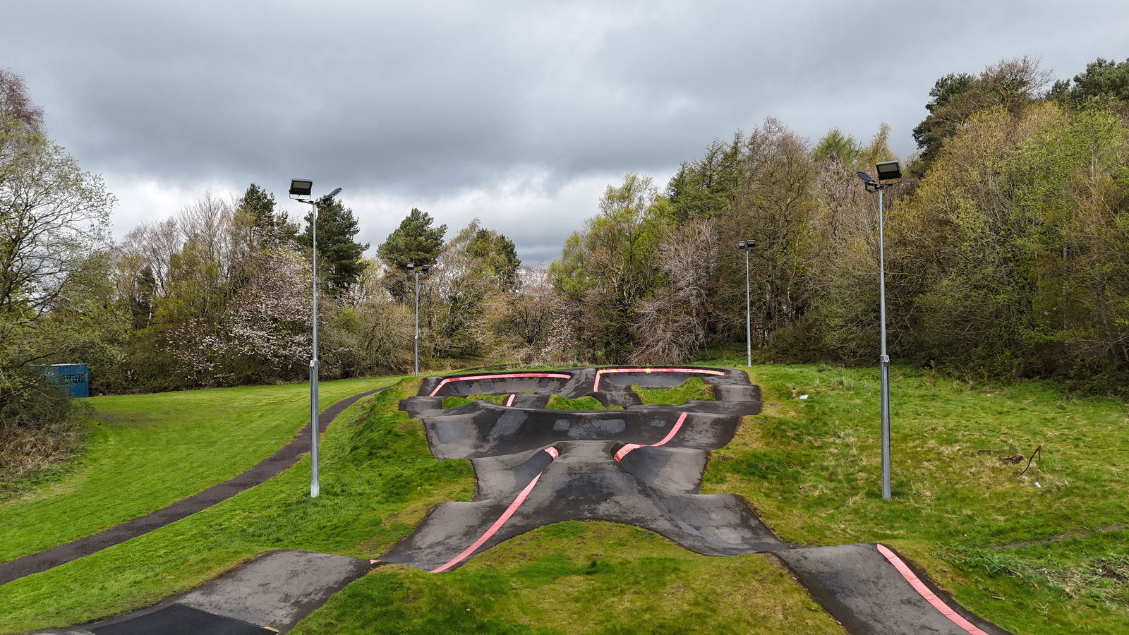 Bathgate pumptrack is an asphalt bike and skateboarding track built by VelosolutionsUK. Large 165m track in a long loop with the option to ride in a figure of eight. Balbardie park features a triple berm, three 180 berms, and a double sided berm in the middle of the loop.