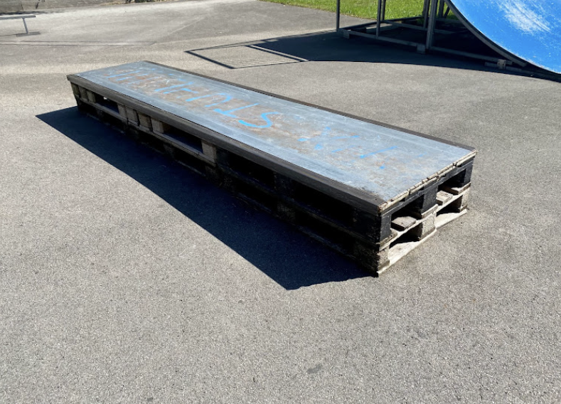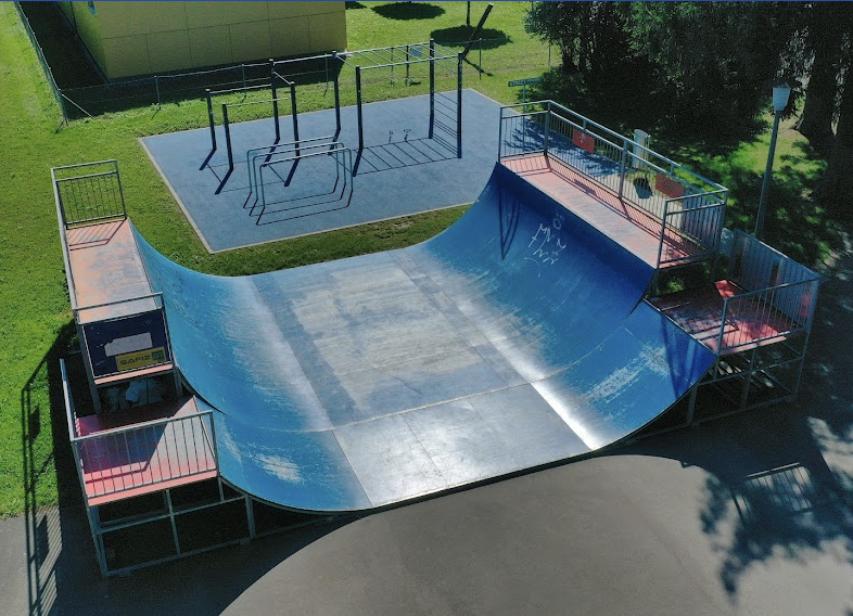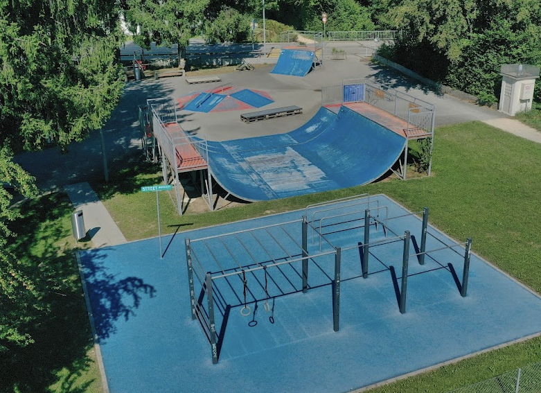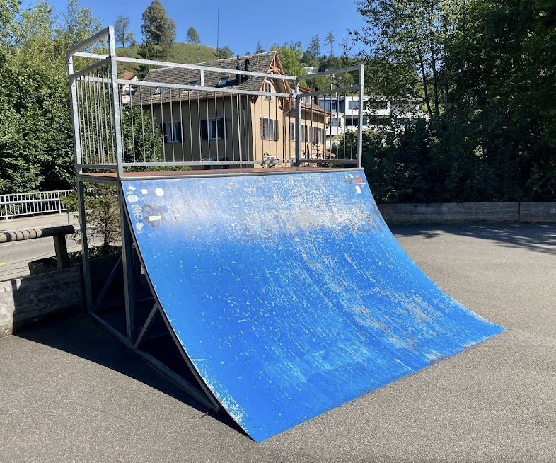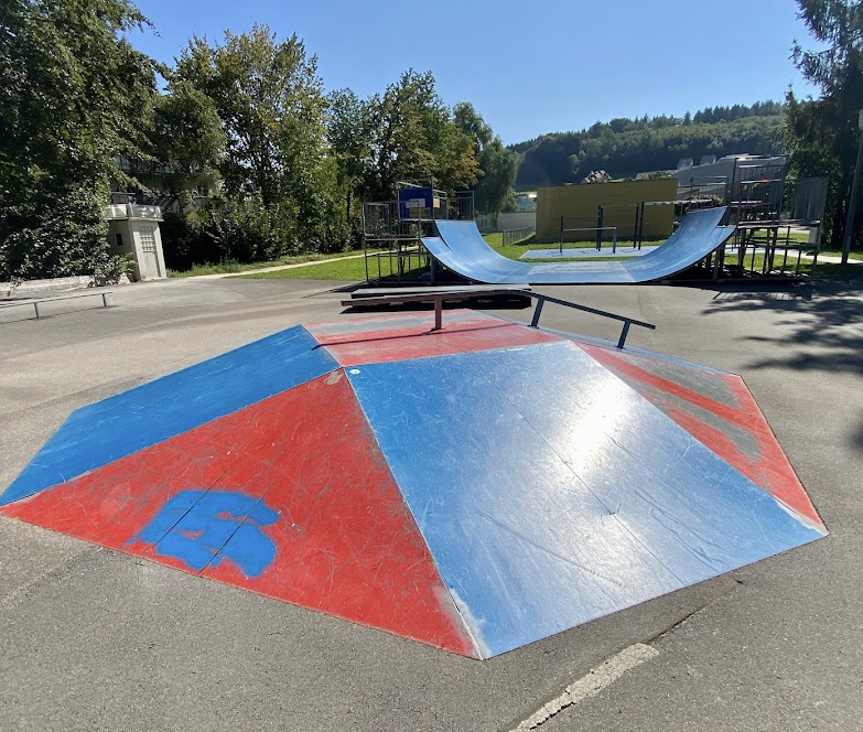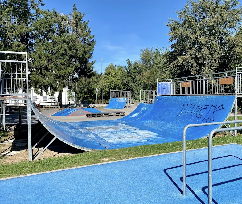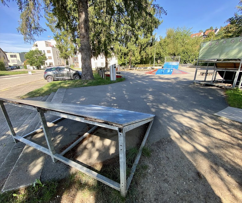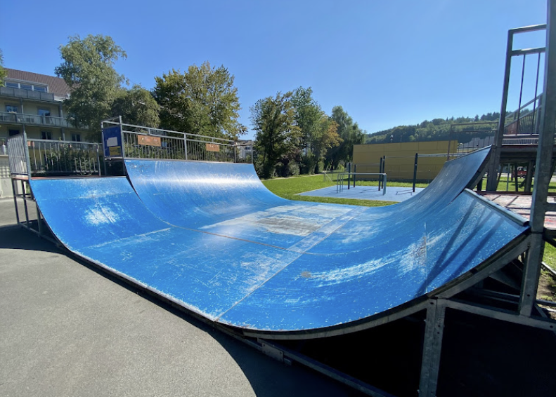 Birmensdorf skatepark features a miniramp and several basic skateboarding obstacles in a back and forth setup.