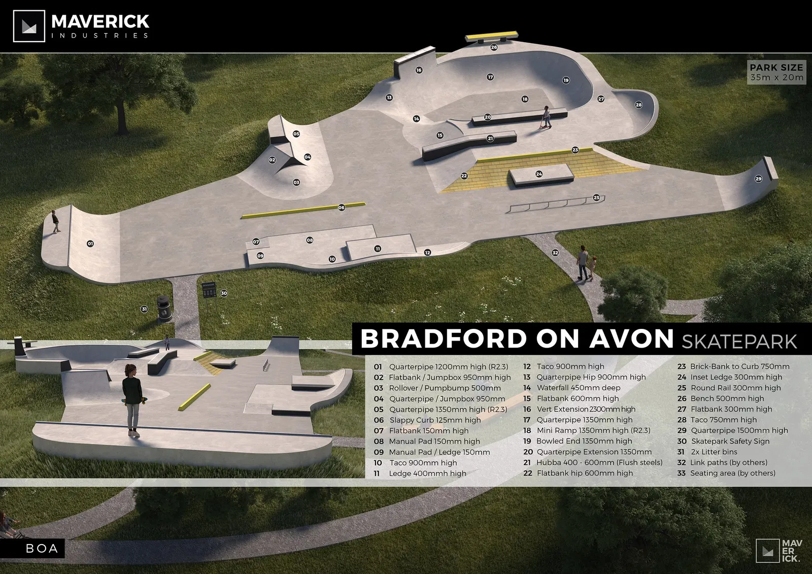 Bradford-on-Avon skatepark, aka BOA skatepark, is a concrete park built by Maverick skateparks in 2023.