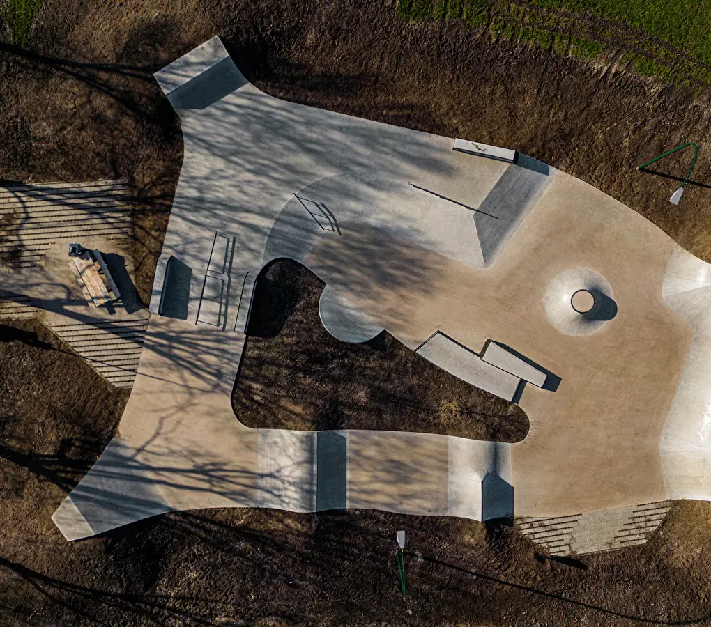 The design and construction were executed by Nine Yards Skateparks, who worked closely with local skaters and the municipality to ensure the facility met user expectations. The central location is easily accessible via public transportation. A distinctive feature of the park is the pigmented concrete flooring, which provides a serene appearance and contrasts effectively with the obstacles, enhancing skater orientation.