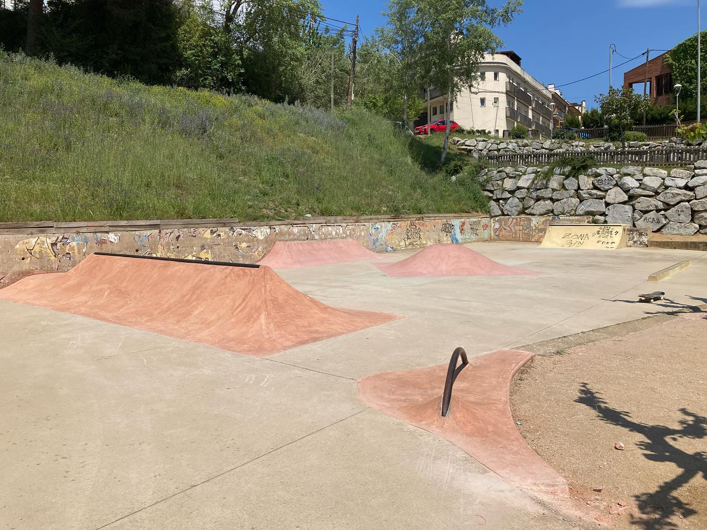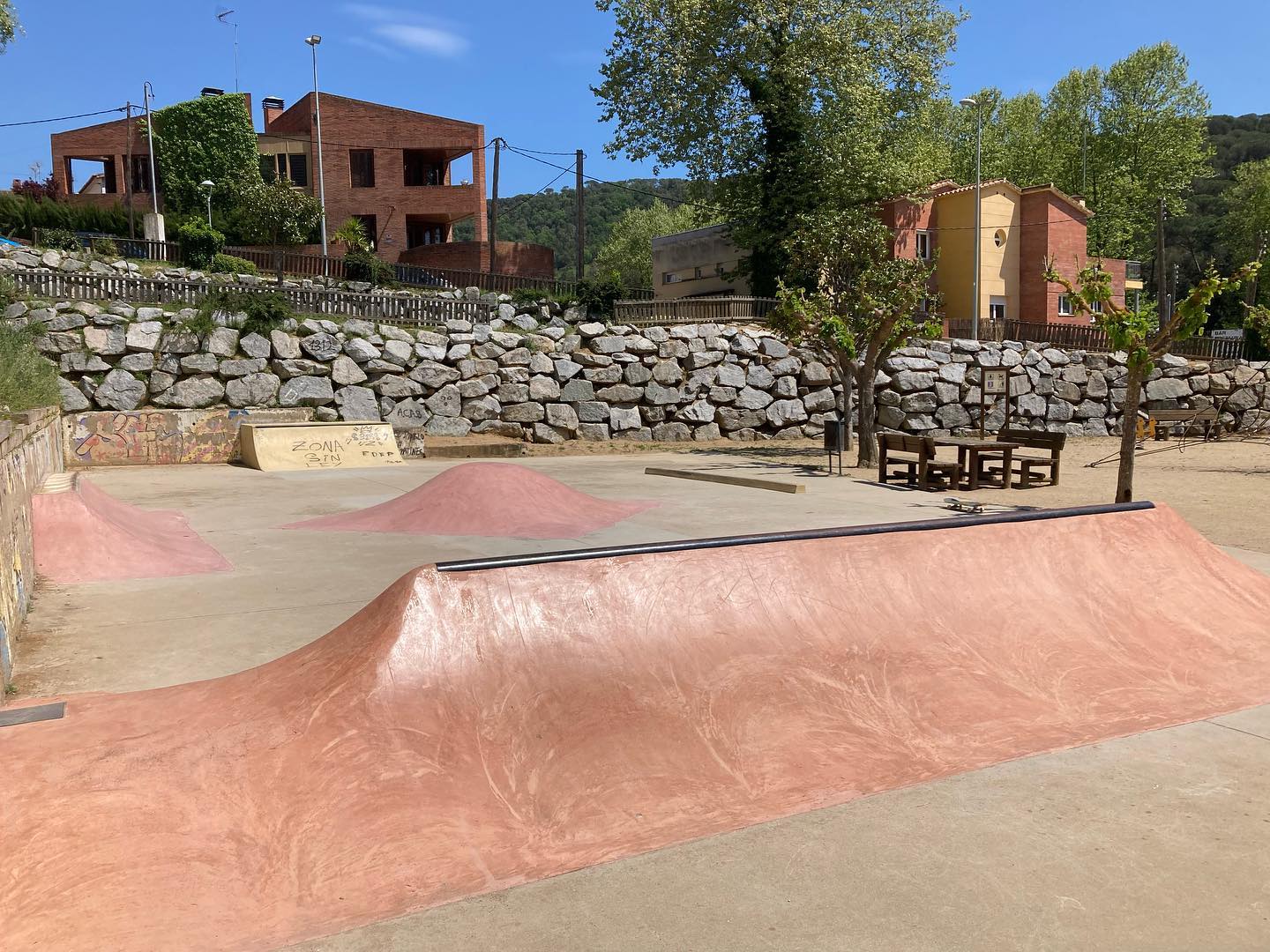 Located at Camí del Forn 10, 08318 Canyamars in the Dosrius municipality of Barcelona, this outdoor concrete skatepark was completed in 2022 by Vulcano Skateparks. Set in the green hills of the Maresme region, it features a flowing bowl section for transitions alongside street-modules including rails, benches, curbs and handrails. The design handles riders of all levels—from beginners learning flow to advanced skaters pushing technical tricks. Free public access and a quiet natural backdrop make Canyamars a great stop for skaters touring Catalonia.