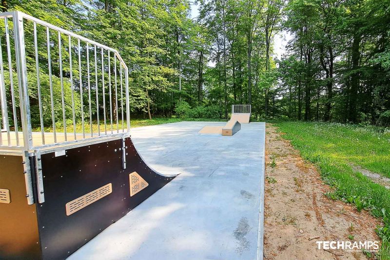 Cewice skatepark is a small park with several basic obstacles in a back and forth setup. The skatepark was built by Techramps.