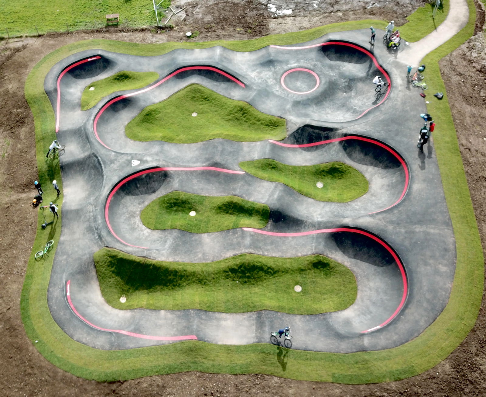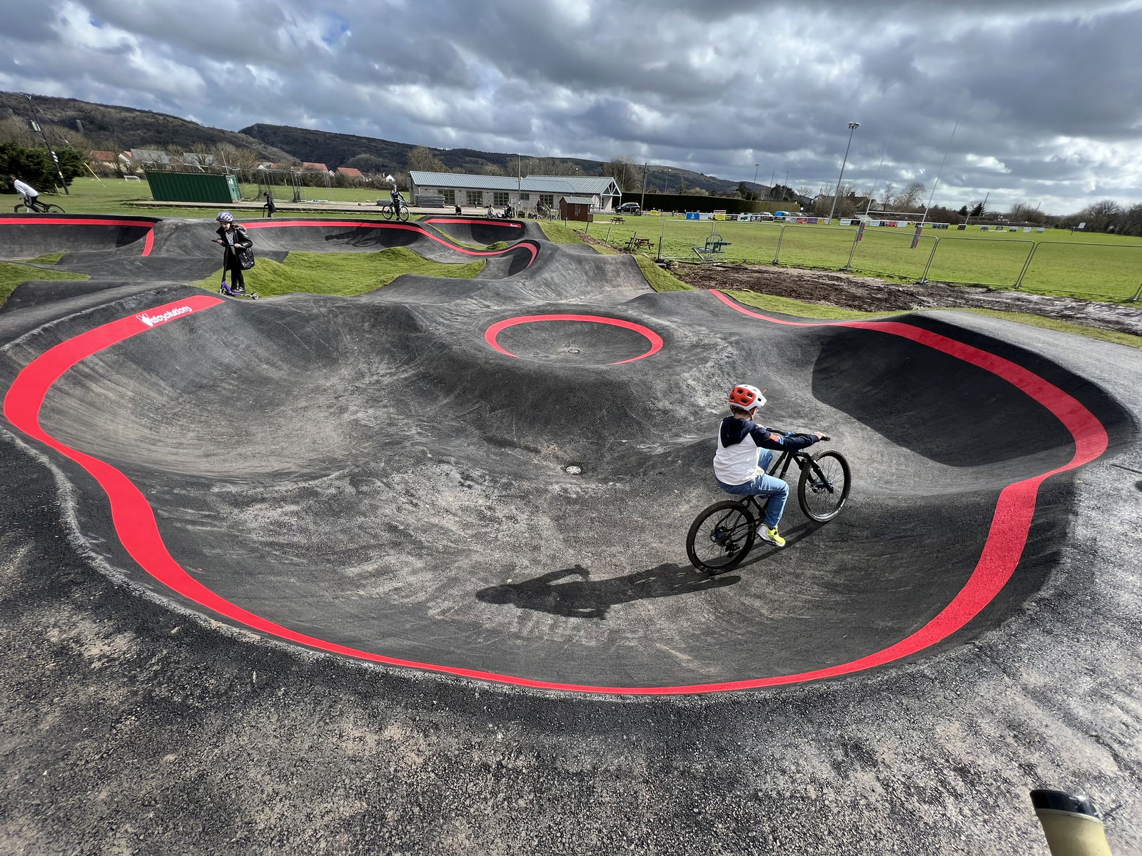 Cheddar pumptrack is an asphalt bike and skateboard track built by VelosolutionsUK. Large 187m track with playful elements such as a satellite dish, triple berm, and roller berms. The big square area provides lots of line choice for skatepark style lines alongside pumptrack laps.