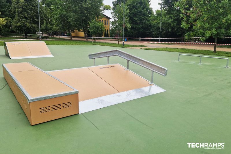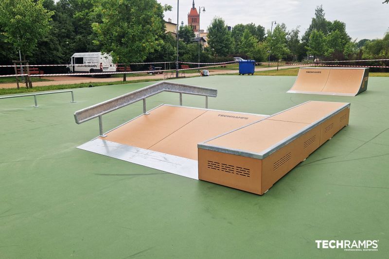 Chełmża skatepark is a small park with several basic obstacles in a back and forth setup. The skatepark was built by Techramps.