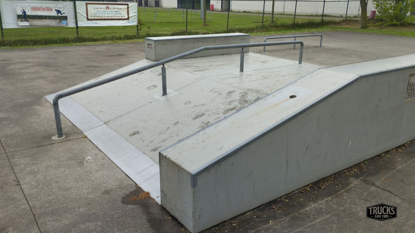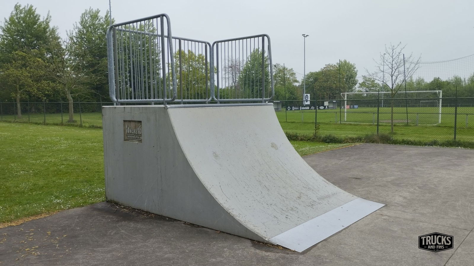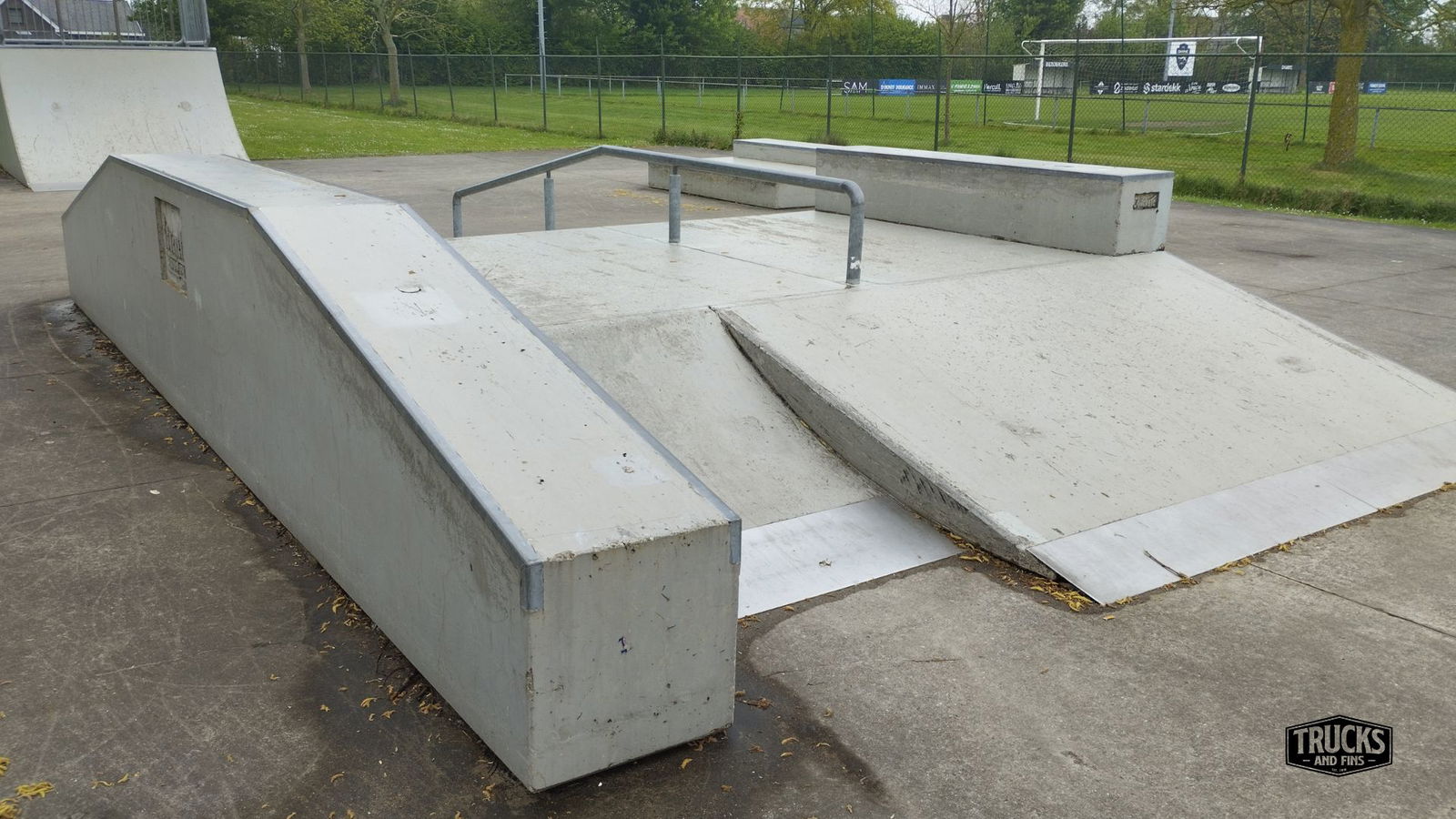 Damme skatepark is a small park with several basic skateboarding obstacles in a back and forth setup. The skatepark is located at Sportpark 't Veld sports complex.