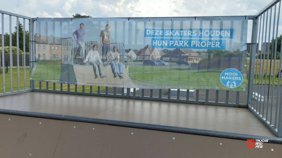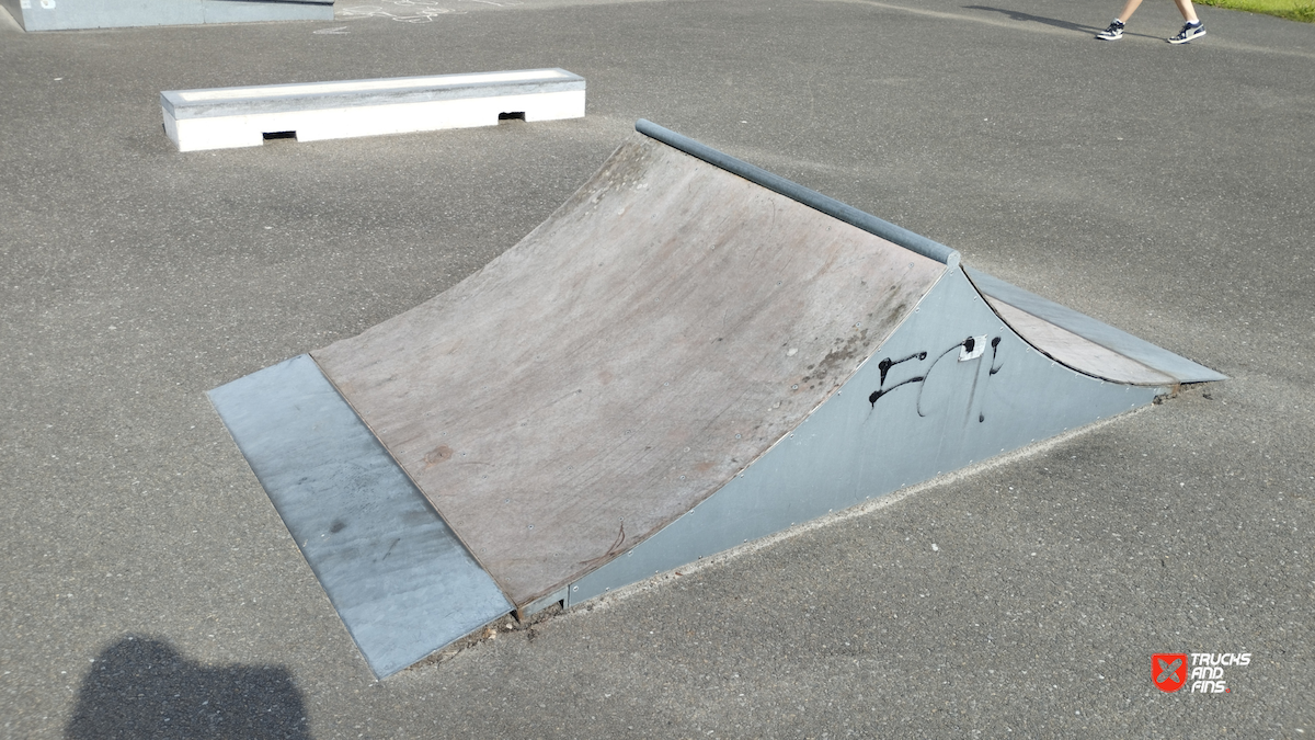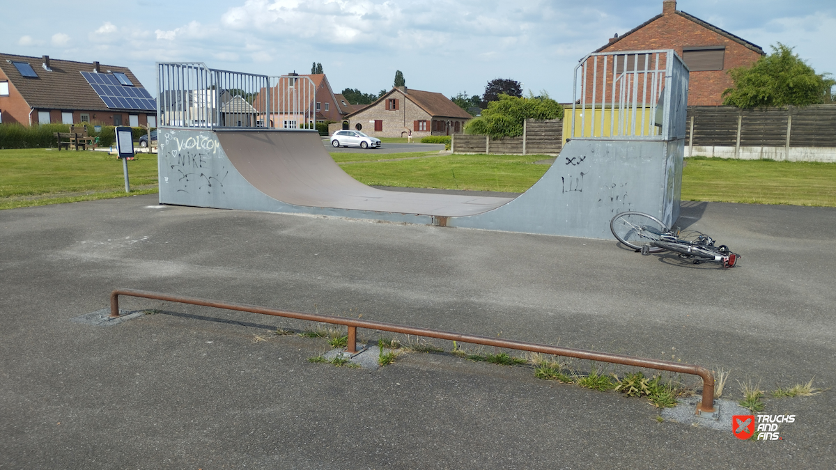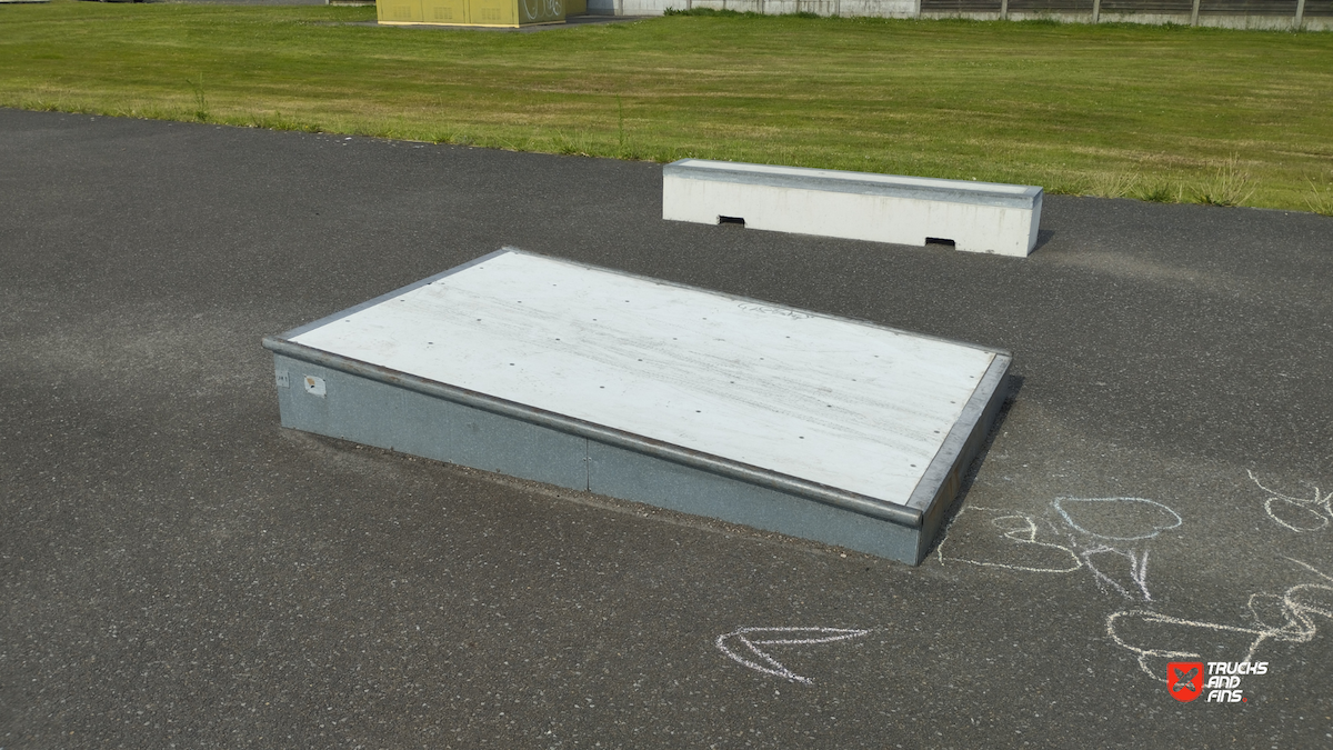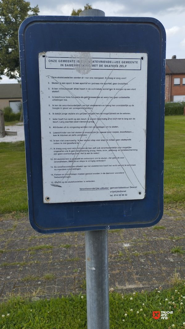 Dessel skatepark features a miniramp and several basic skateboarding obstacles.