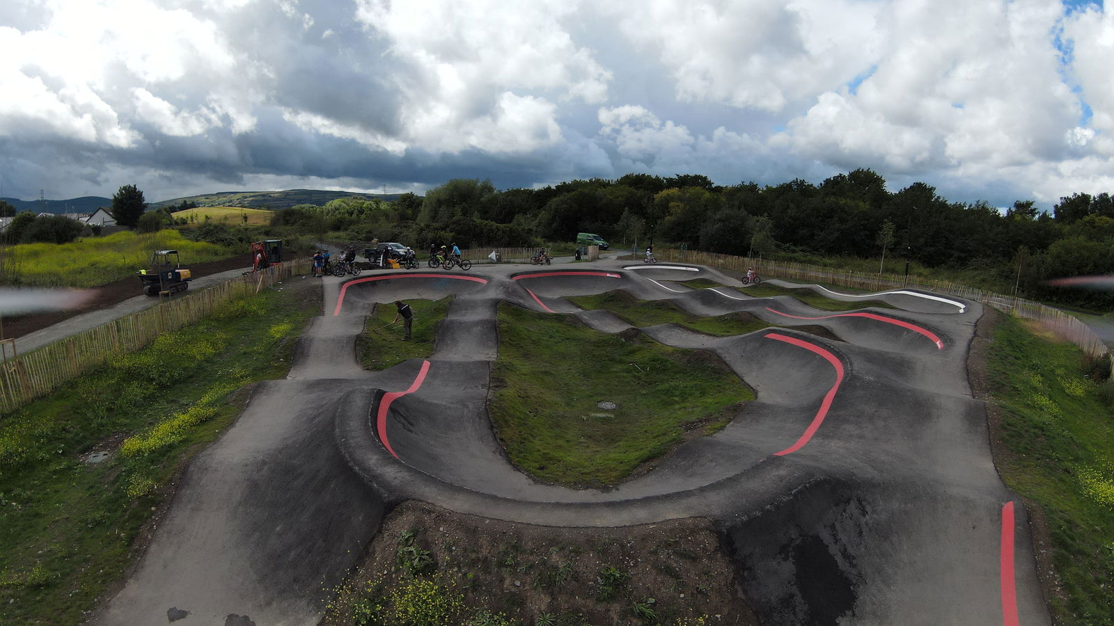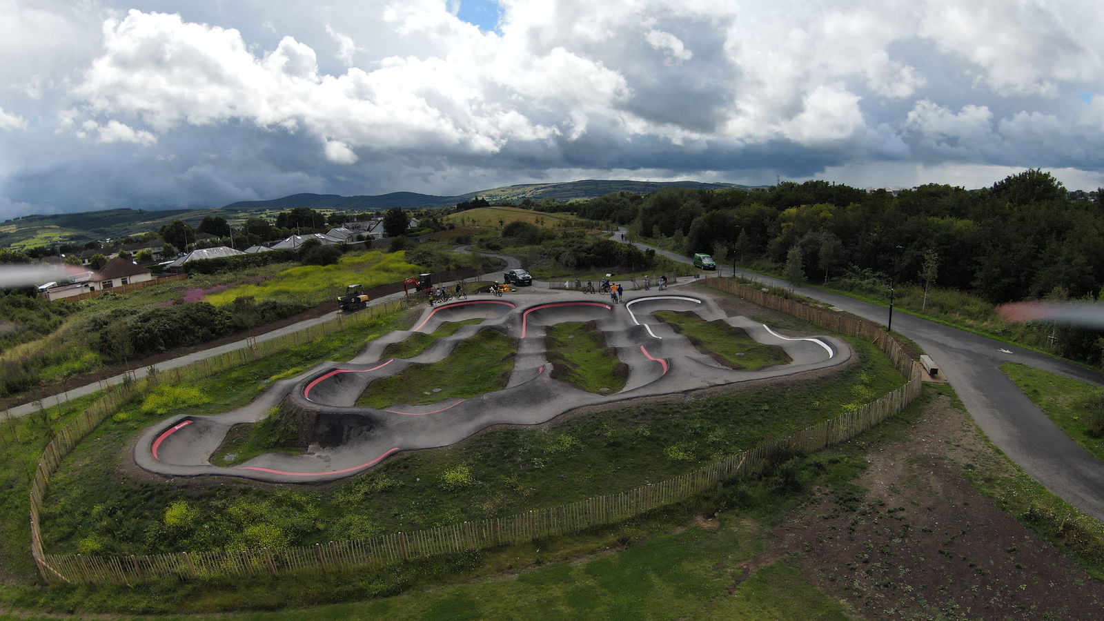 Dodder pumptrack is an asphalt bike and skateboarding track built by VelosolutionsUK. Large 140m track in a rough U shape with a 50m beginner loop alongside it. The large track has two 180 berms, a triple berms, and several straights with roller and gap options.