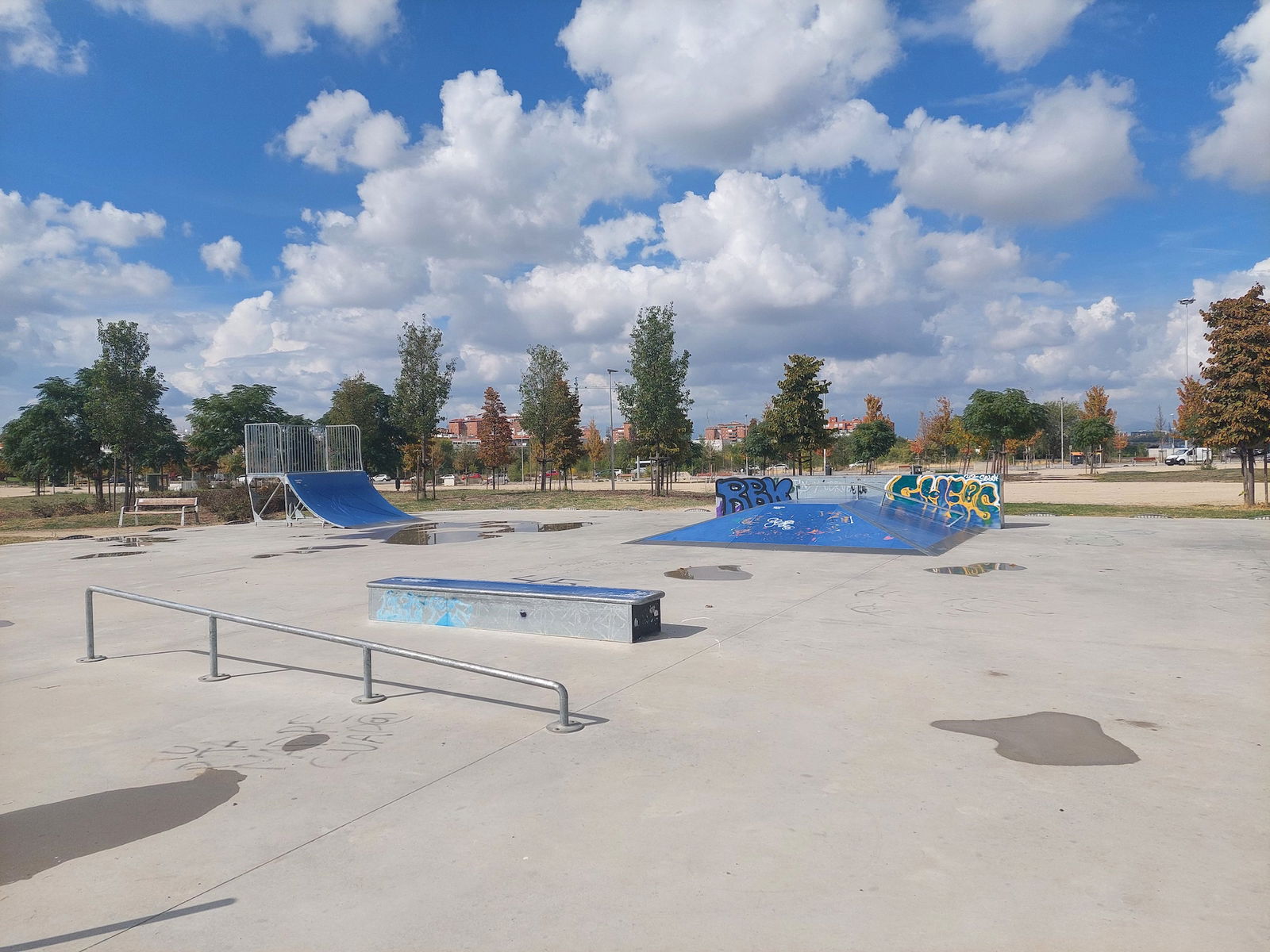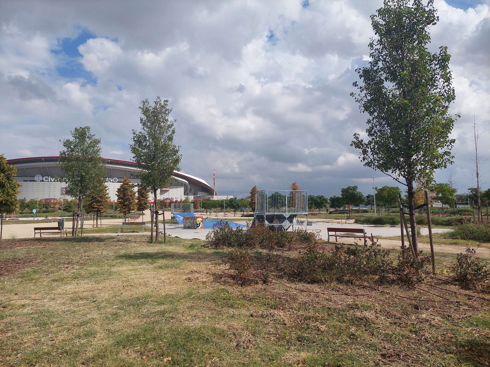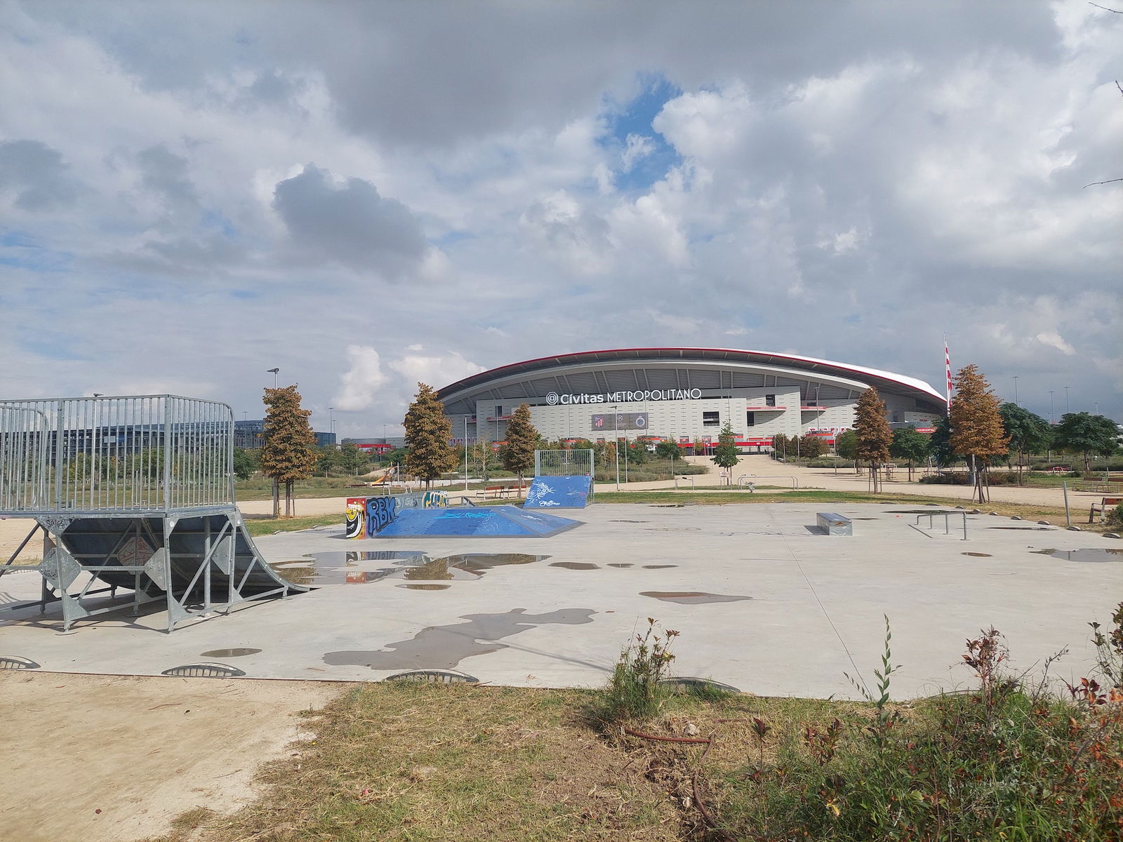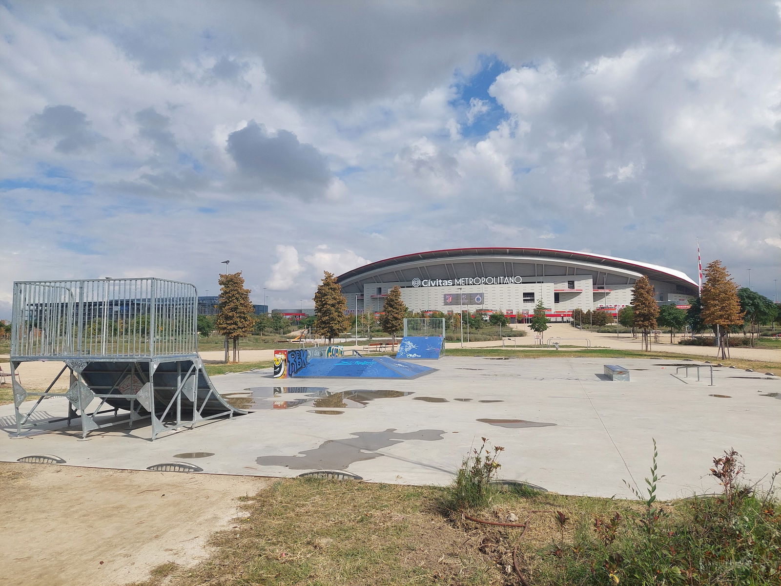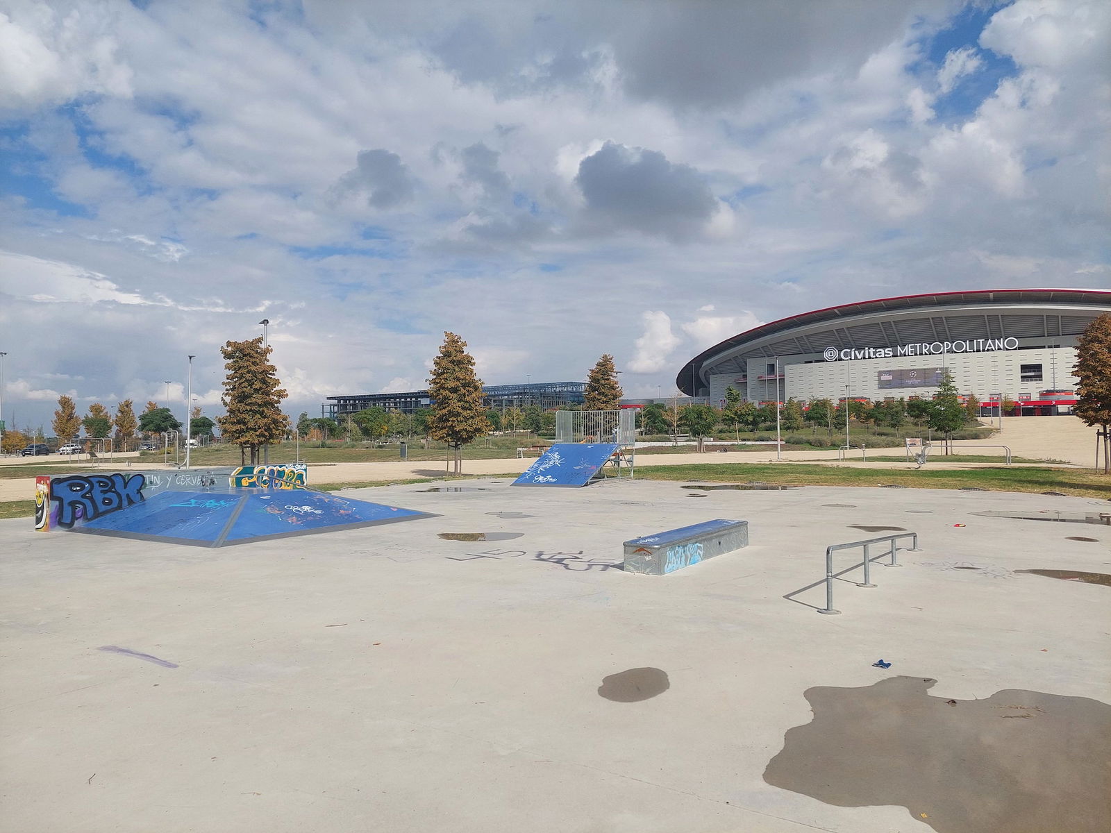 Estadio Metropolitano skatepark is a small park with several basic skateboarding obstacles in a back and forth setup.