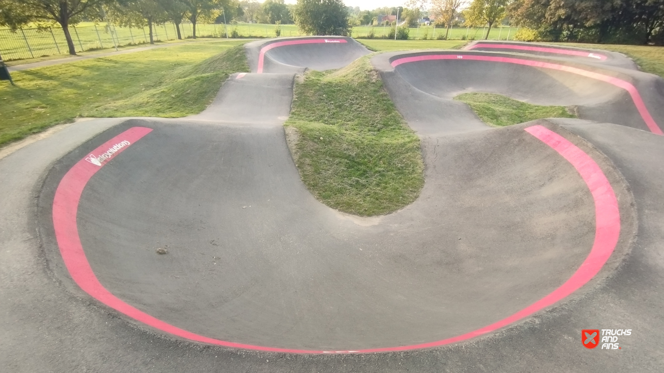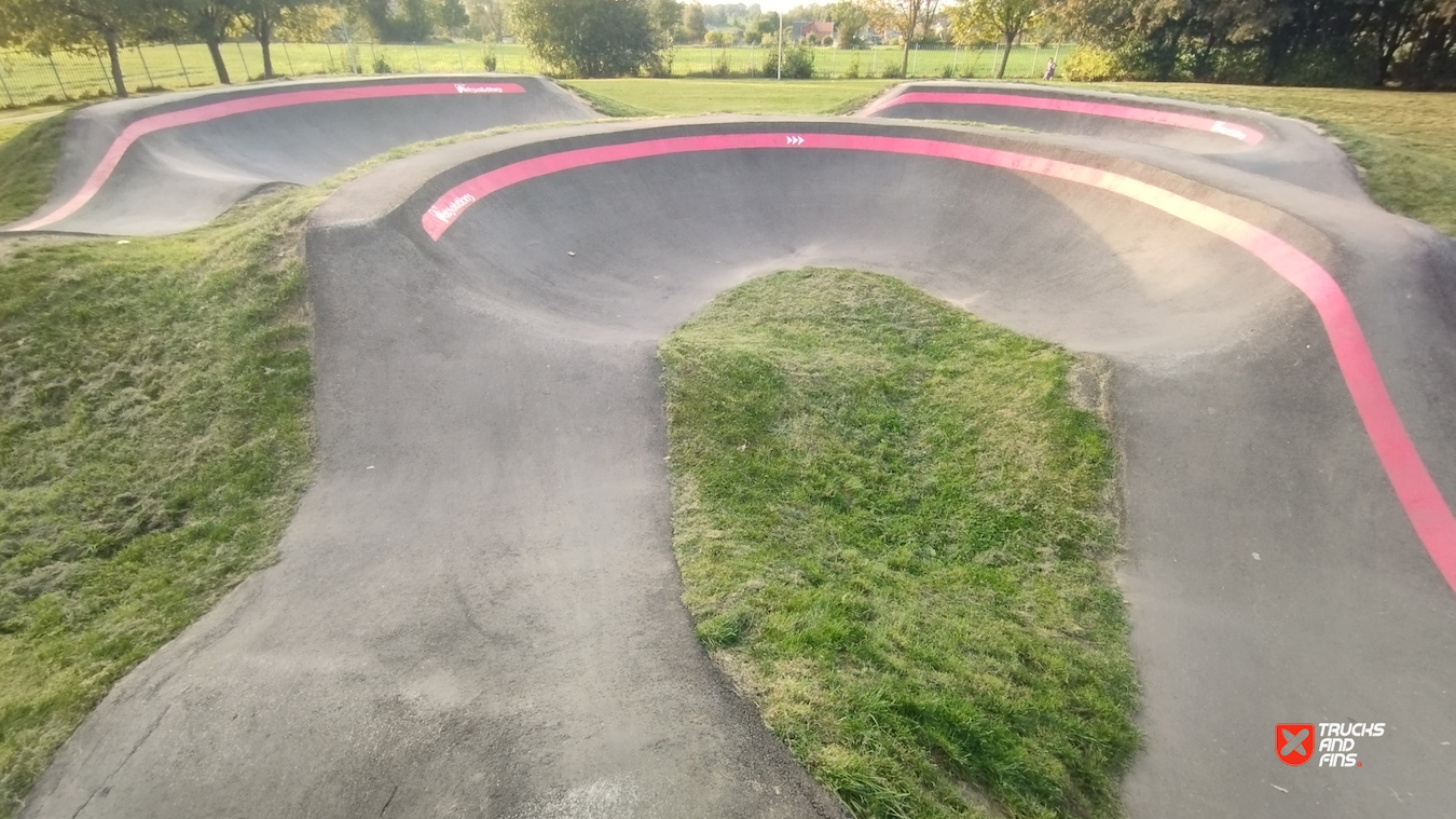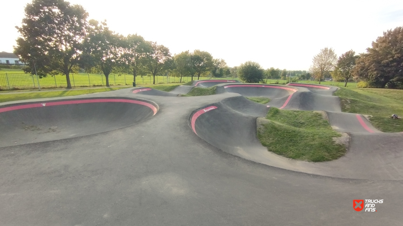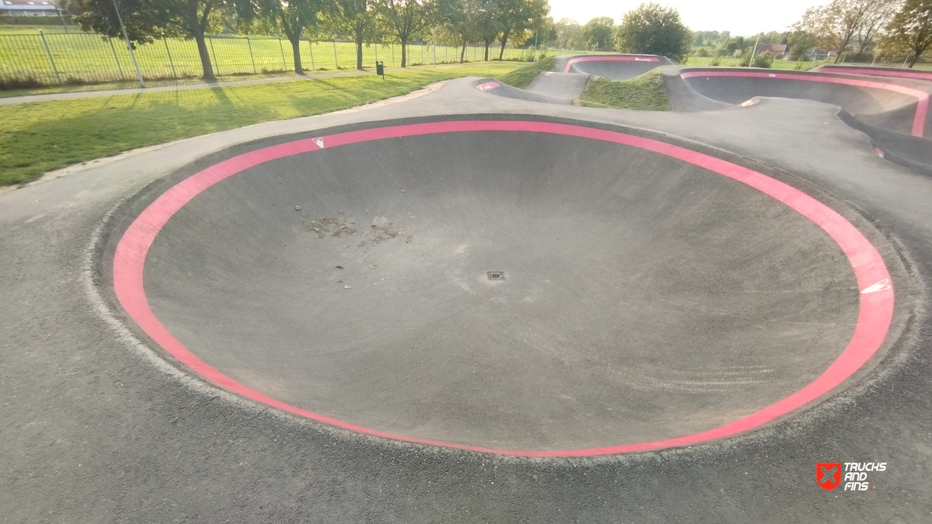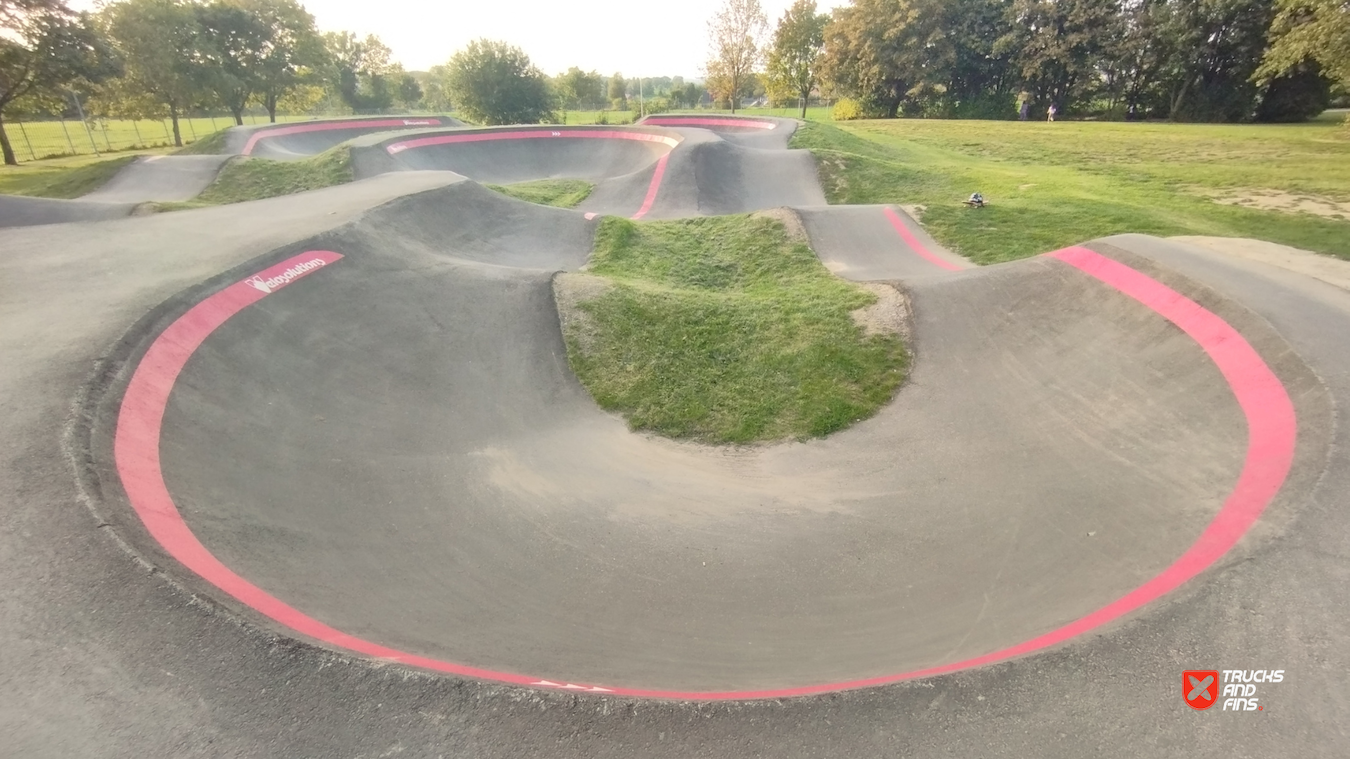 Excellent pumptrack with intense layout: has many bumps, corners and angled slopes. The pool section is fun.