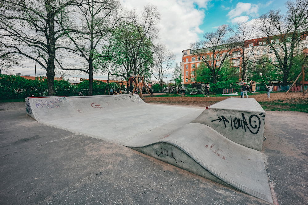 Forckenbeckplatz skatepark features a miniramp, built in a playground for kids.