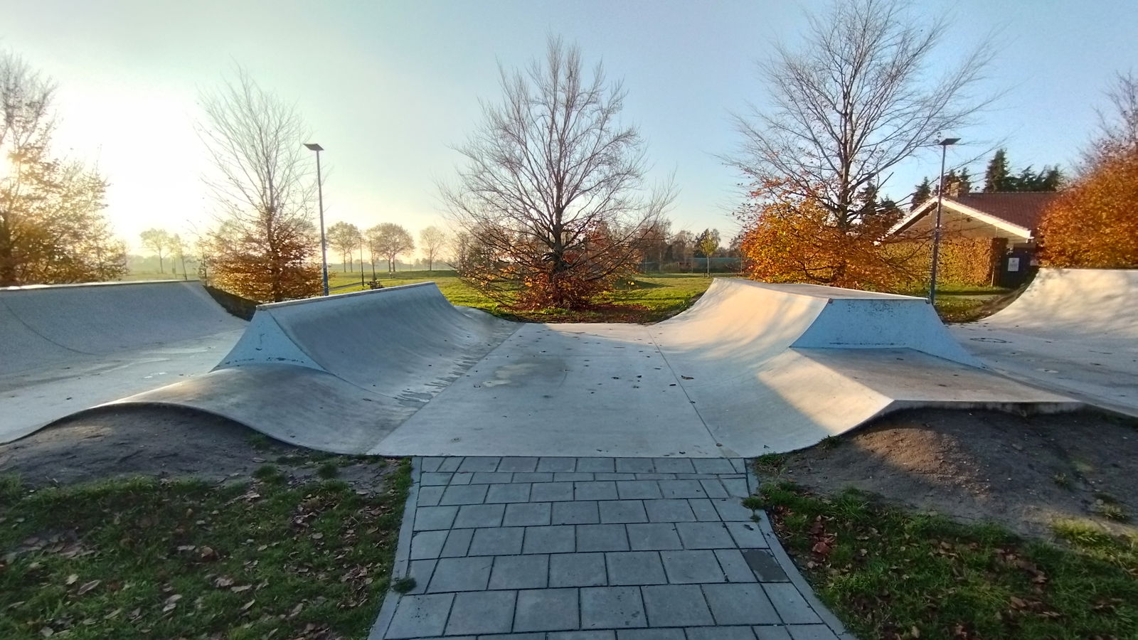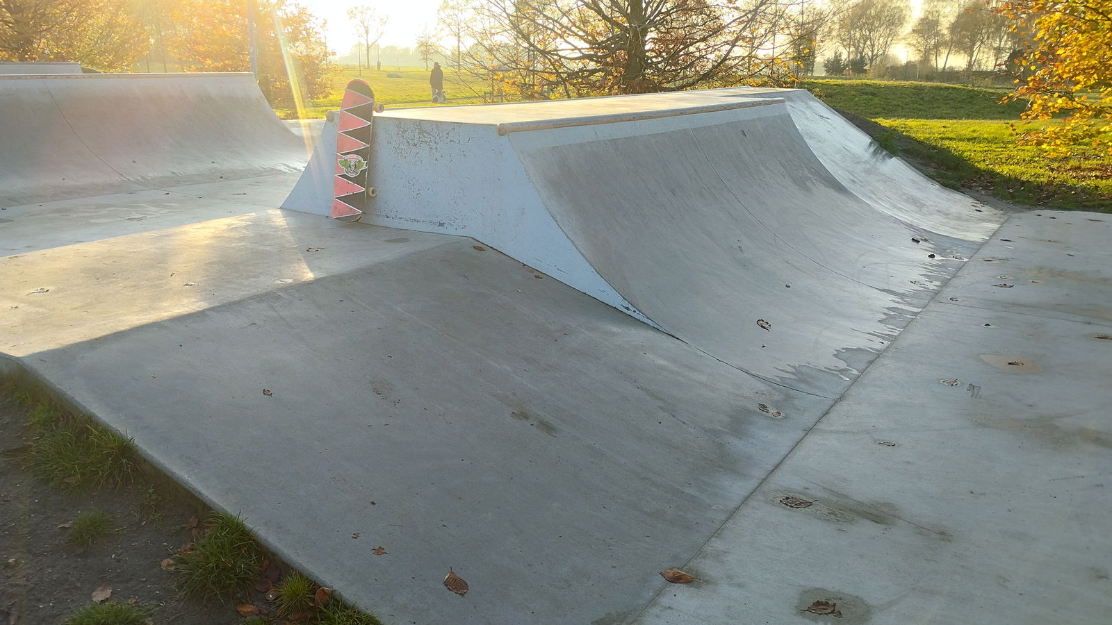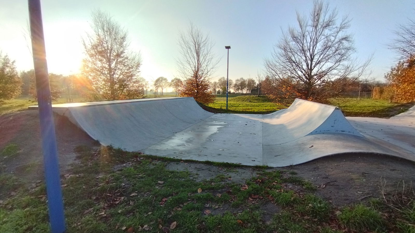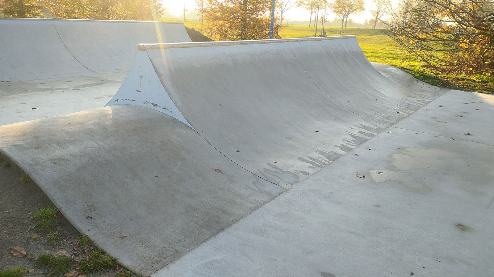 Gilze skatepark features a concrete miniramp with spine and jumpbox.