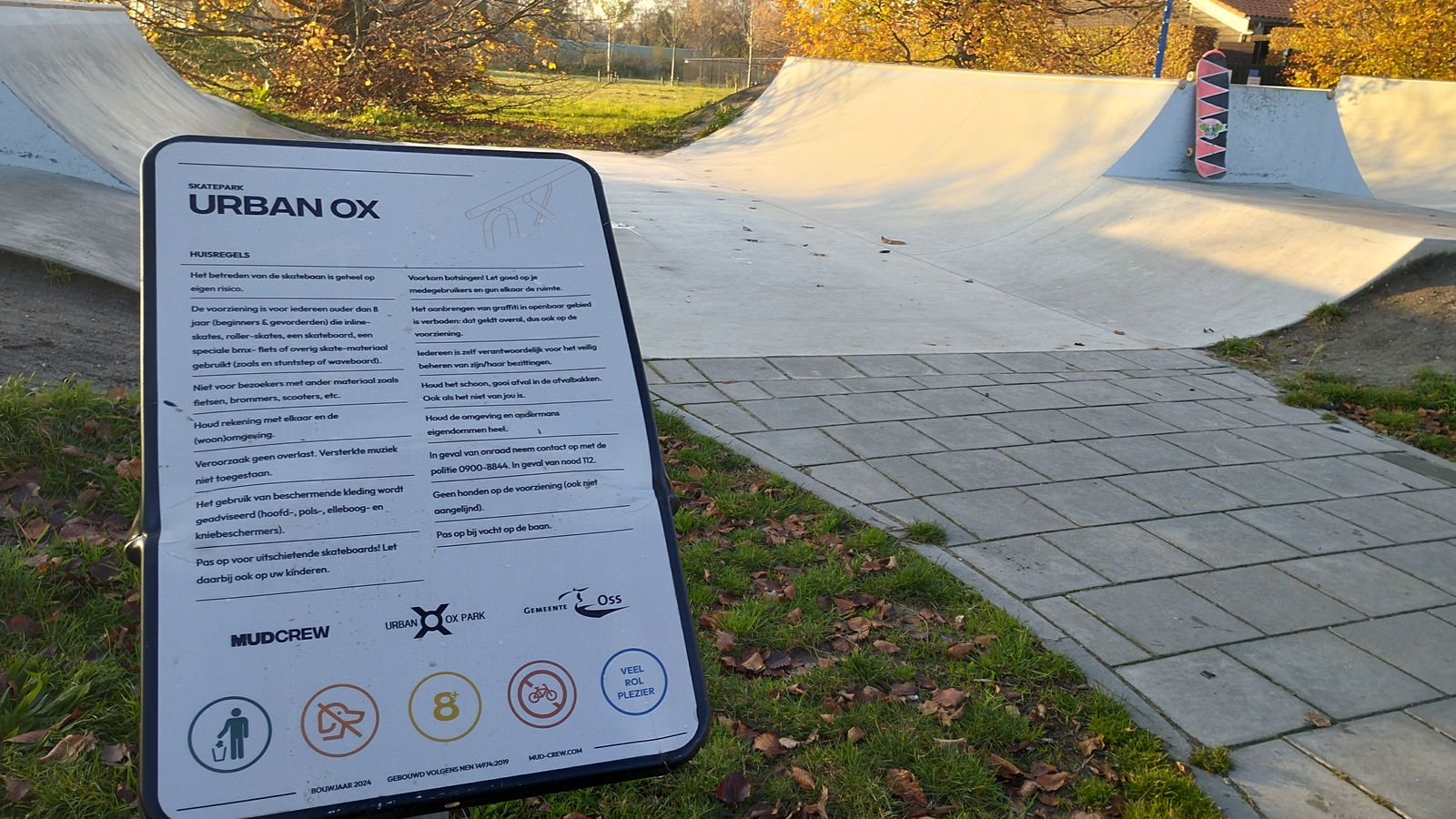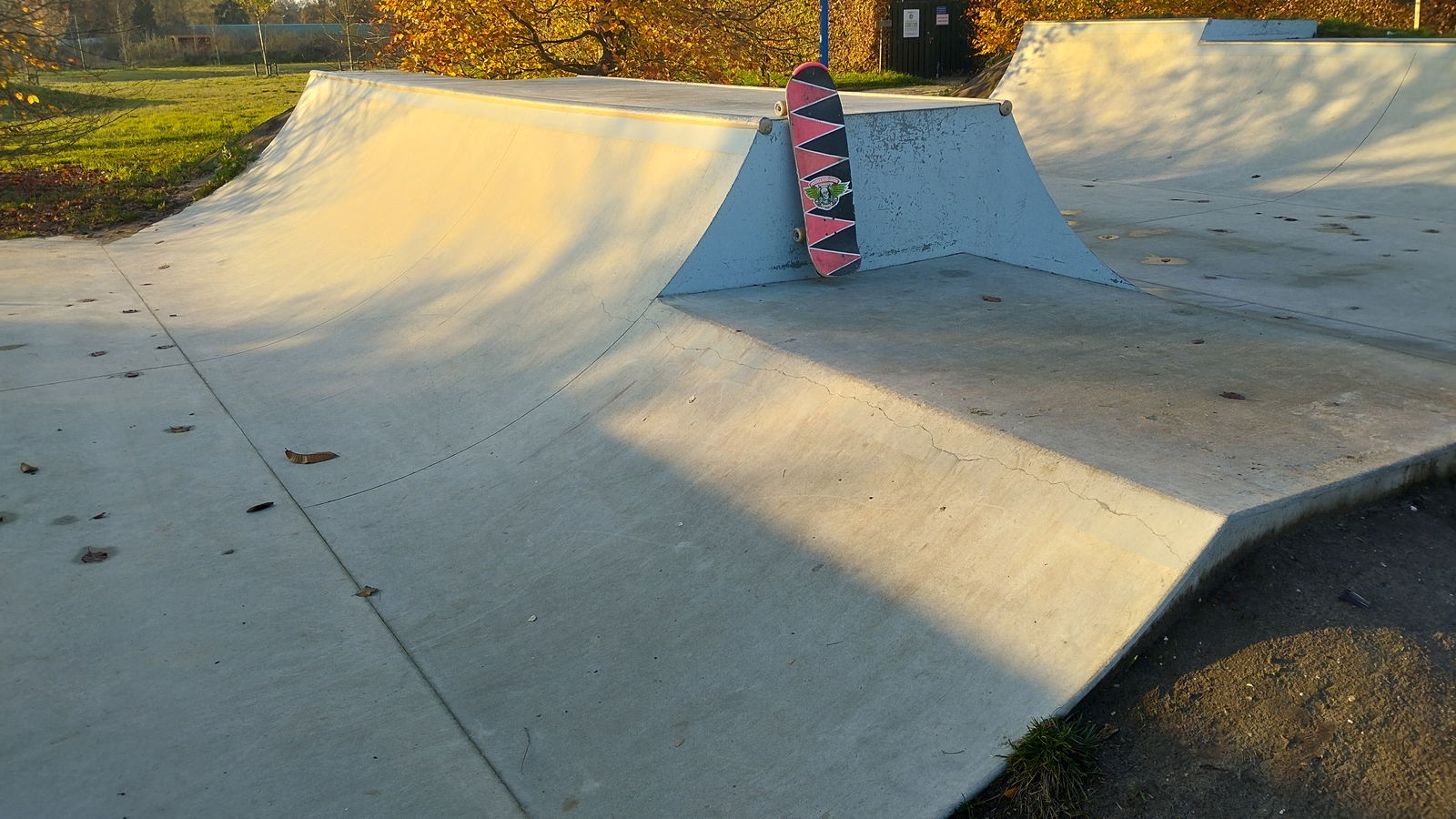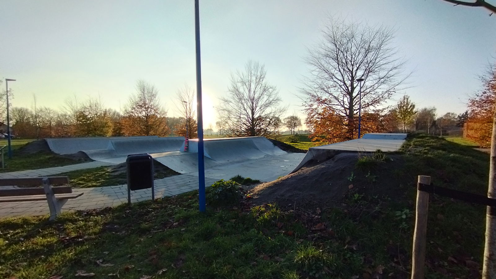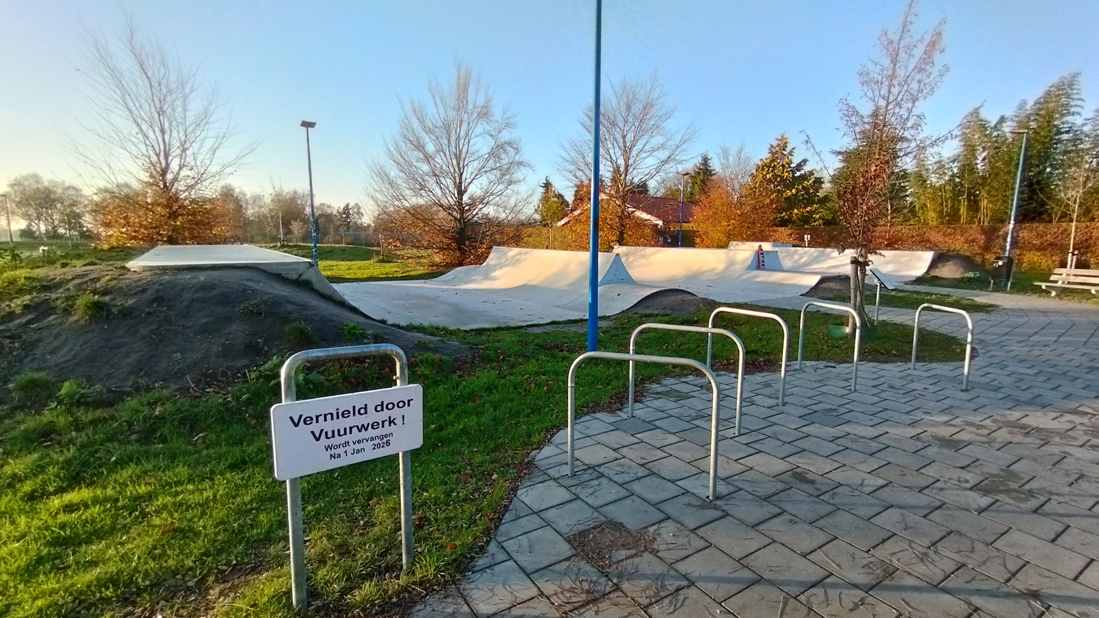 Gilze skatepark features a concrete miniramp with spine and jumpbox.