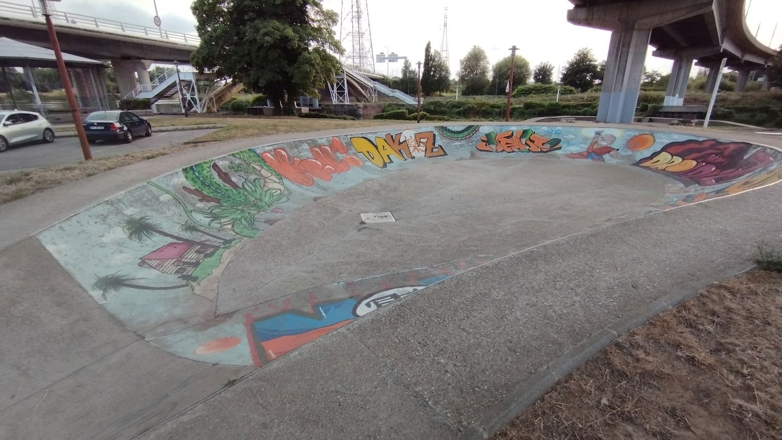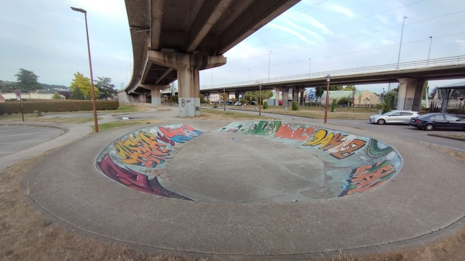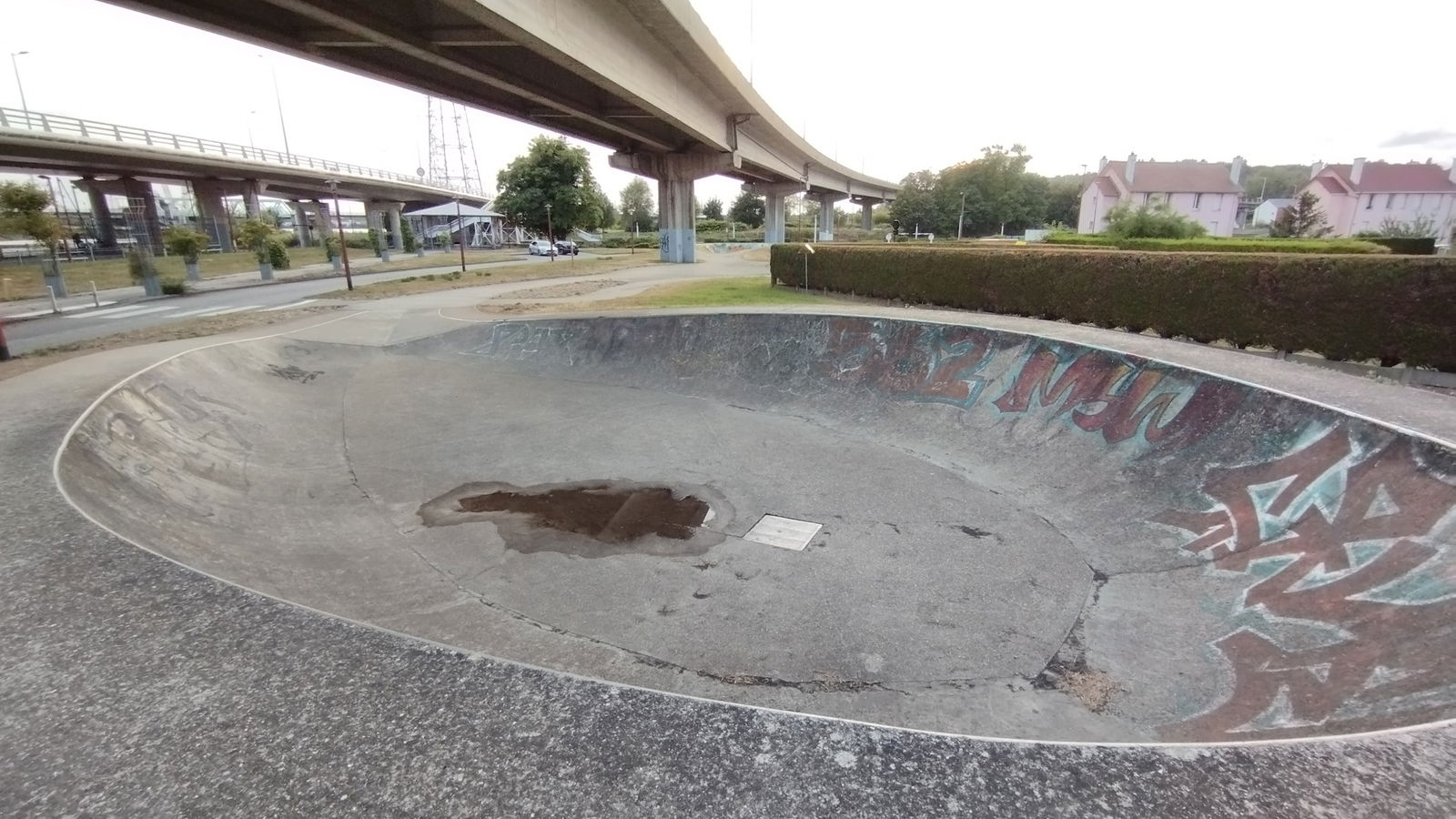 Gonfreville-l'Orcher skatepark features an open bowl and is located under a bridge overpass.