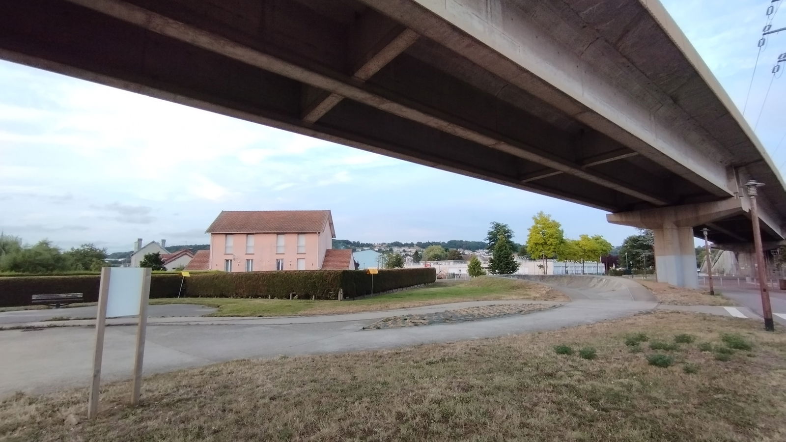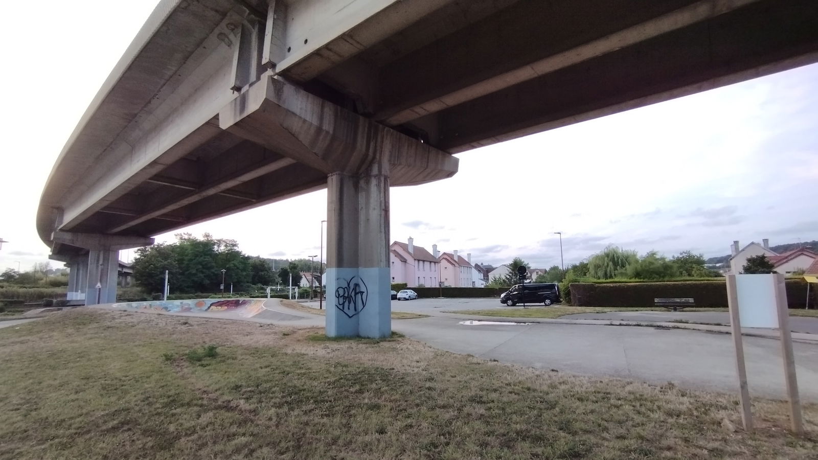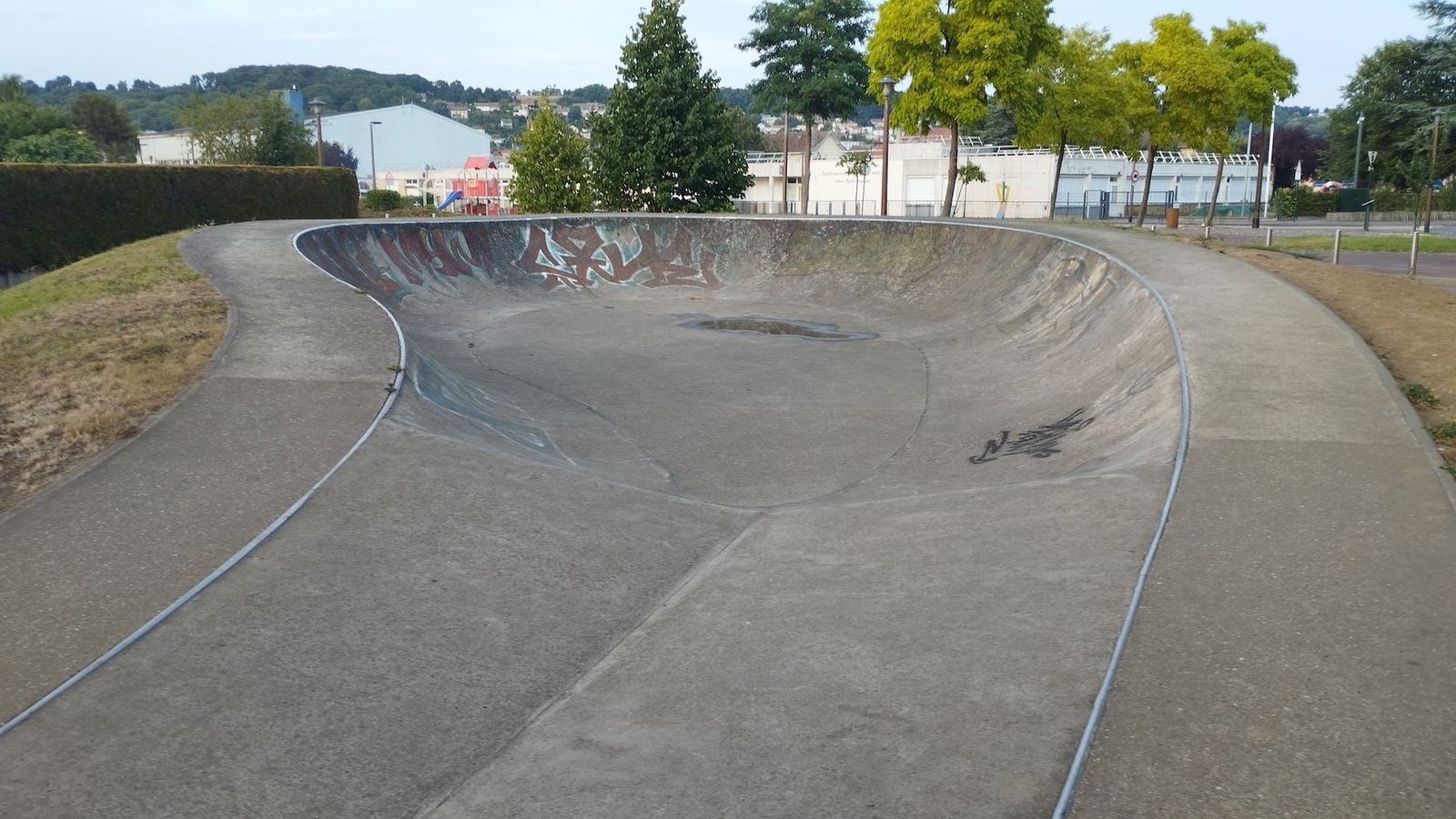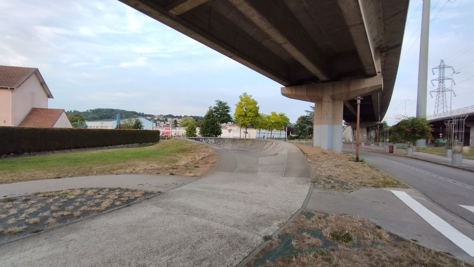 Gonfreville-l'Orcher skatepark features an open bowl and is located under a bridge overpass.