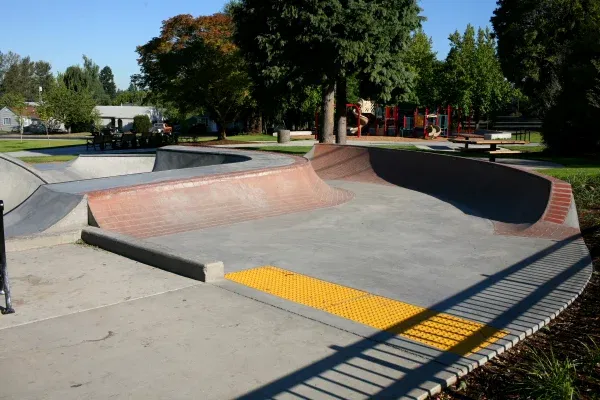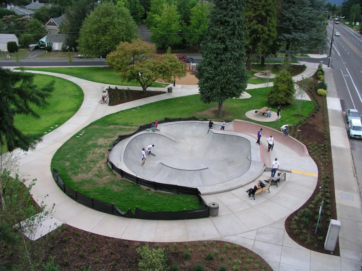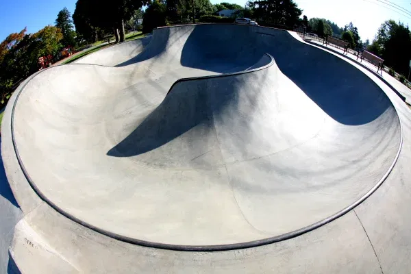 Holly Farm Park skatepark features a concrete bowl. The skatepark was built by Dreamland Skateparks.