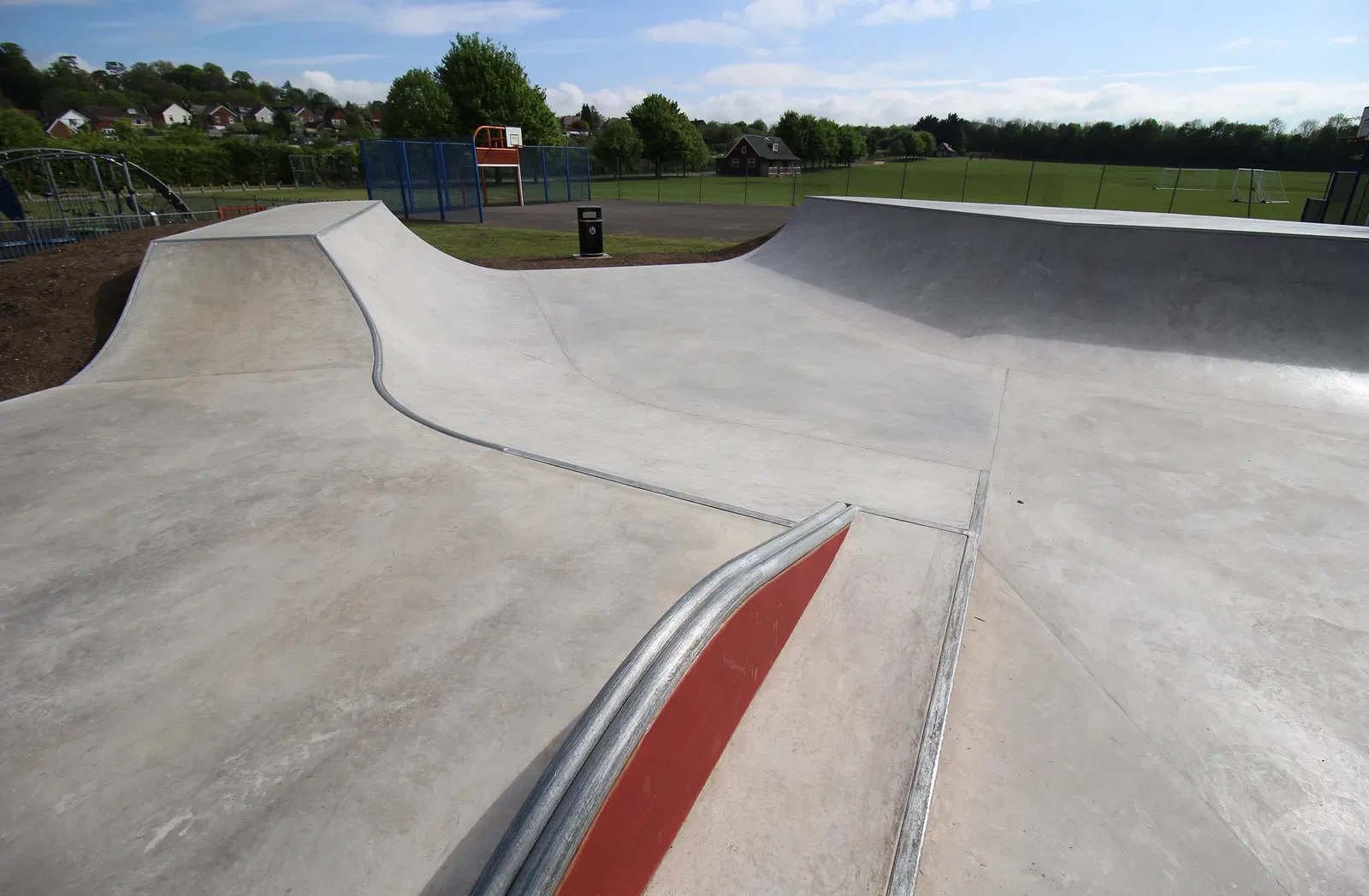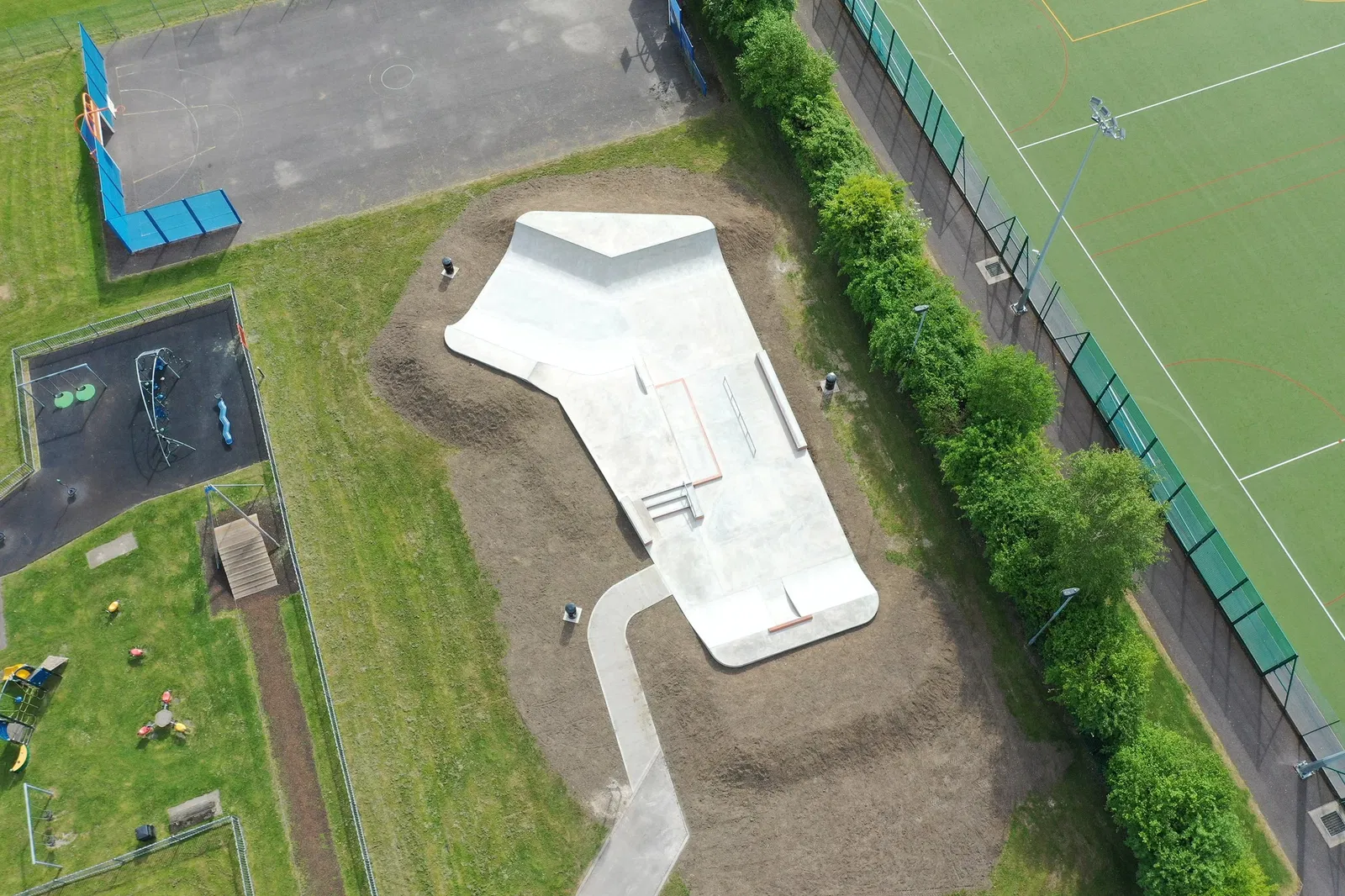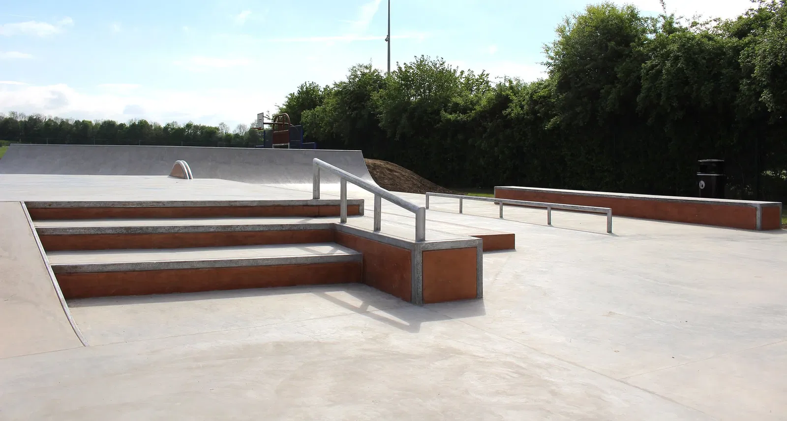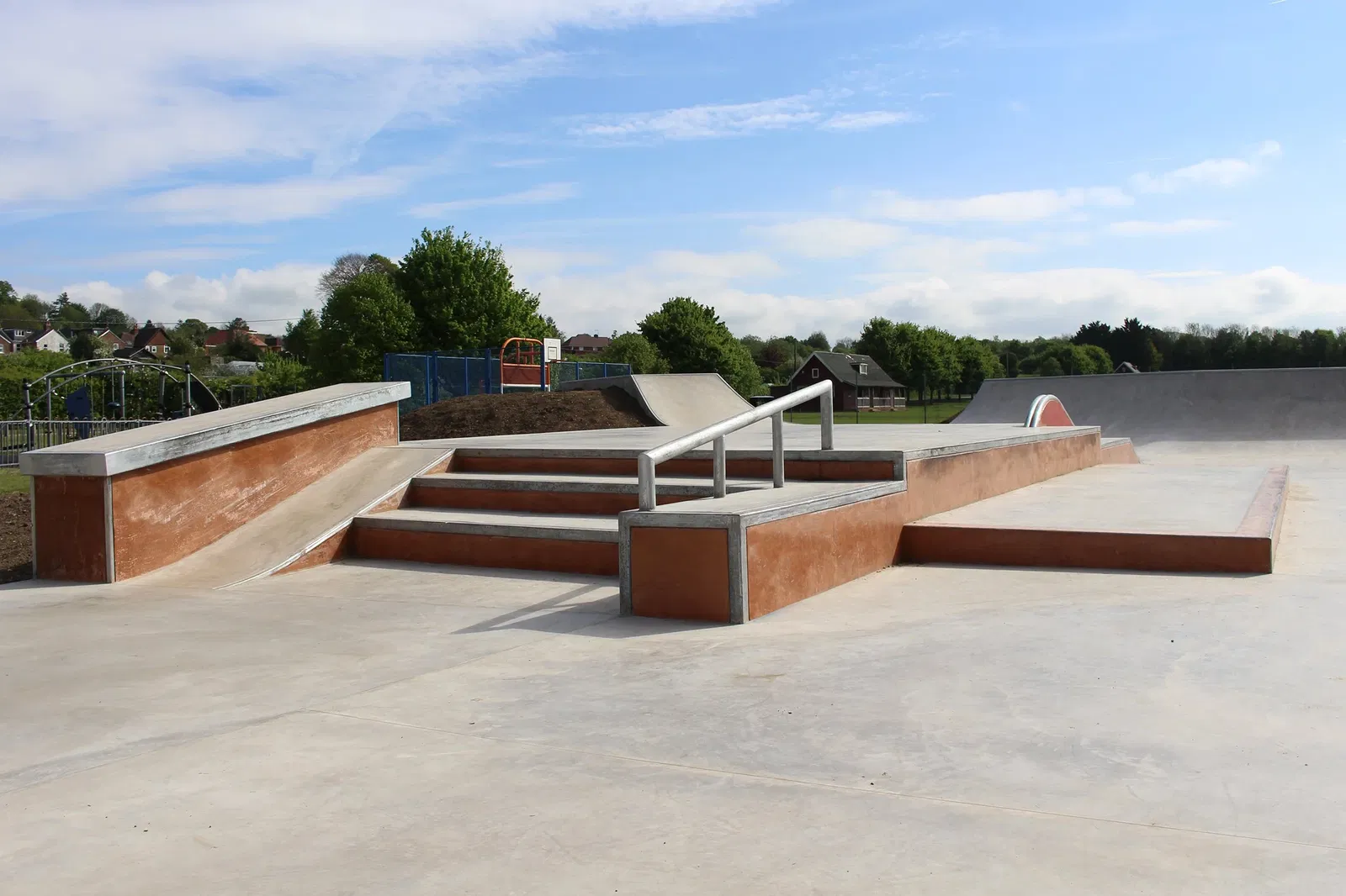 KGV skatepark features a miniramp and several basic skateboarding obstacles in a back and forth setup. The skatepark was built by Maverick skateparks in 2022.