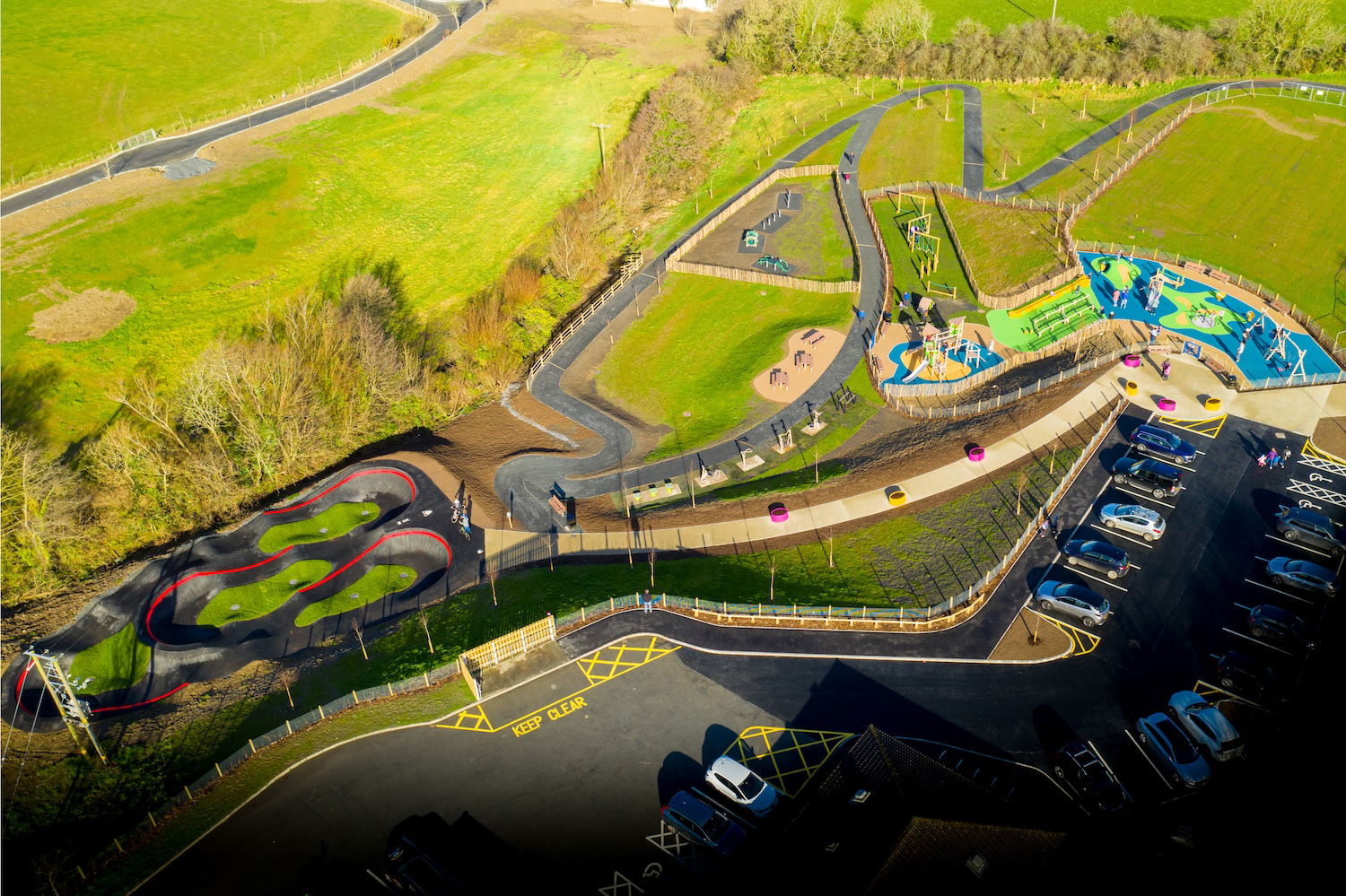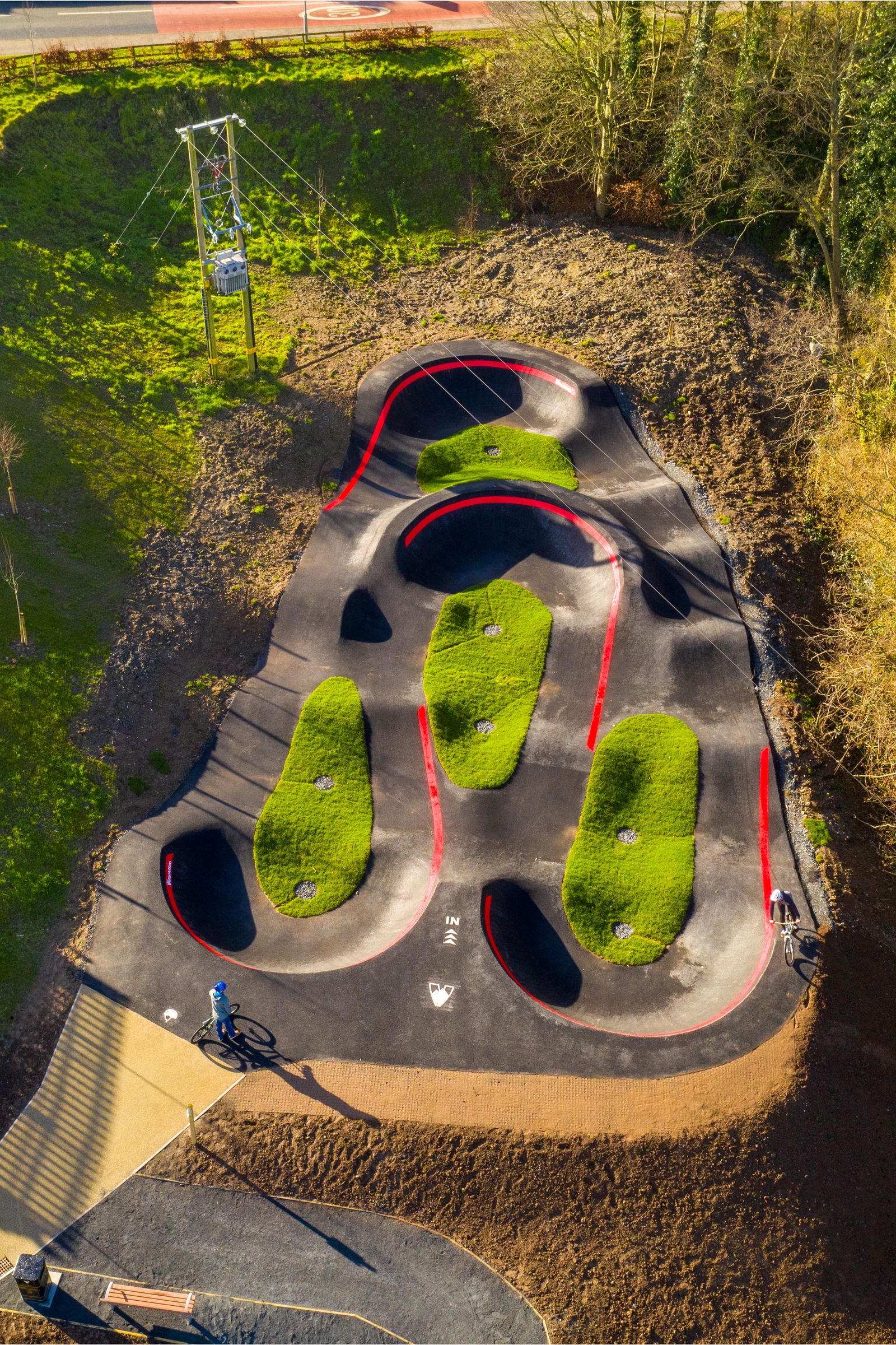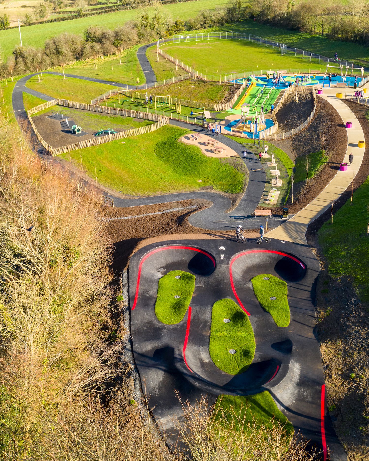 Killinchy pumptrack is an asphalt bike and skateboarding track built by VelosolutionsUK. Northern Ireland’s first Velosolutions pumptrack 110m in length! It complements the existing multi-use trail facilities in the Town Park. It features adjacent berms and jump/rhythm straights.