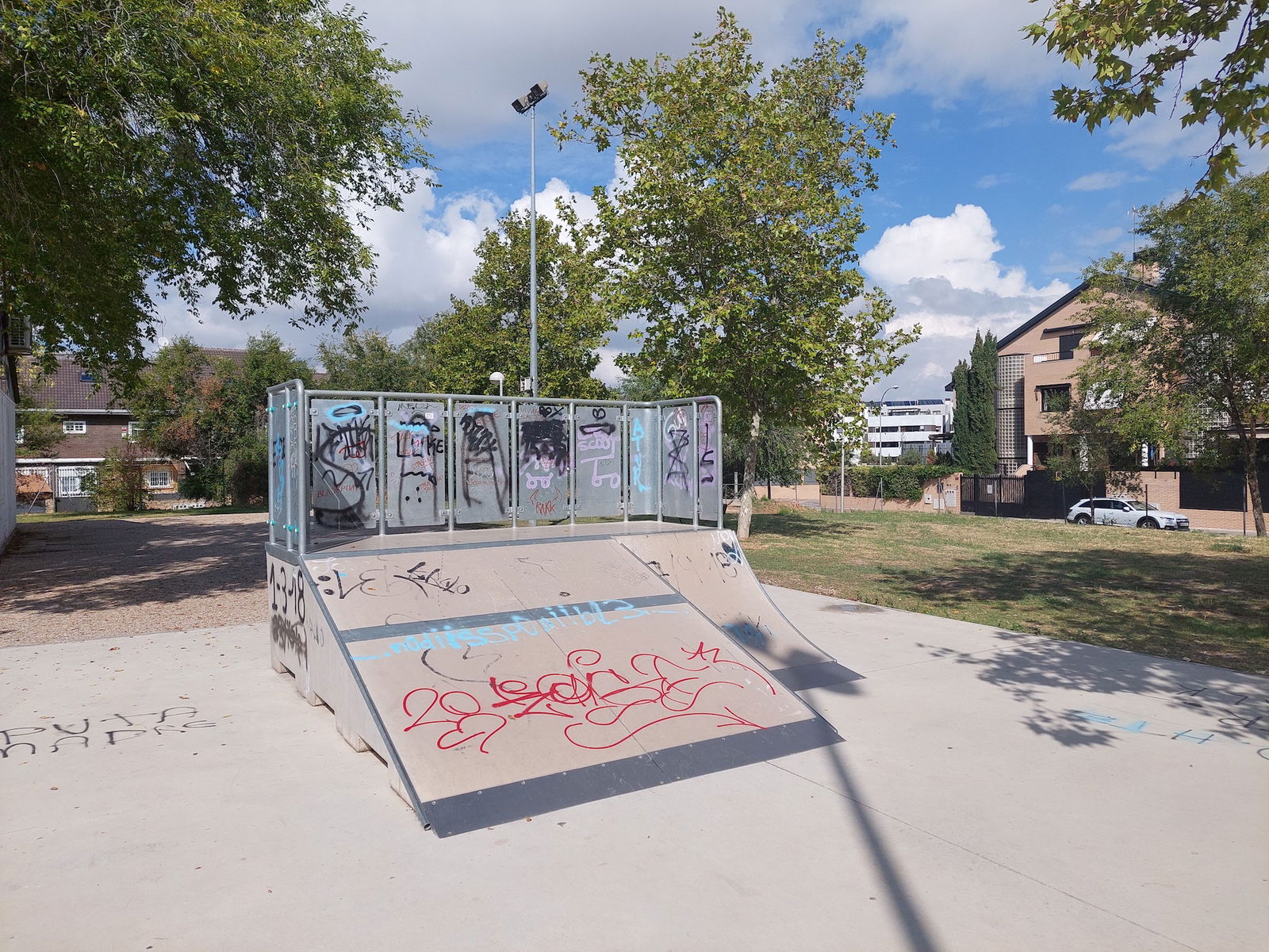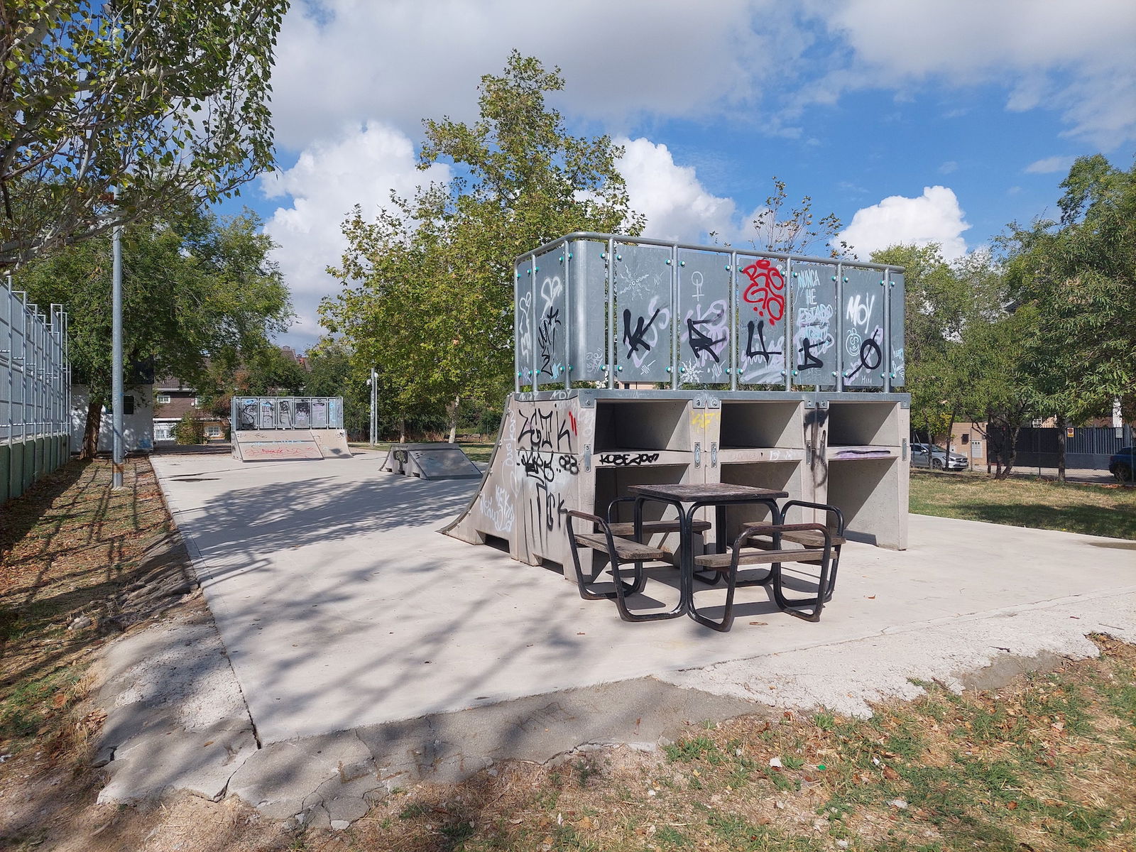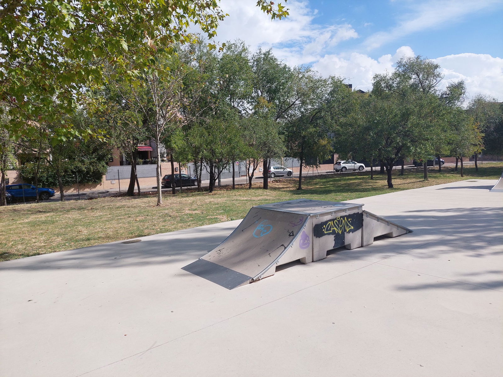 Las Carcavas skatepark is a small park with several basic skateboarding obstacles in a back and forth setup.