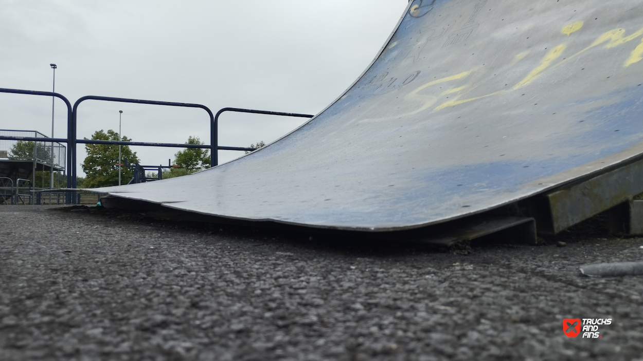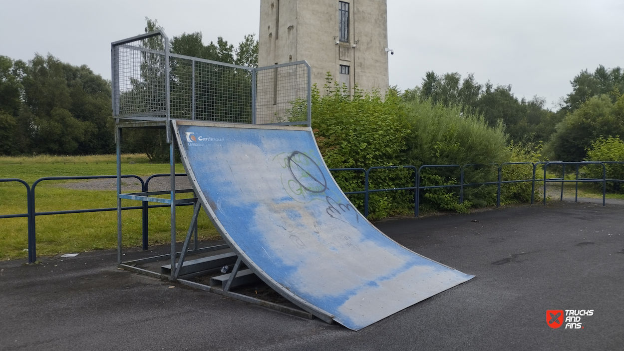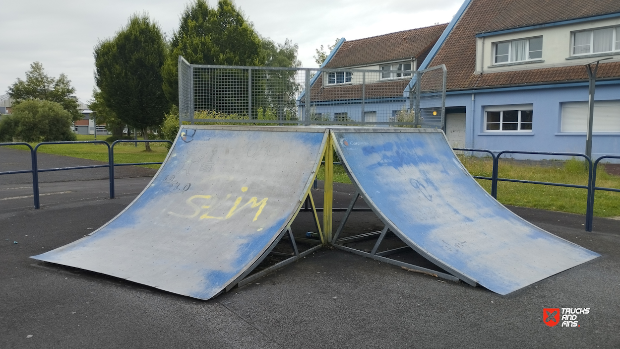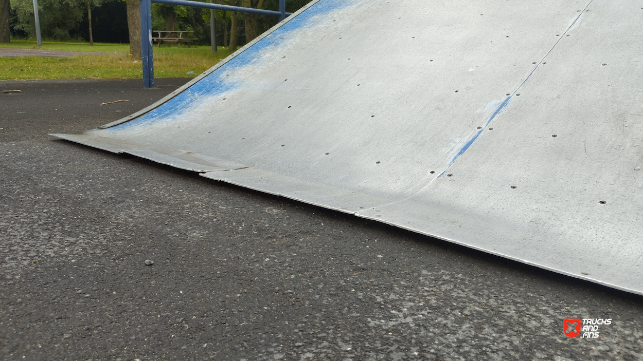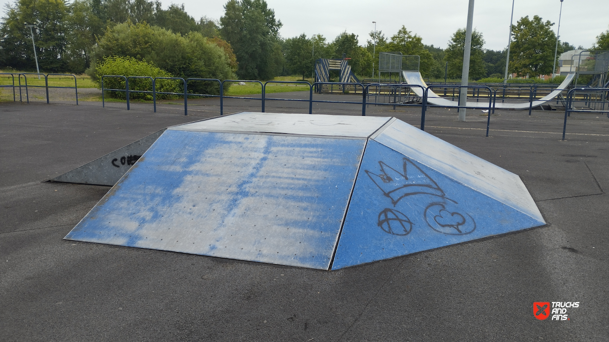 Leval skatepark, aka Skatepark de la Florentine, features a miniramp and several basic skateboarding obstacles in a back and forth setup.