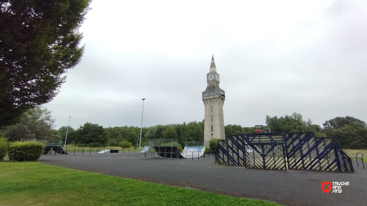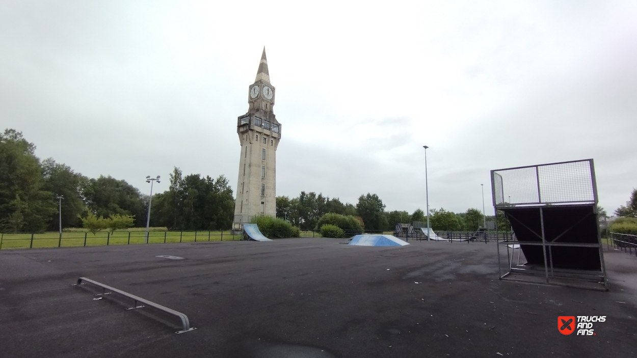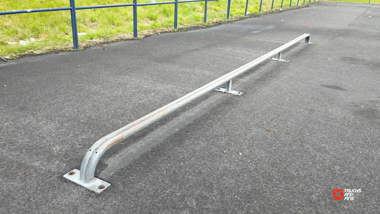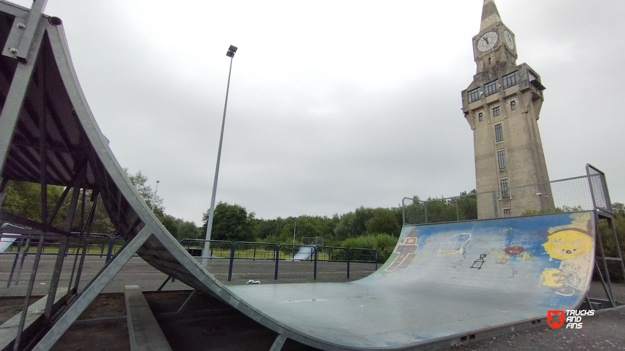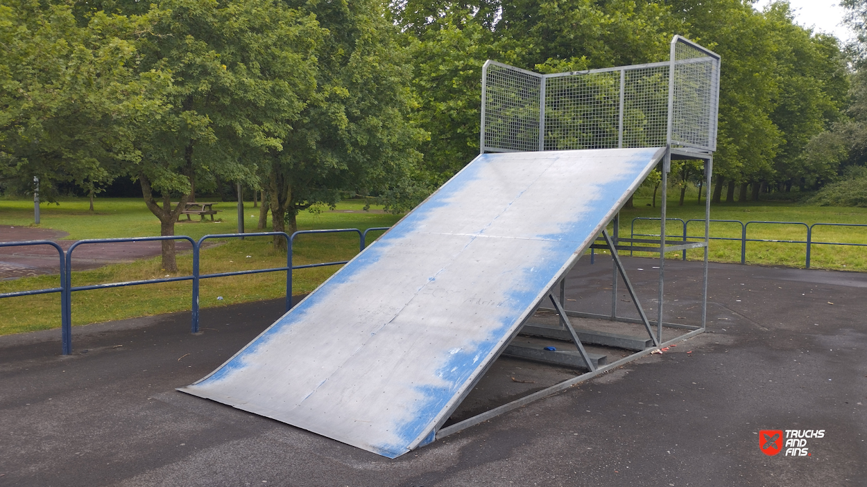 Leval skatepark, aka Skatepark de la Florentine, features a miniramp and several basic skateboarding obstacles in a back and forth setup.