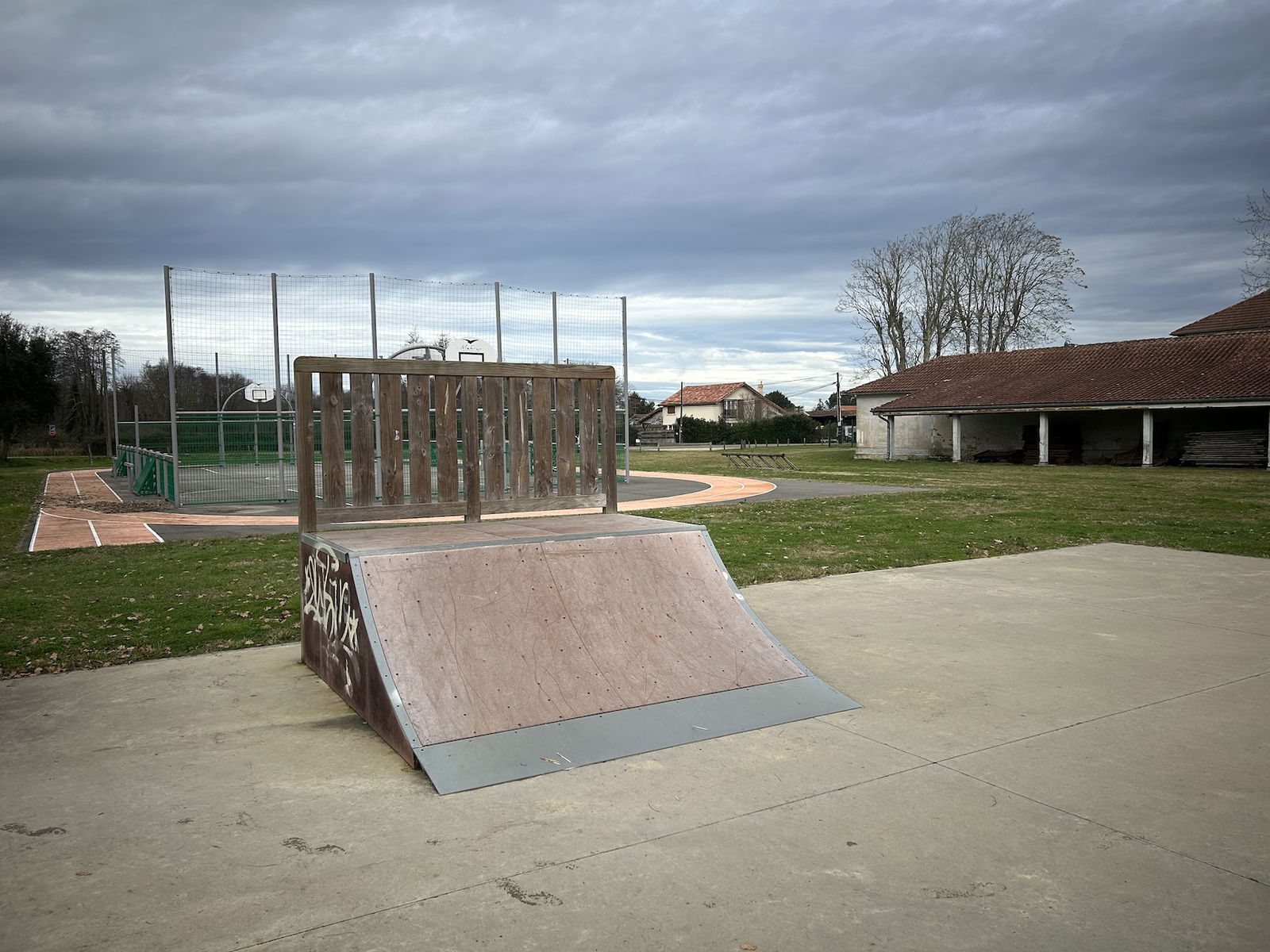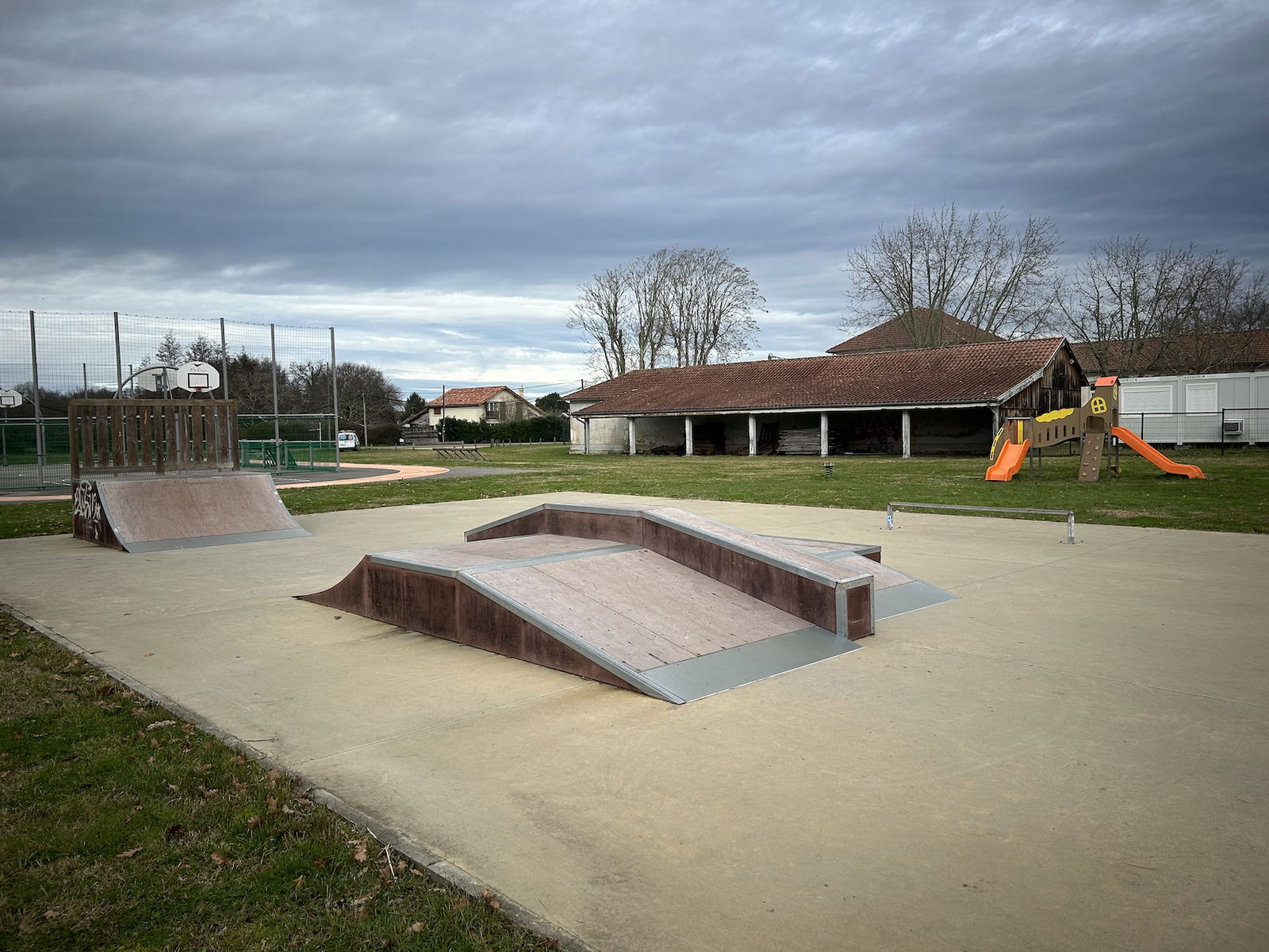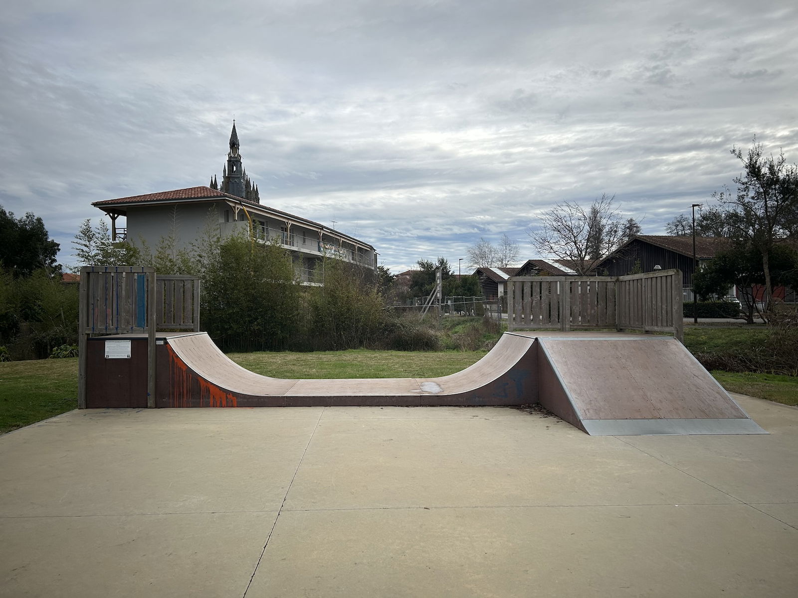 Lit-et-Mixe skatepark features a miniramp and several basic skateboarding obstacles in a back and forth setup.