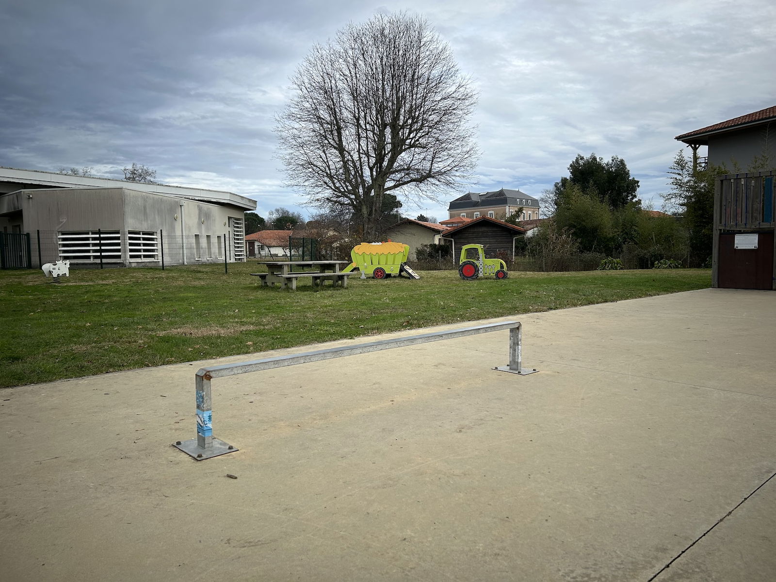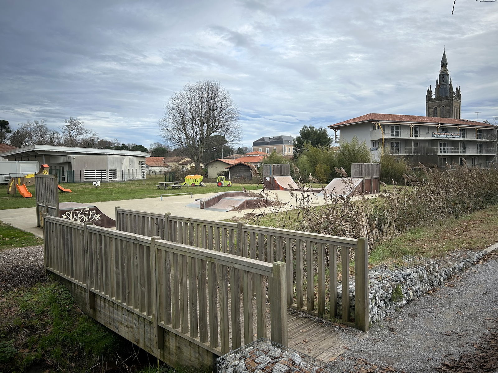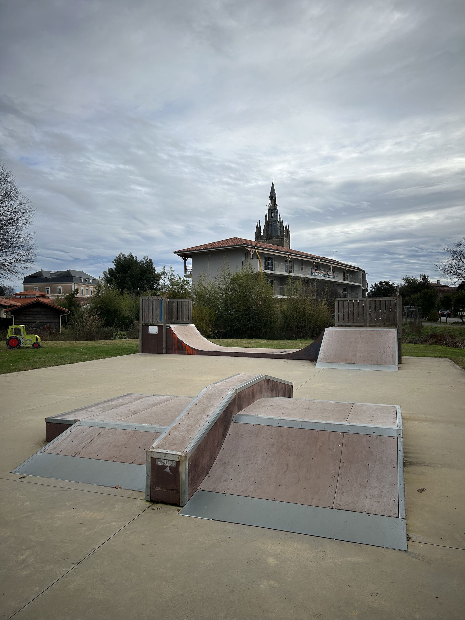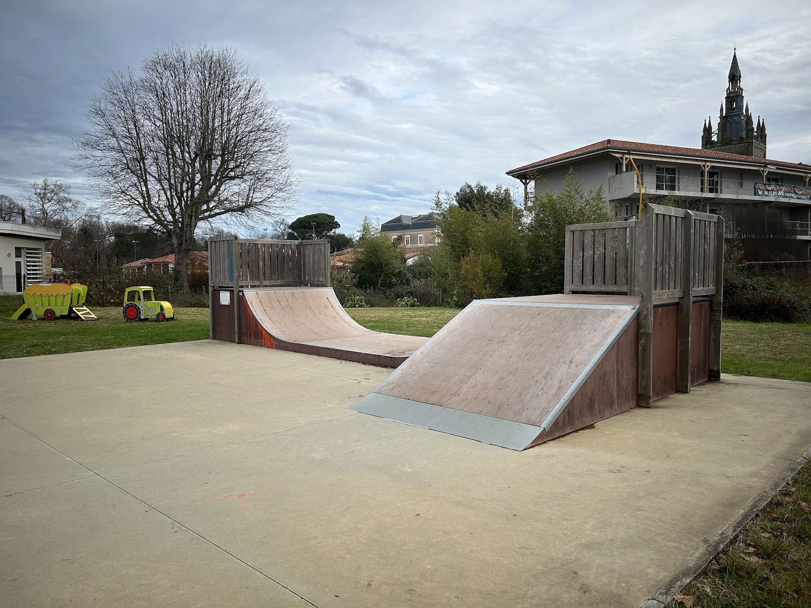 Lit-et-Mixe skatepark features a miniramp and several basic skateboarding obstacles in a back and forth setup.