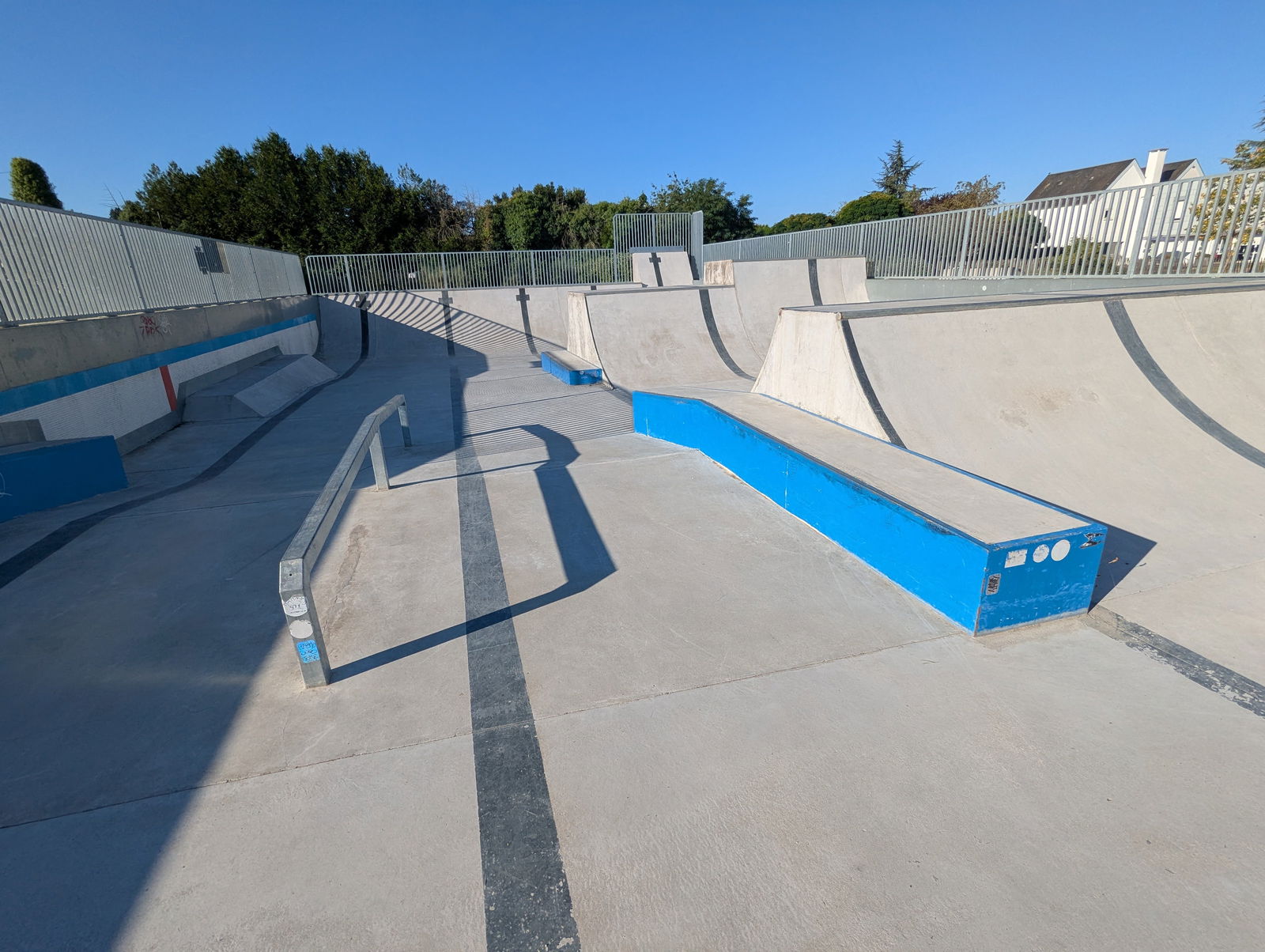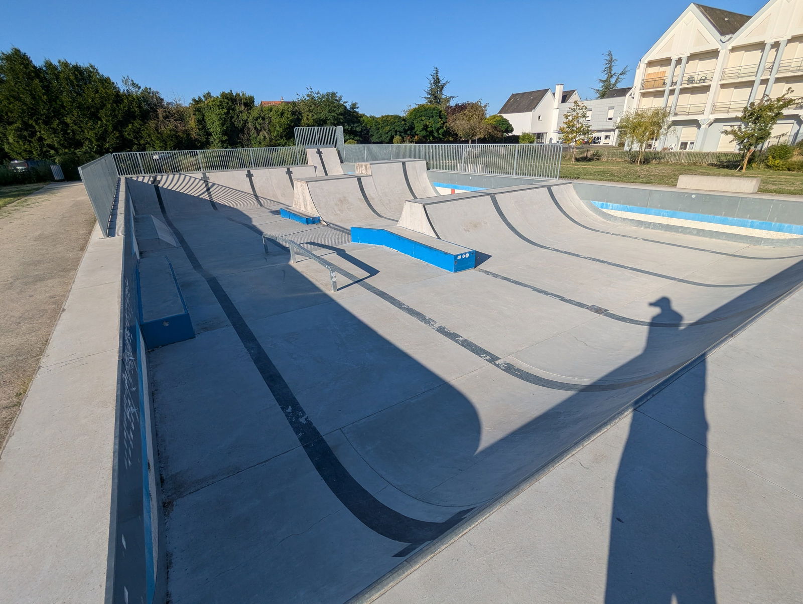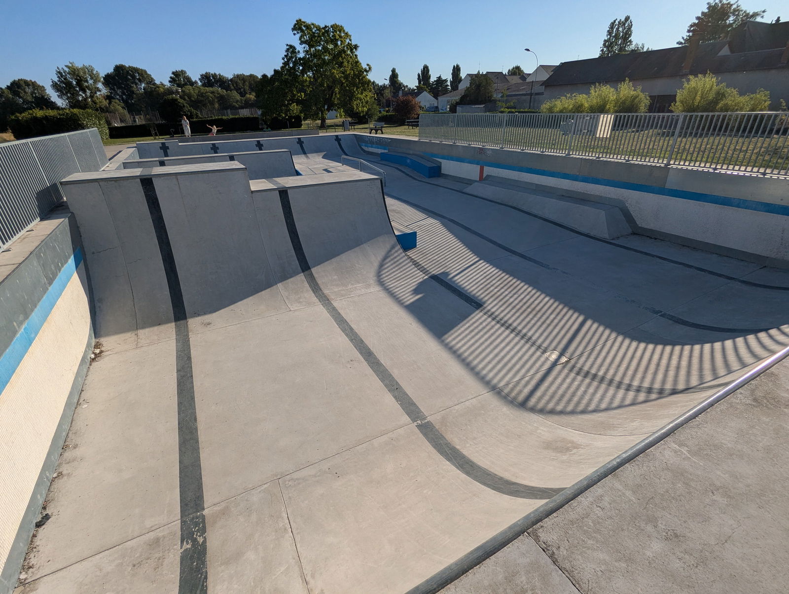 L'Île-Bouchard skatepark is a park built in an old outdoor swimming pool. There are some street elements, but the park is mainly based on transition elements with different hight halfpipes. The old swimming pool lane markers are painted onto the skatepark as a reminder of its former identity.