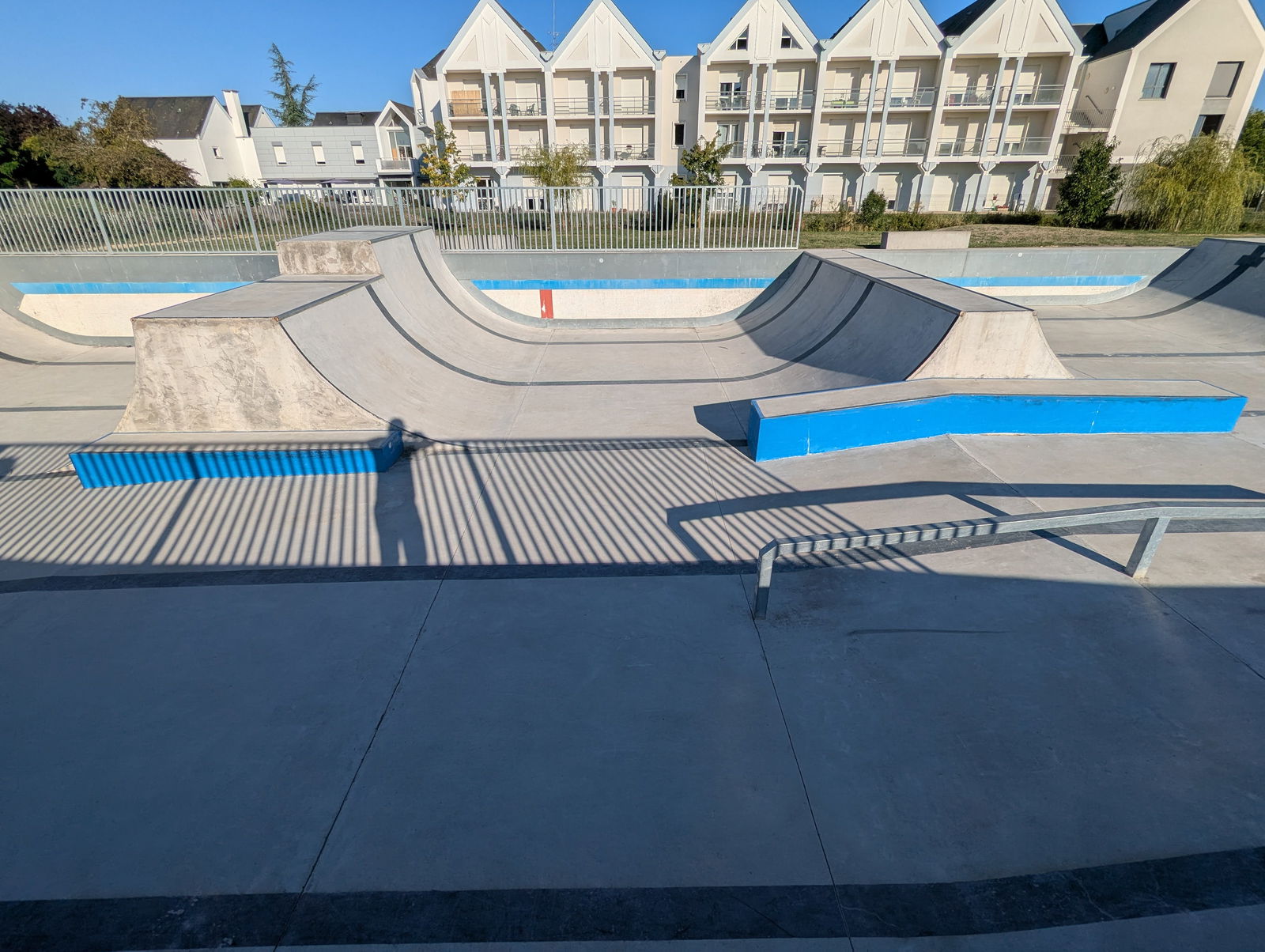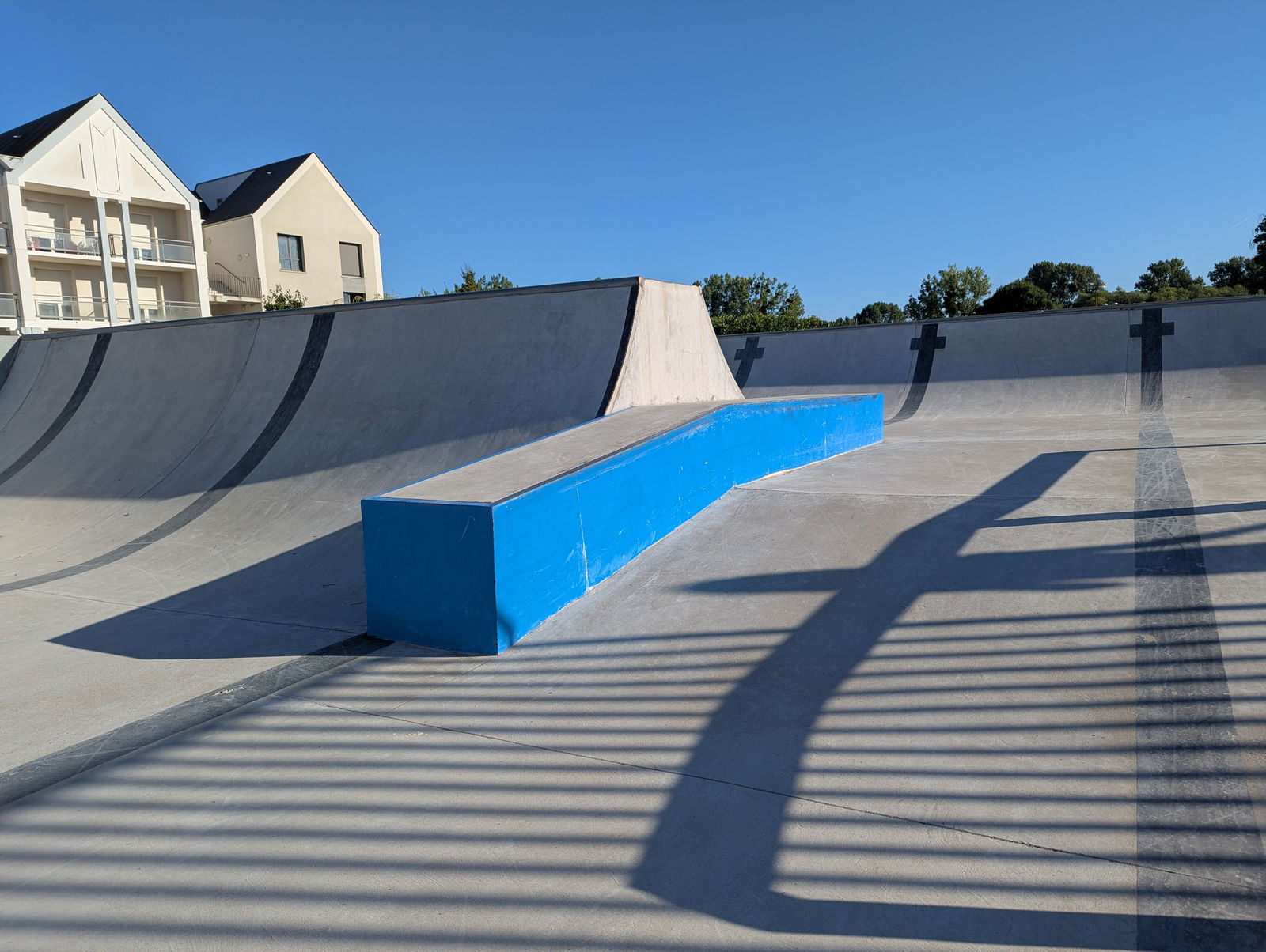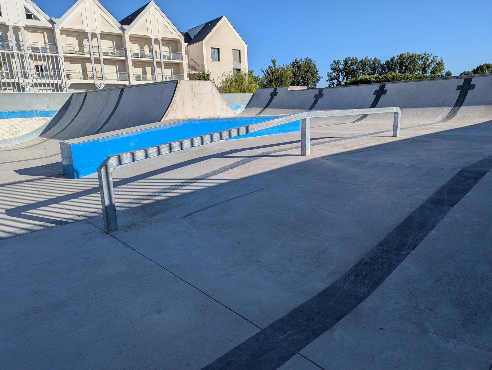 L'Île-Bouchard skatepark is a park built in an old outdoor swimming pool. There are some street elements, but the park is mainly based on transition elements with different hight halfpipes. The old swimming pool lane markers are painted onto the skatepark as a reminder of its former identity.