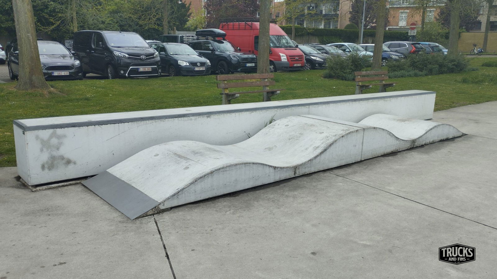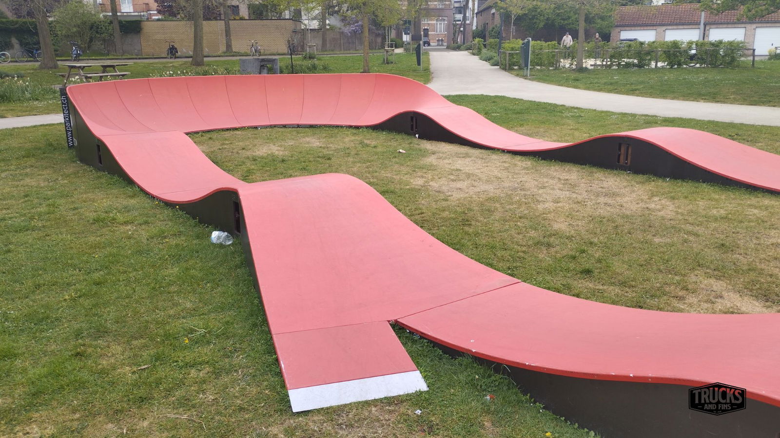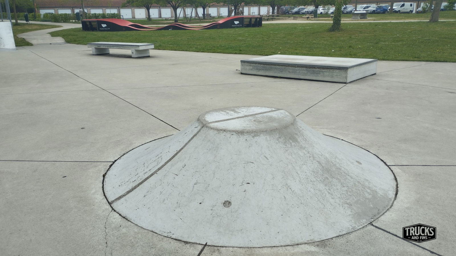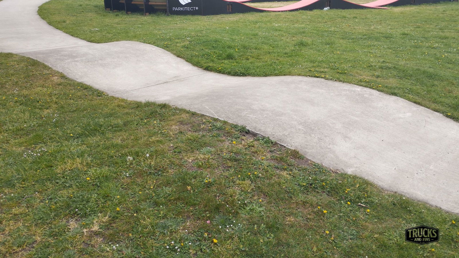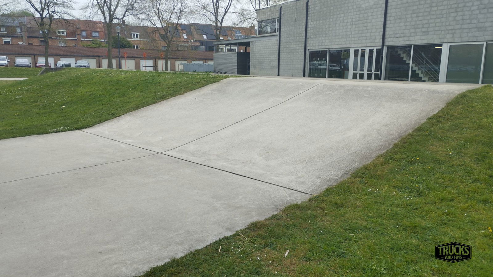 Smooth concrete but with 1cm seams in between, small volcano with a bad design, some obstacles of which a very steep bank.