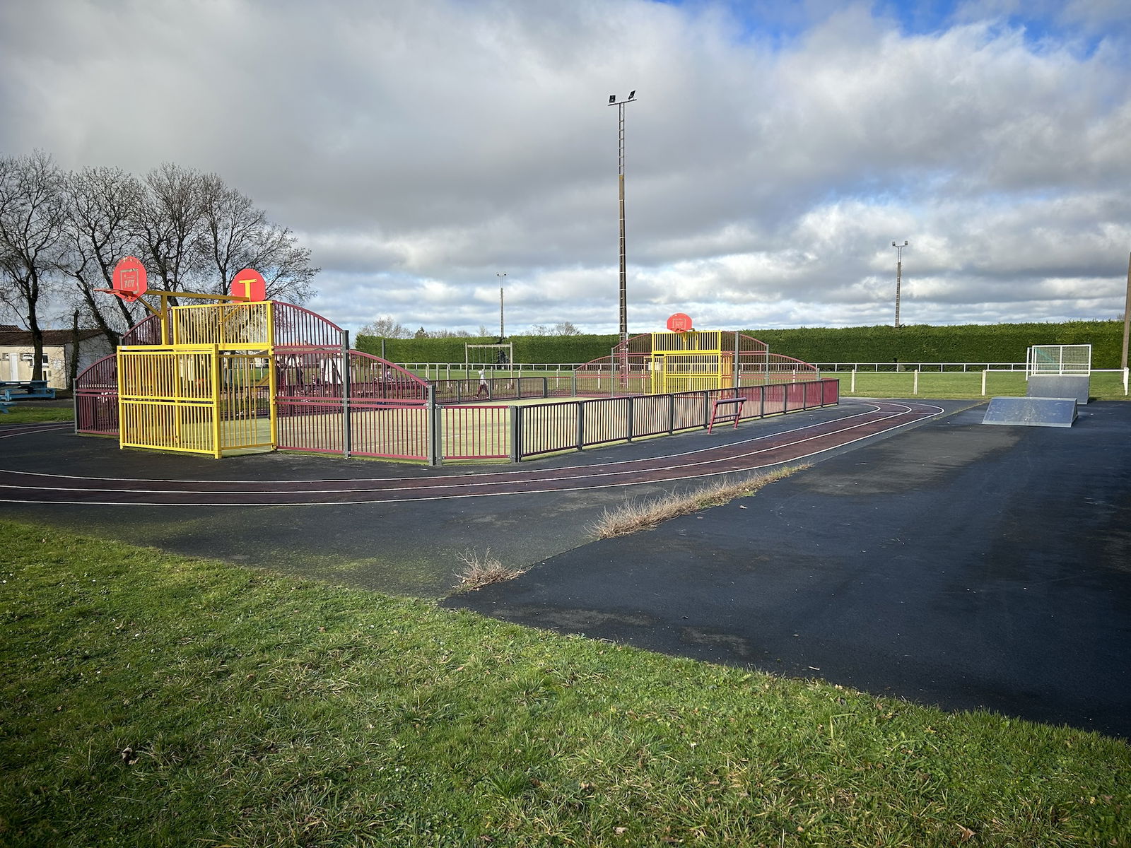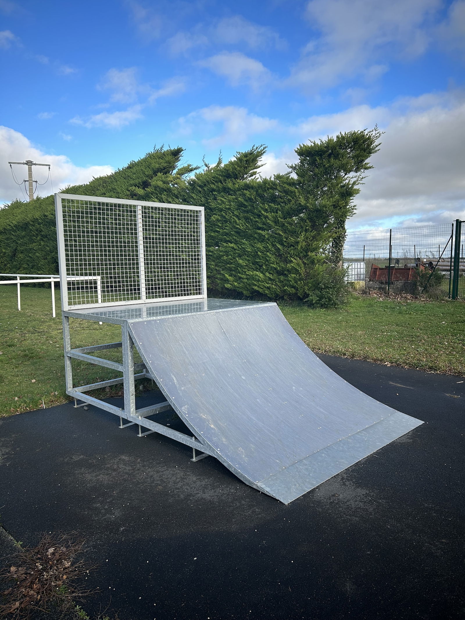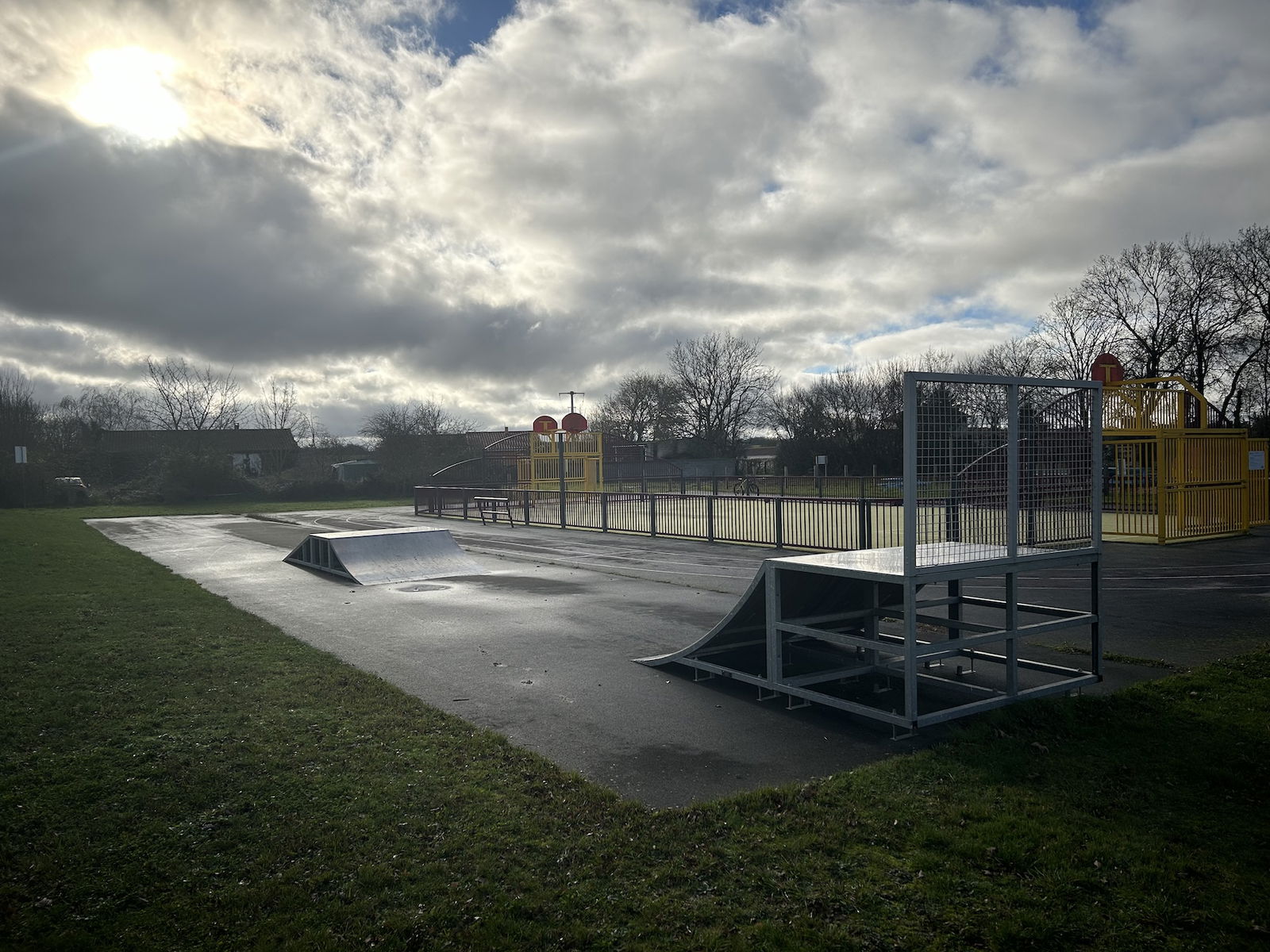 Marigny skatepark is a small park with several basic skateboarding obstacles in a back and forth setup.