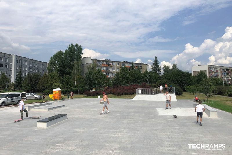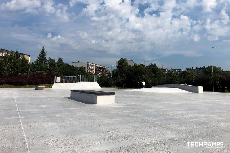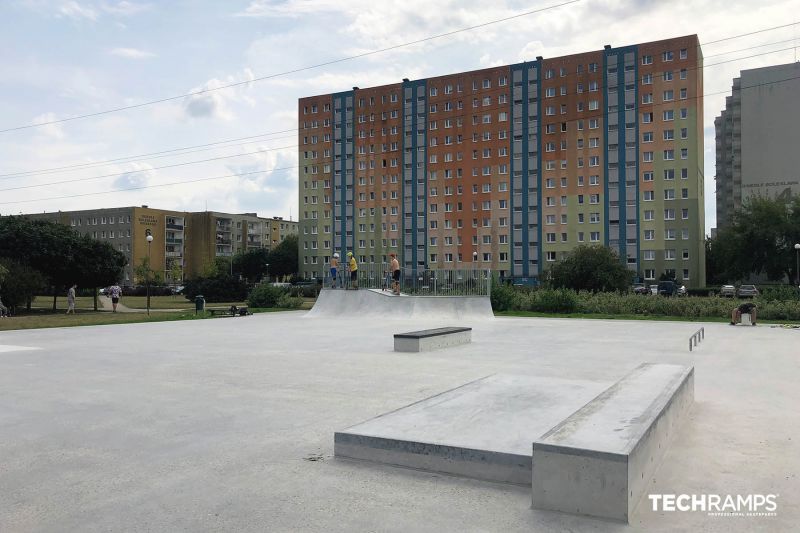 Międzyosiedlowy Skatepark is a concrete park with several basic skateboarding obstacles. The skatepark was built by Techramps.