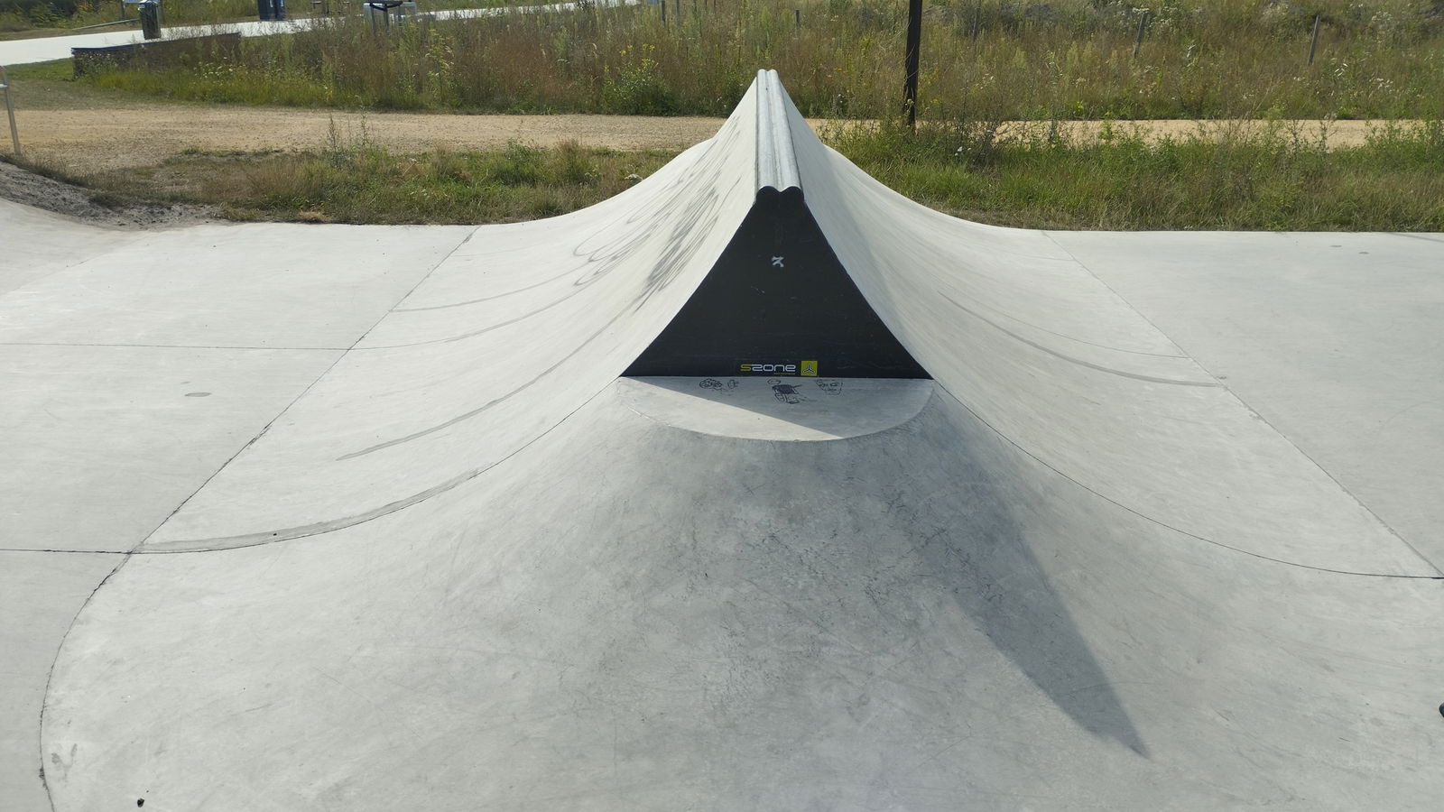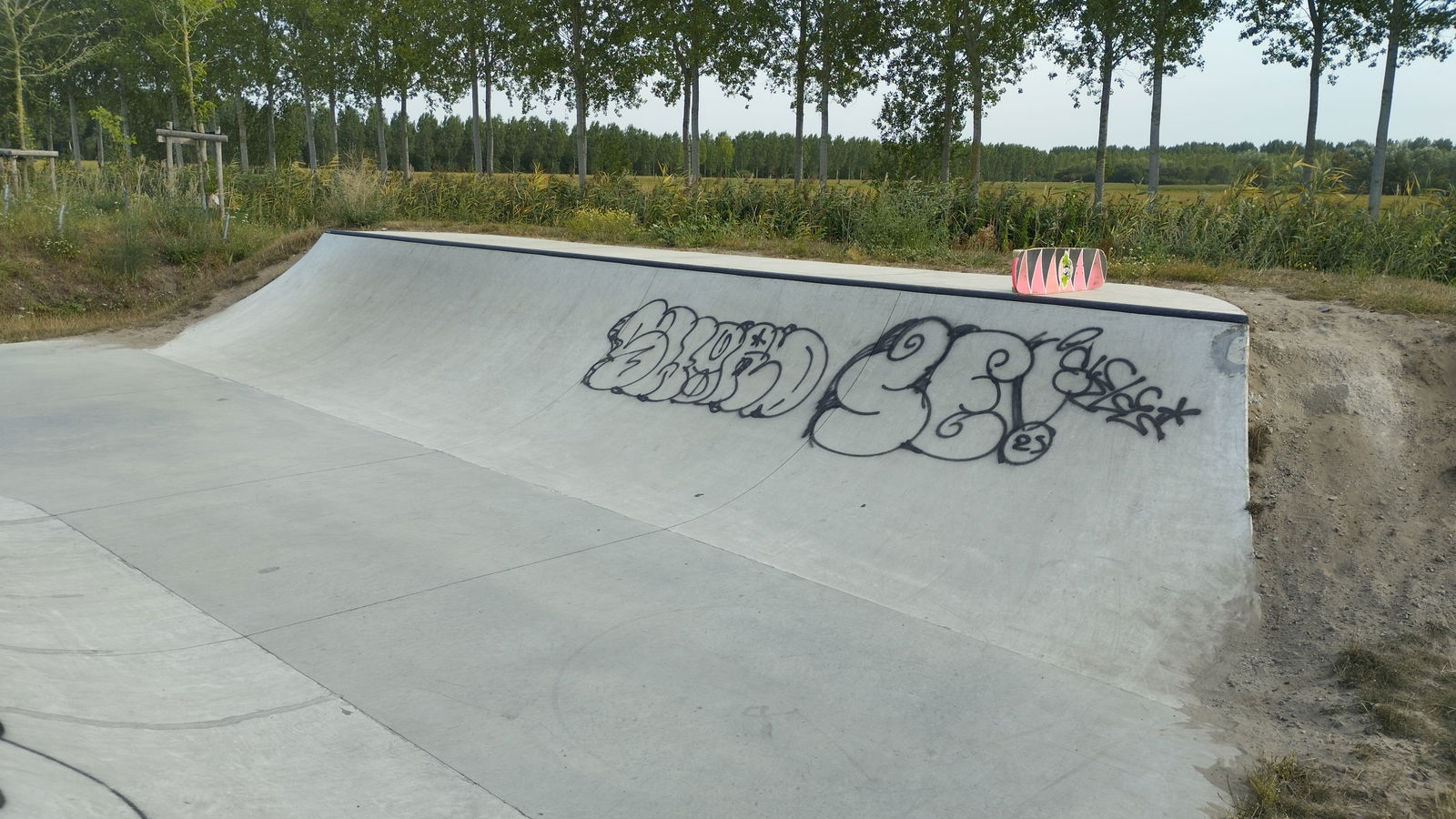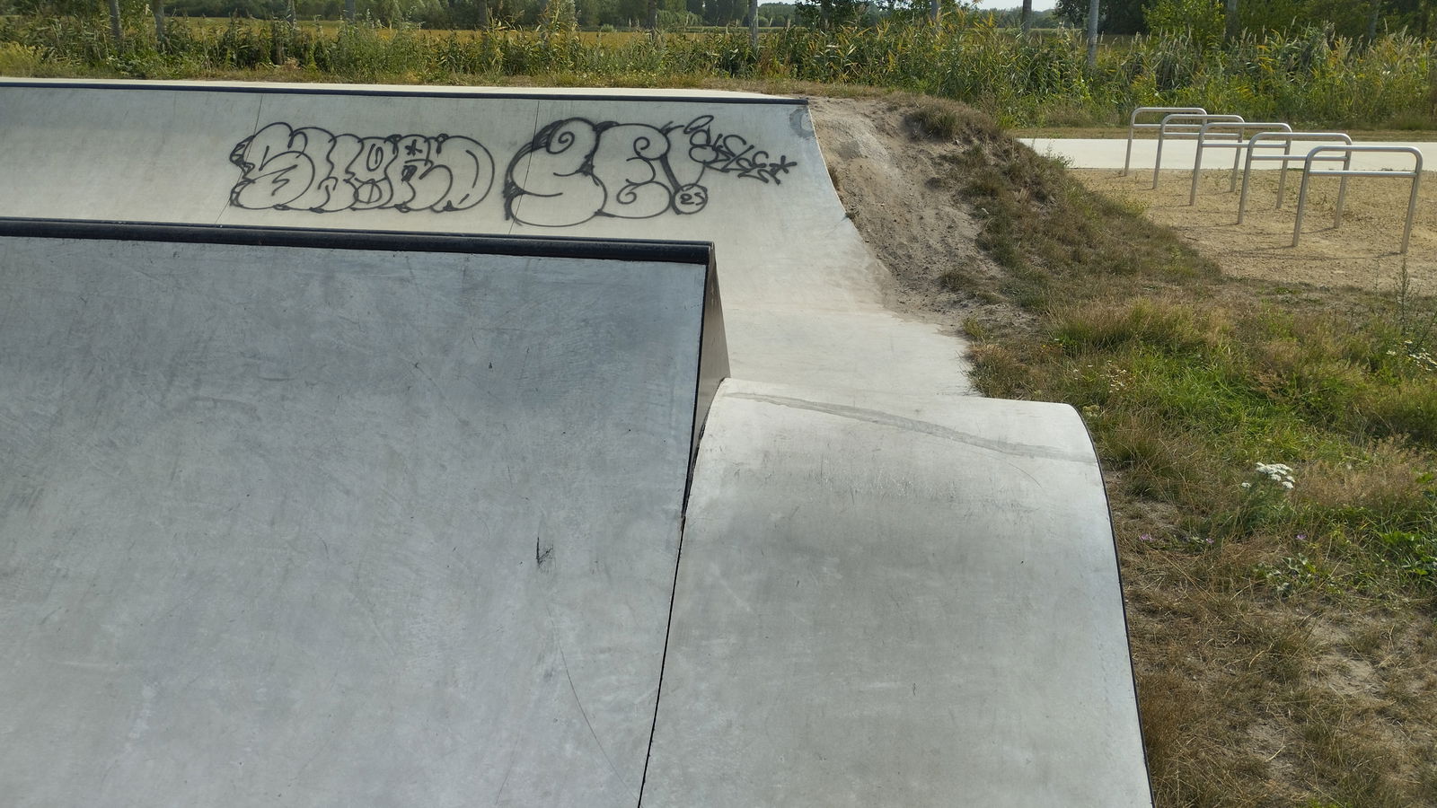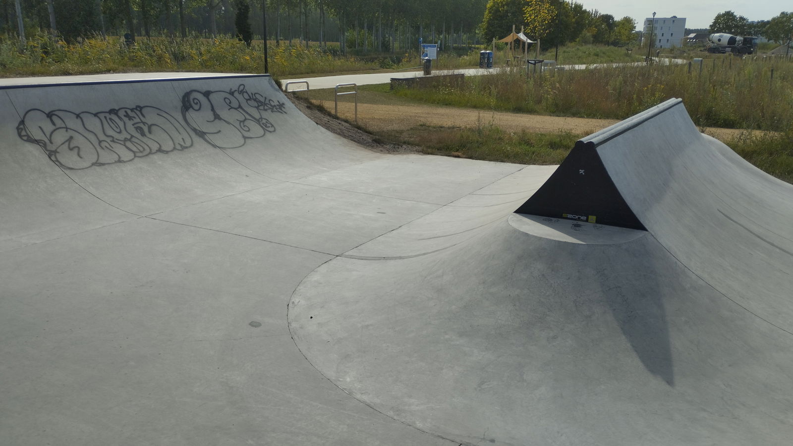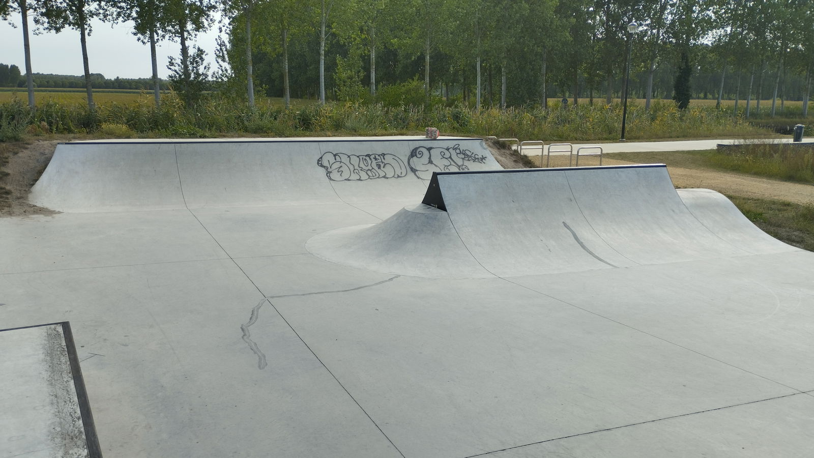 Moerbeke skatepark is a small concrete park with several street obstacles in a back and forth setup.