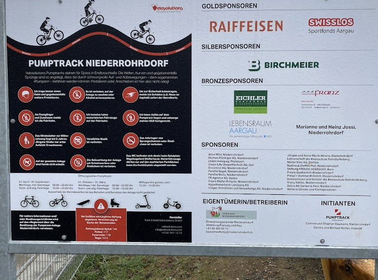 Niederrohrdorf is a municipality in the district of Baden in the canton of Aargau in Switzerland with a population of 4,225. The pumptrack in Niederrohrdorf is an asphalt bike and skateboard track built by Velosolutions in 2022.