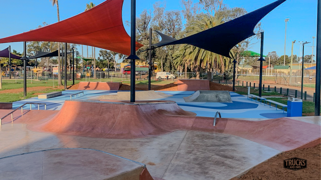 Nyngan skatepark is a concrete park designed and built by Convic skateparks. Nyngan, NSW, focused on transforming an old skatepark by recycling and extending on the existing concrete slab through the introduction of new skate features and a vibrant colour palette. Flowing around the existing shade poles new lines connect back to a covered skate area - perfect for beating the summer heat.